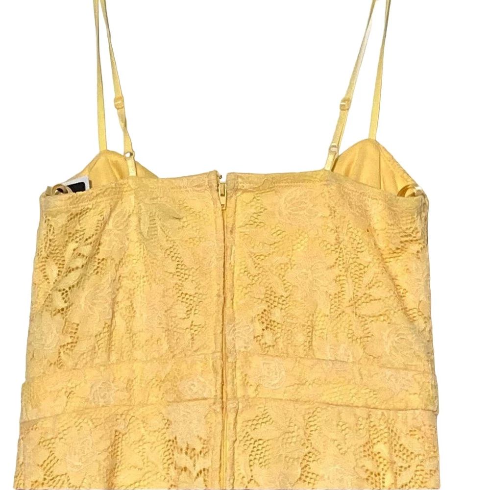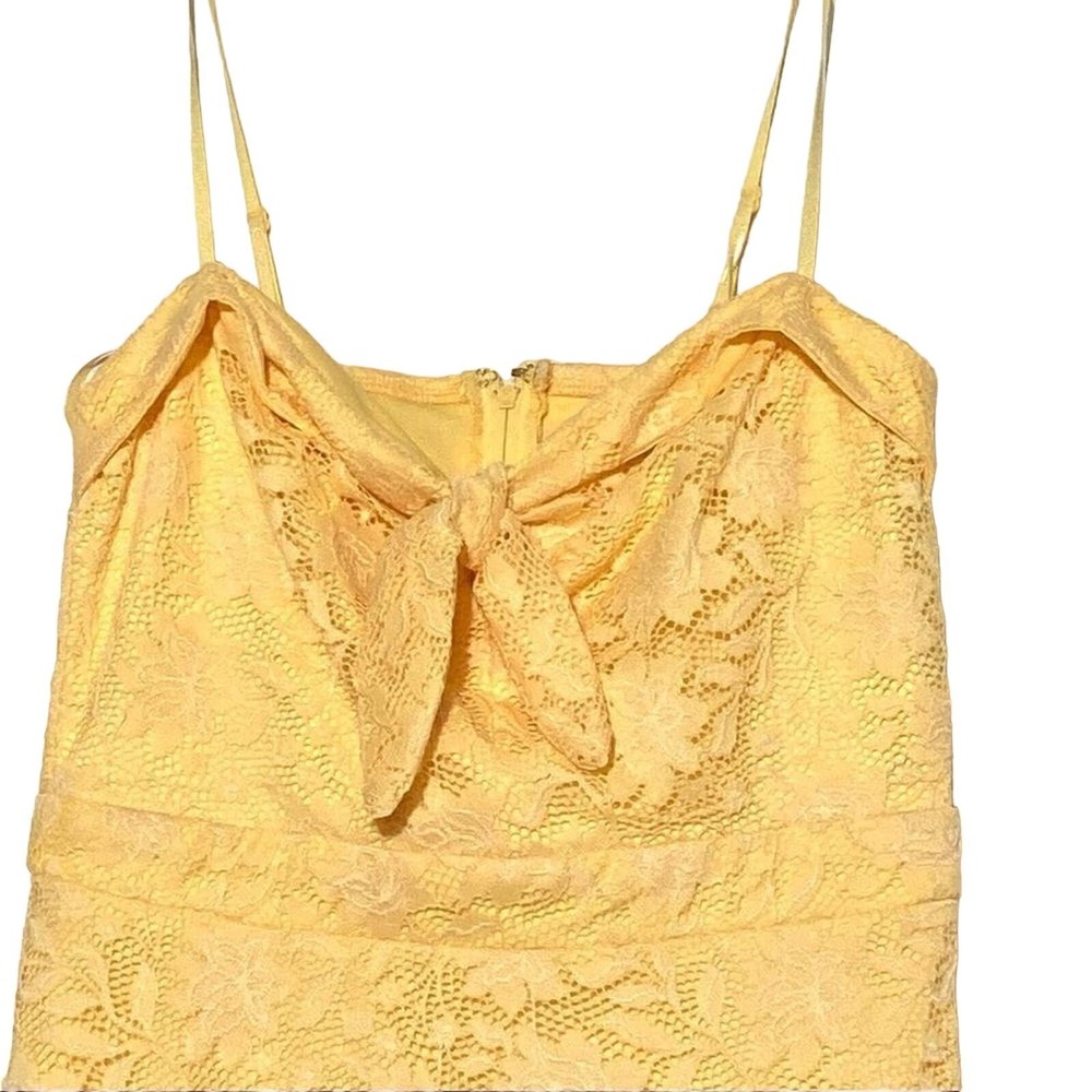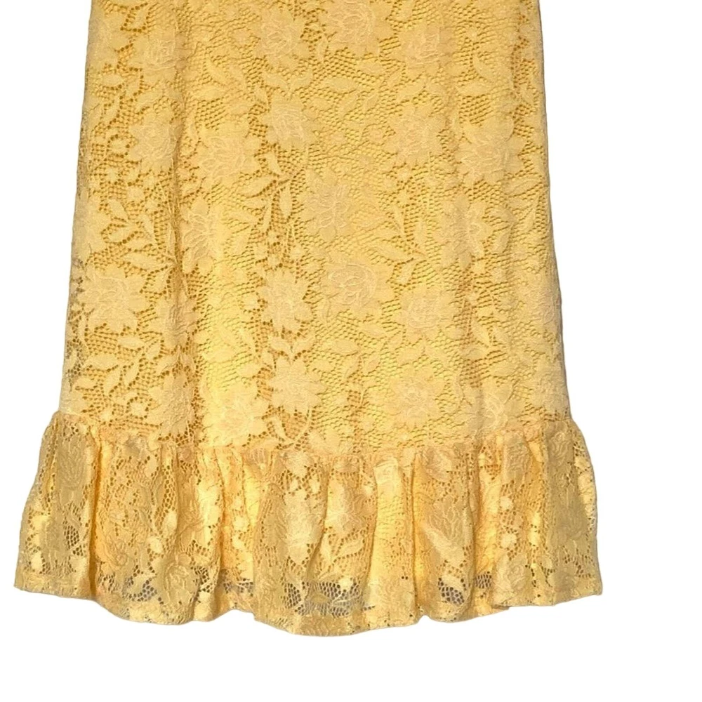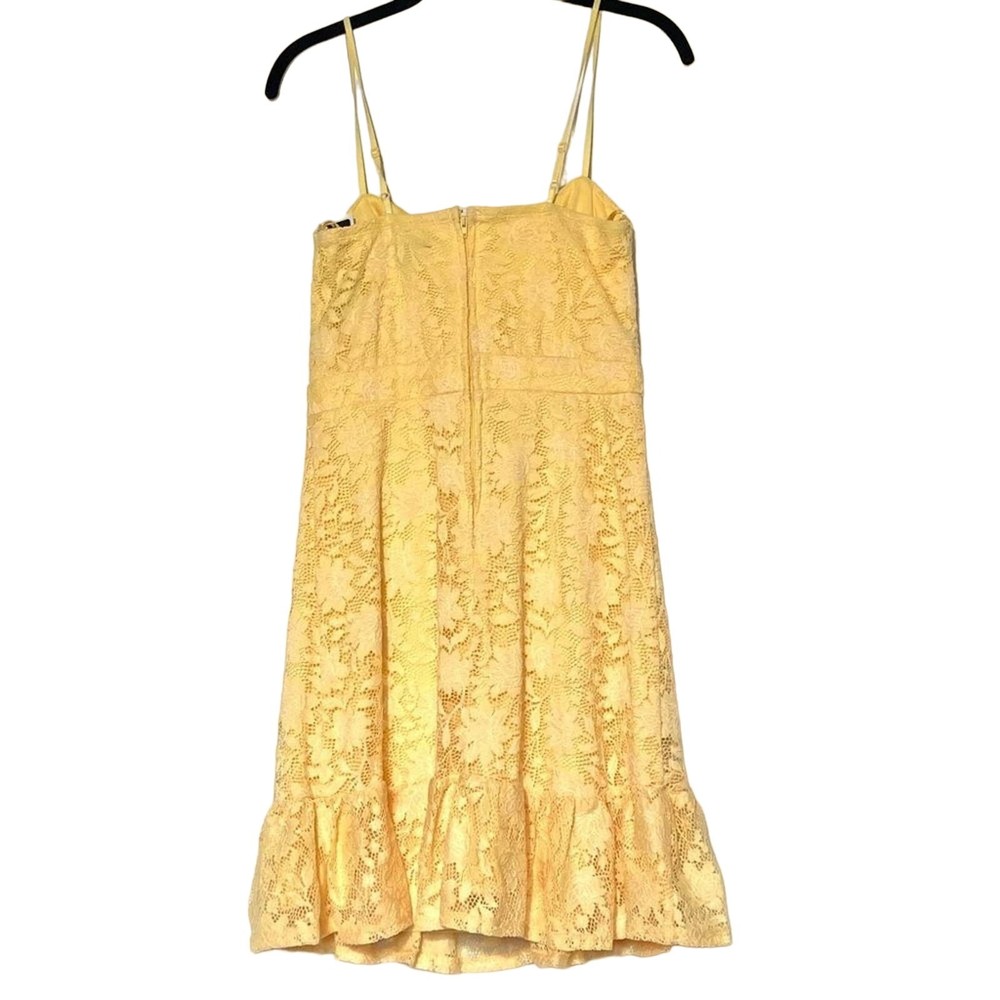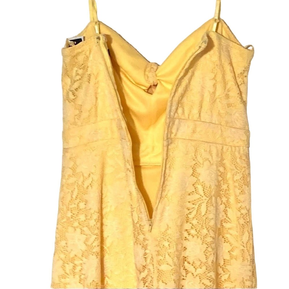 <![CDATA[<div>Keep cool during the dog days of summer in this cute lace overlay sun dress in a cheery lemon yellow. - Zips in back - Flouncy hem and front tie - Material has a slight stretch and is softer (not a heavy lace). - Polyester - NEW without tags Length: 28” not including adjustable straps Bust: 14.5” Waist: 12.5”