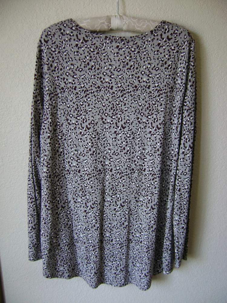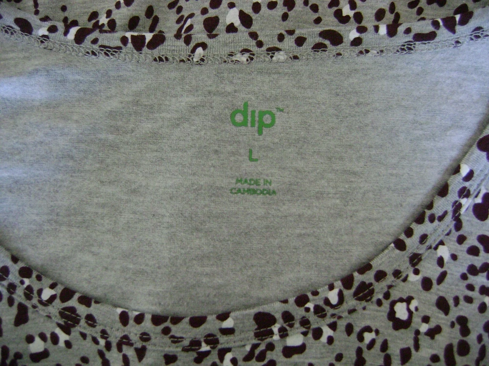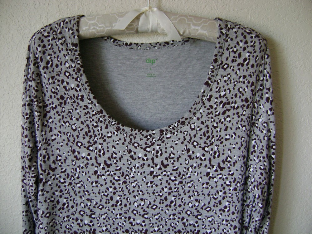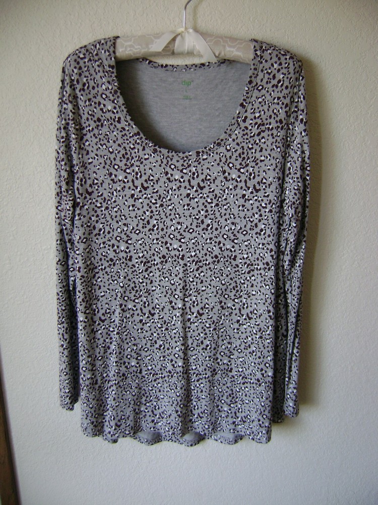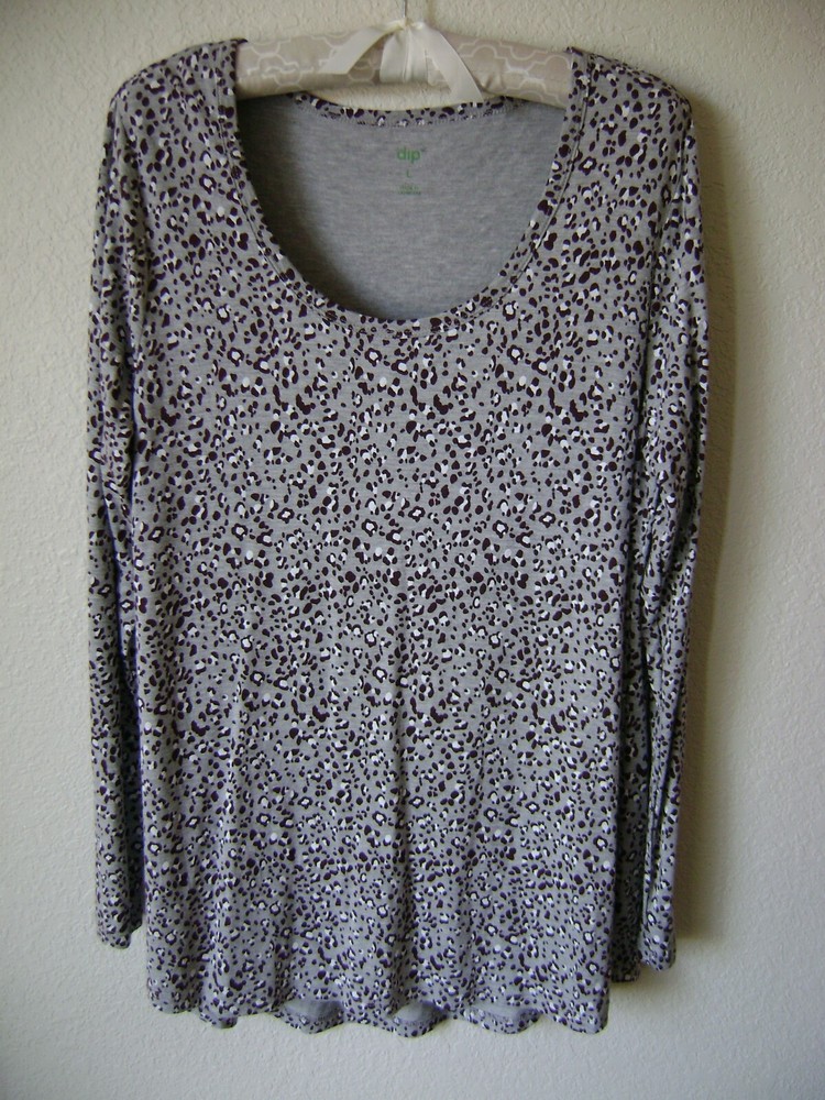 Ladies' new without tags Dip brand tunic top. Please see all photos as they are part of the description. Small leopard print in gray, brown, and white of 95% rayon, 5% spandex fine gauge knit. Features a scoop neck and long sleeves. Size L. Measures 20 inches across lying flat underarm to underarm, 23 inches across at hip, sleeve inseam 19 inches, length 30 inches shoulder to hem. Please check the measurements provided to be sure it will fit you. * I take pride in honest representation of all my items and strive for 5 star customer satisfaction. Happy customers are important to me. I offer quality merchandise at great prices! Comes from my smoke-free home. I sell to the U.S; no international shipping. Tracking # will be provided. I ship the same day or next business day. Thank you for looking! Returned item must be in the same new condition as received to qualify for a refund. Thank you.