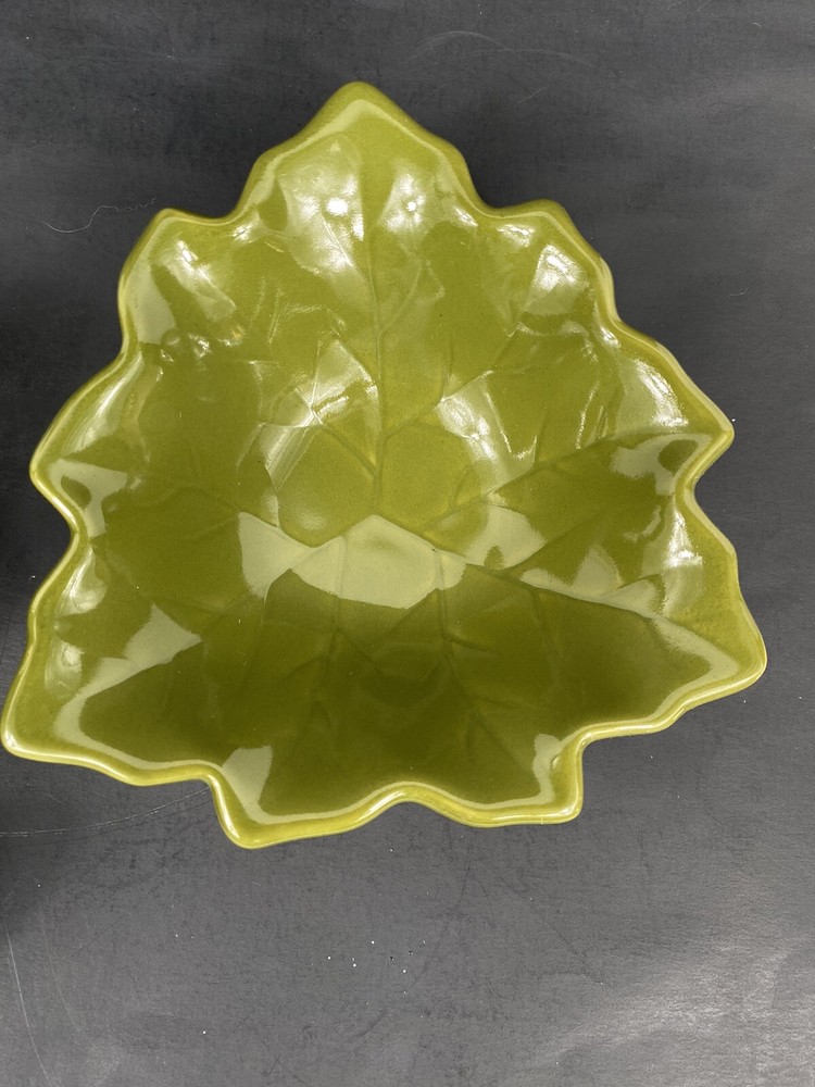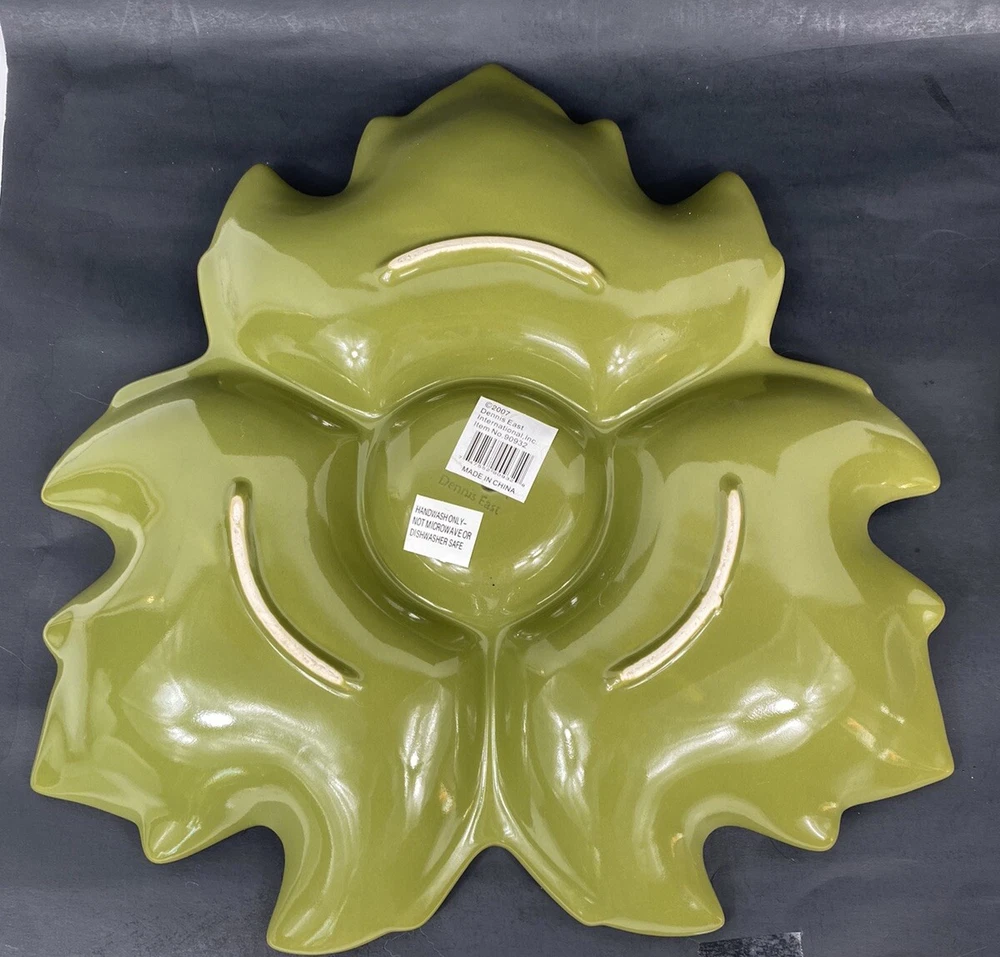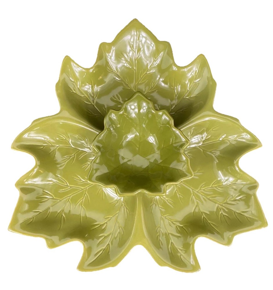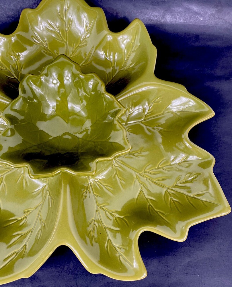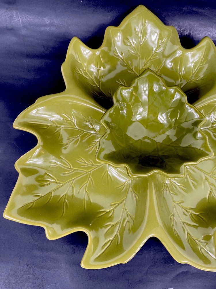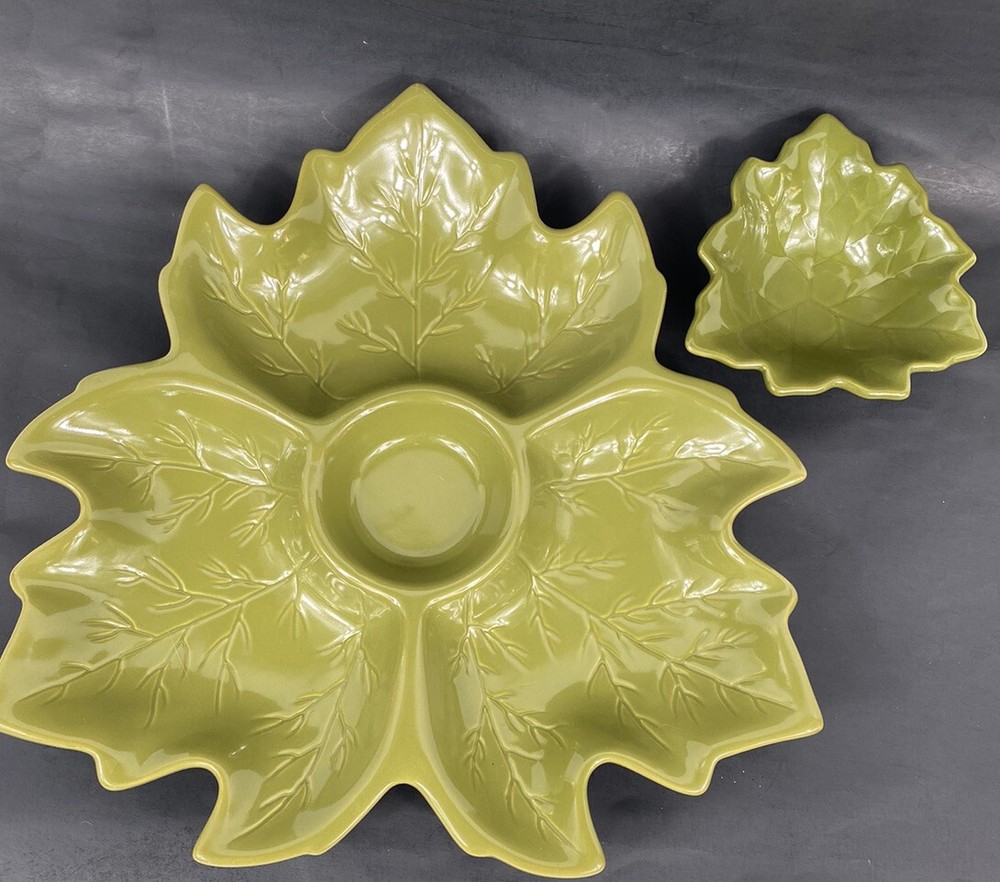 This vintage ceramic serving tray is the perfect addition to your Fall dinnerware collection. The triangle shape and green leaf pattern make it a unique and eye-catching piece. With two compartments, it's perfect for serving chips and dip or other small snacks. Crafted from high-quality ceramic, this large tray measures 13 inches in width and features a green ceramic finish. It's perfect for Fall occasions and will add a touch of retro charm to your table setting. Whether you're serving guests or just enjoying a cozy evening at home, this tray is sure to impress. This beautiful fall themed chip and dip set is in perfect condition with no chips or cracks!