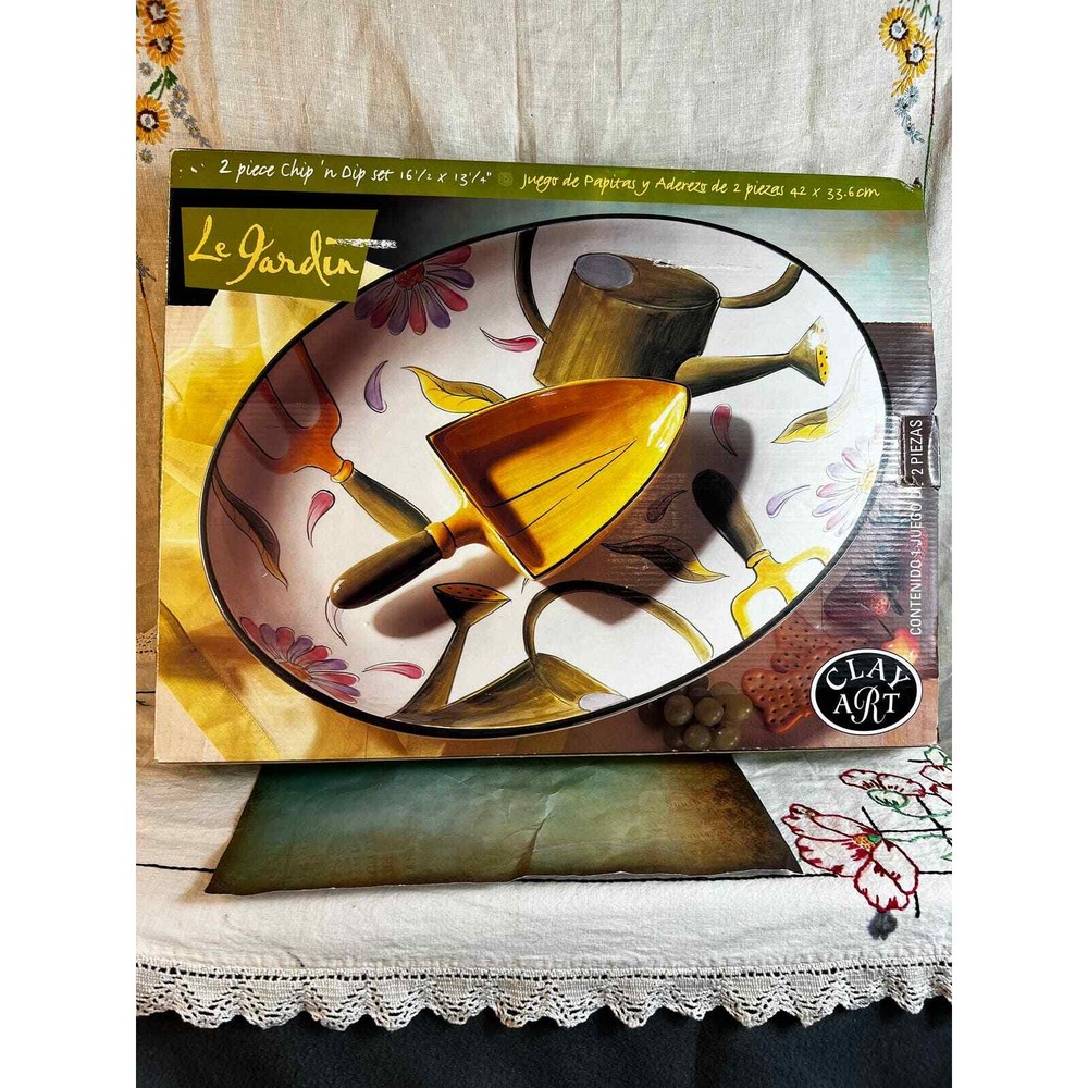 <![CDATA[<div>GARDEN LOVER! Know someone who loves gardening and plants? This is the PERFECT GIFT! NEW IN BOX Clay Art brand, Le Jardin chip and dip set. Lovely garden themed porcelain china platter for main course or dessert or even better, veggies plus spade shaped container for dipping. Perfect for in home entertaining or outside! Cheerful platter will enhance any everyday or holiday table all year round! Adorable shovel is the dip bowl. New in Box. Measures : 17” L x 13” W