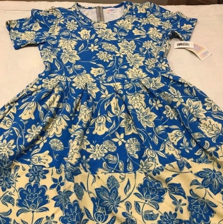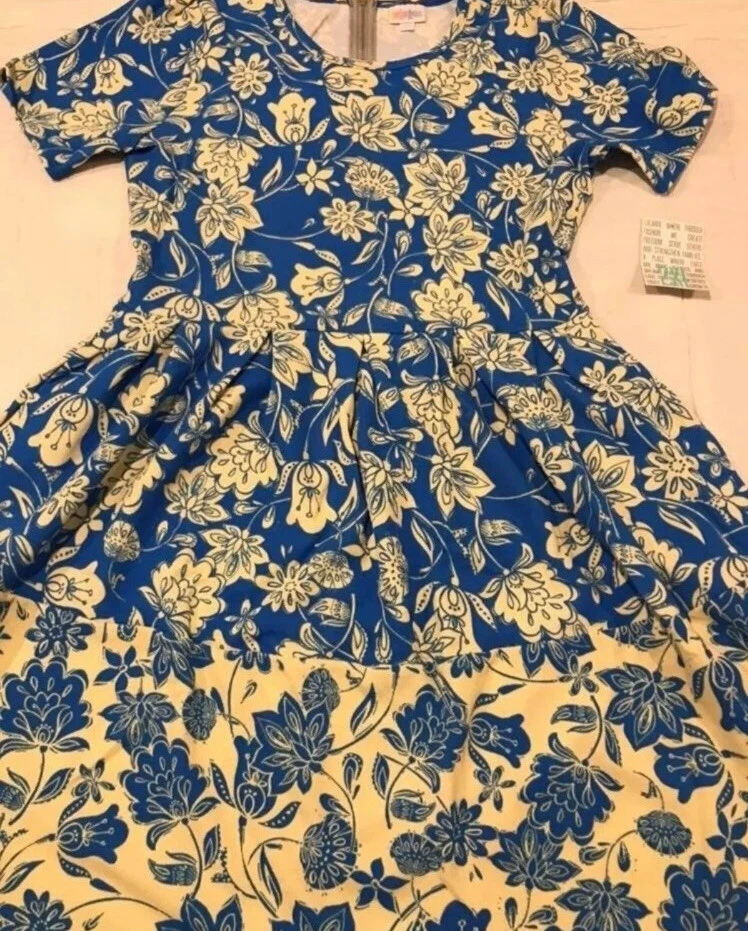 The Amelia dress' stretchy knit fabric is comfortable enough to let you wear the dress all day while having the structure and tailoring that make it sophisticated enough for the office or a fancy night out. The dress features handset box pleats, giving the dress a flowing, full skirt. And before we forget the best part, this dress also has hidden pockets! This dress is everything a girl needs. Major unicorn, rare print! Gorgeous floral Blue background with yellow ornate leaf and floral pattern New with tags! Amazing dress with pockets. Must have for your wardrobe! NEW LuLaRoe Floral Amelia Dress 🦄🌹. Fits 14-16 12-14 Large True unicorn! Condition is New with tags. Shipped with USPS 12/24A (3)