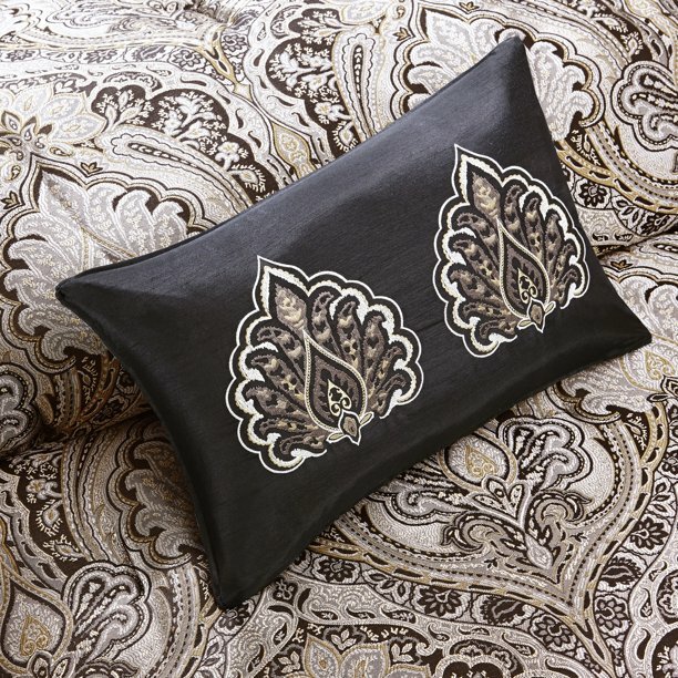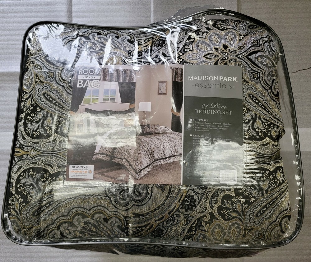 NEW MADISON PARK ESSENTIALS 24 PIECE BED COMFORTER SET, MICHELLE BLACK, CAL KING PRODUCT DESCRIPTION: DECORATE THE BEDROOM IN SOPHISTICATED AND STYLISH DAMASK BEDDING SET AND WINDOW TREATMENT TEXTURED JACQUARD WEAVE ON TOP OF THE BED AND VALANCE BLACK TAPING BORDERS ON THE COMFORTER COMFORTER/SHAM - 100% POLYESTER POLYONI, EMBROIDERED, 85GSM MICROFIBER REVERSE, 270GSM POLYESTER FILLING SET INCLUDES - 1 COMFORTER 104"W X 92" 2 KING SHAMS 20"W X 36"L 4 DECORATIVE PILLOWS 16"W X 16"L - 12"W X 18"L - 18"W X 18"L - 12"W X 16"L 1 FITTED SHEET 72"W X 84"L + 14"D 2 PILLOWCASES 20"W X 40"L 2 WINDOW VALANCE 18"W X 54"L 4 TIEBACKS 4"W X 34"L 1 BED SKIRT 72"W X 84"L +15"D 1 FLAT SHEET 108"W X 102"L 4 WINDOW CURTAINS 42"W X 84"L 2 EURO SHAMS 26"W X 26"L +2"D THANK YOU FOR LOOKING AND CHECK OUT MY OTHER LISTINGS. ~~~bidify~~~