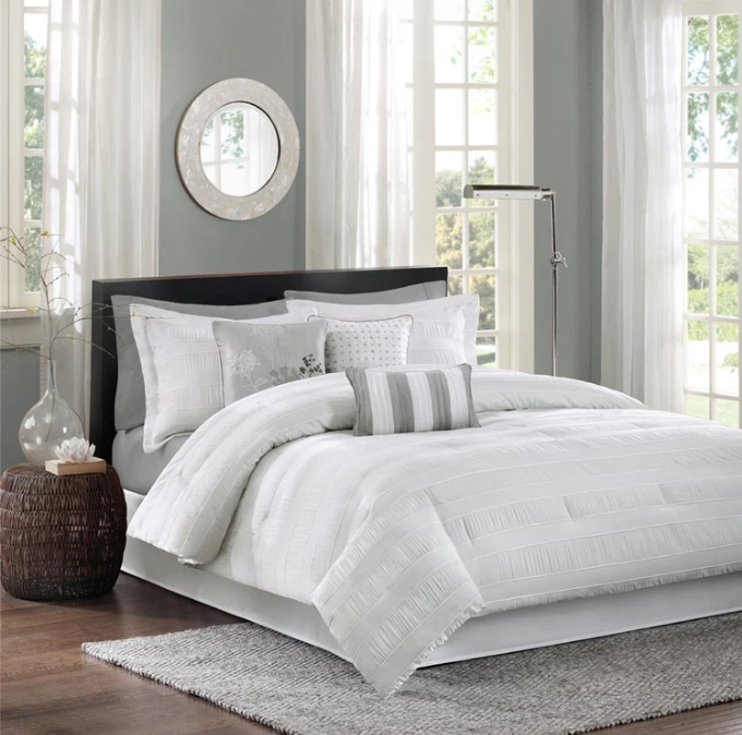 This item is a NEW, UNUSED returned item directly from Macy's Department Store. Open box with original content. The Madison Park Hampton Collection adds dimension with the use of fabric manipulation. This unique polyester jacquard fabric has a wrinkle feature that is used in a striped fashion horizontally across the comforter and shams. The bright white comforter gives a modern feel that can be easily added to any decor. Size: King Size Primary Color: White Pattern Type: Solid Set includes: king comforter (104" x 92"), king bed skirt (78" x 80" + 15"), two king shams (20" x 36") and three decorative pillows (16" x 16", 18" x 18", 12" x 18") Asian American & Pacific Islander Owned, Woman Owned Polyester Machine washable. Imported PLEASE NOTE: This is a Macy's Department Store return and comes as an open box with the original 7-piece contents. One decorative pillow cannot be repackaged into the original box due to compression as pictured but will be shipped with the original items. PLEASE READ CONDITIONS BELOW BEFORE PURCHASING: By purchasing this item, the buyer agrees to item condition as noted in the description. This product is sold AS-IS. This item may be an open box product sourced from high-end department store pallets. It may have been a customer return, store stock or display item. While it is in new condition and functions as intended, the original packaging may show signs of wear, or the item may have been repackaged. Important: All items are sold as-is with no guarantees beyond the description provided. Refunds will only be considered if the buyer provides clear photographic evidence that the item received does not match the listing description. In such cases, the buyer is responsible for return shipping costs unless otherwise agreed upon in advance. or the item may have been repackaged. Important: All items are sold as-is with no guarantees beyond the description provided. Refunds will only be considered if the buyer provides clear photographic evidence that the item received does not match the listing description. In such cases, the buyer is responsible for return shipping costs unless otherwise agreed upon in advance.