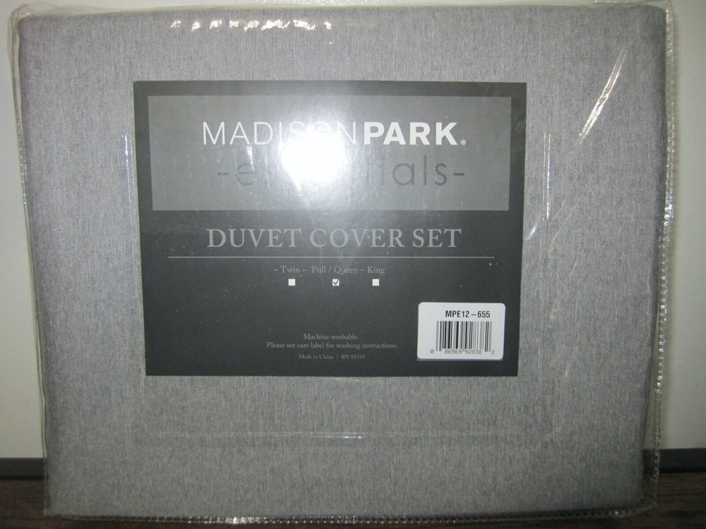 NEW Madison Park Essentials Gray Bradley Duvet Cover Set Full/Queen Size / MSRP $34.99 Makeover your bed with this modern Bradley duvet cover set. Yarn dying gives these heather-gray pieces a rich, textured look, adding a feeling of depth and dimension. Constructed from soft microfiber, this machine-washable set cleans up easily while offering a soft, smooth feel to enhance your comfort. Features: Duvet Cover has internal corner ties to prevent shifting Set Includes: One duvet cover, two matching shams Yarn dye fabric Heathered solid style Soft microfiber Comforter insert not included Face Material: Yarn dye solid microfiber Sham Closure: Zipper Full/Queen Dimensions: Duvet Cover: 90 in wide x 90 in long Standard Shams: 20 in wide x 26 in long with 2 inches flange