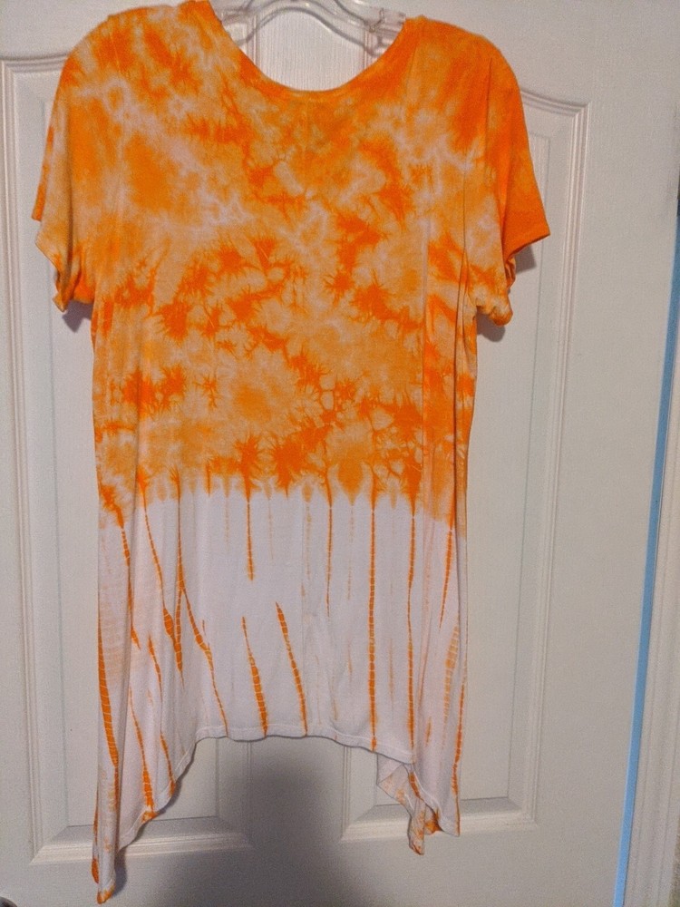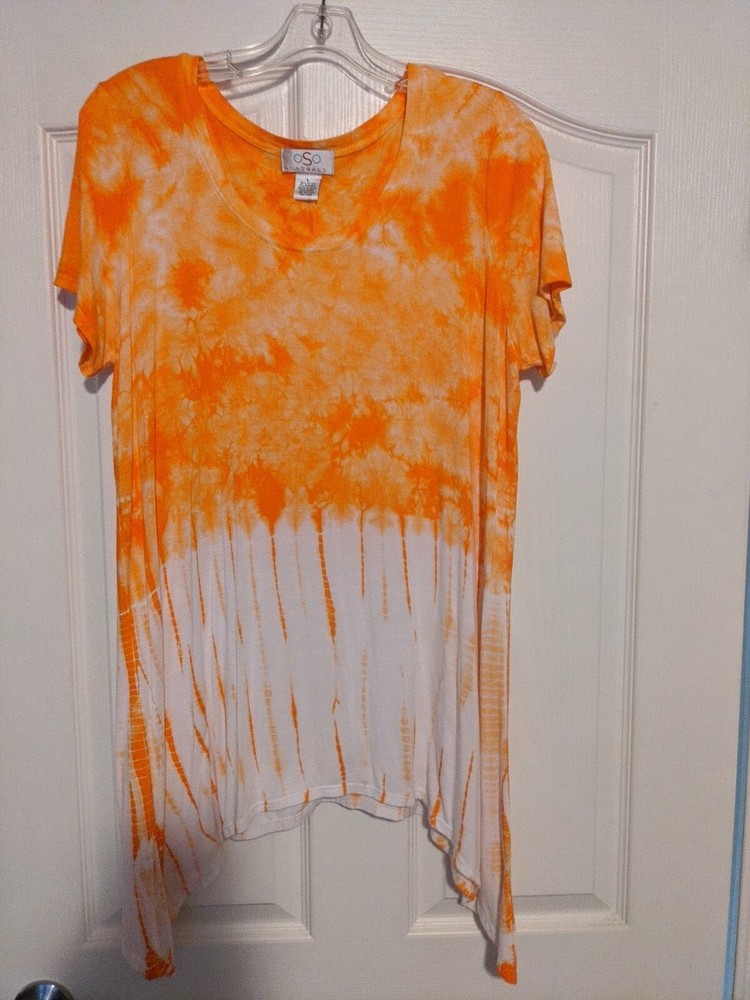 Elevate your casual wardrobe with this stunning OSO Casuals® Knit Short Sleeve Top in size L. The bright orange tie-dye pattern adds a pop of color to your outfit, while the round neckline and casual sleeves provide a comfortable fit. Crafted with a blend of polyester and rayon, this blouse features stretch fabric that ensures a flattering fit. The knit fabric type adds texture and dimension to the top, making it a great addition to your wardrobe. Perfect for any casual occasion, this OSO Casuals® top is a must-have for every fashion-savvy woman.