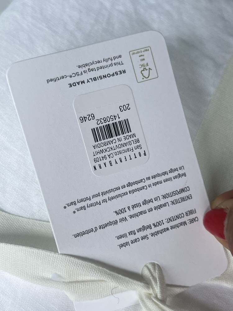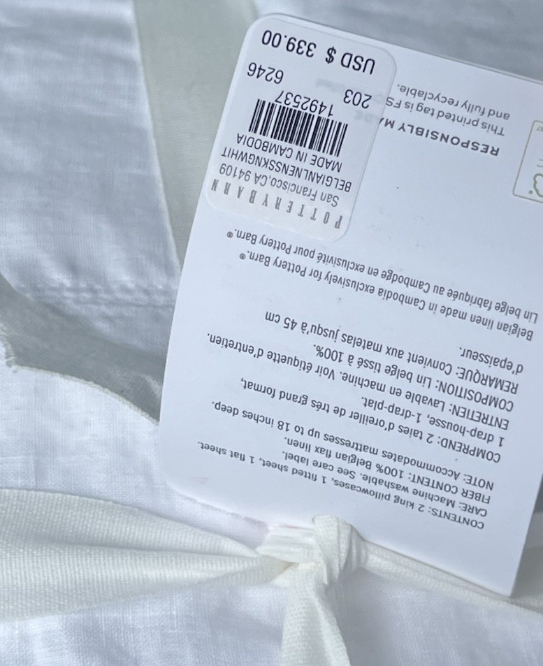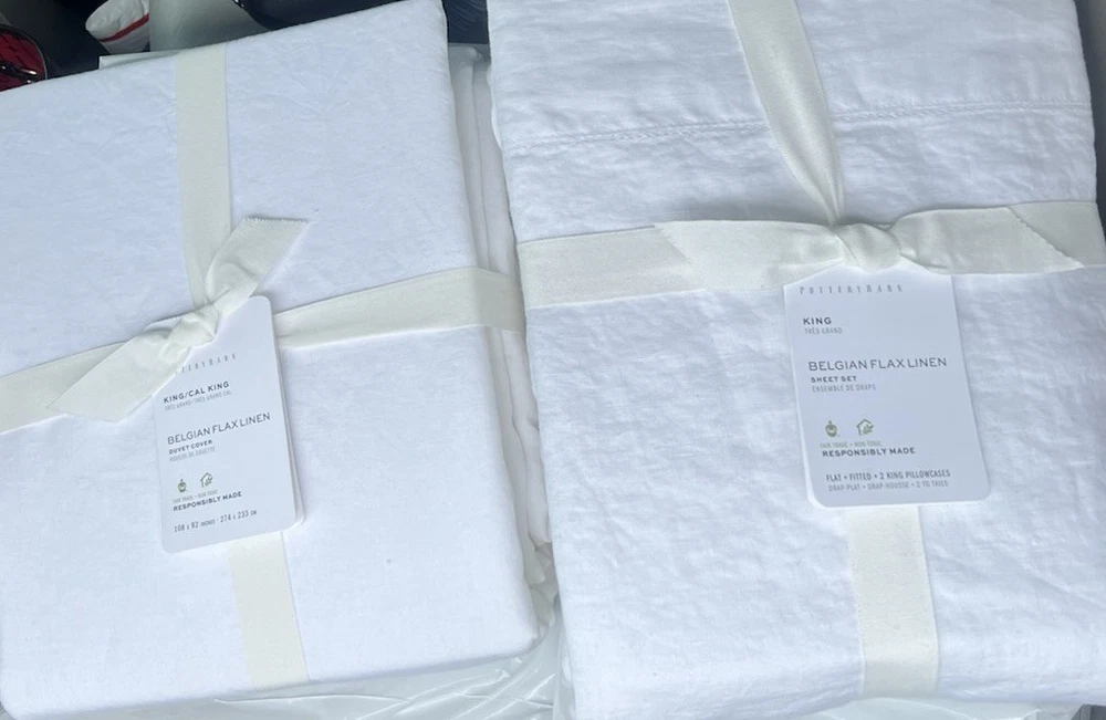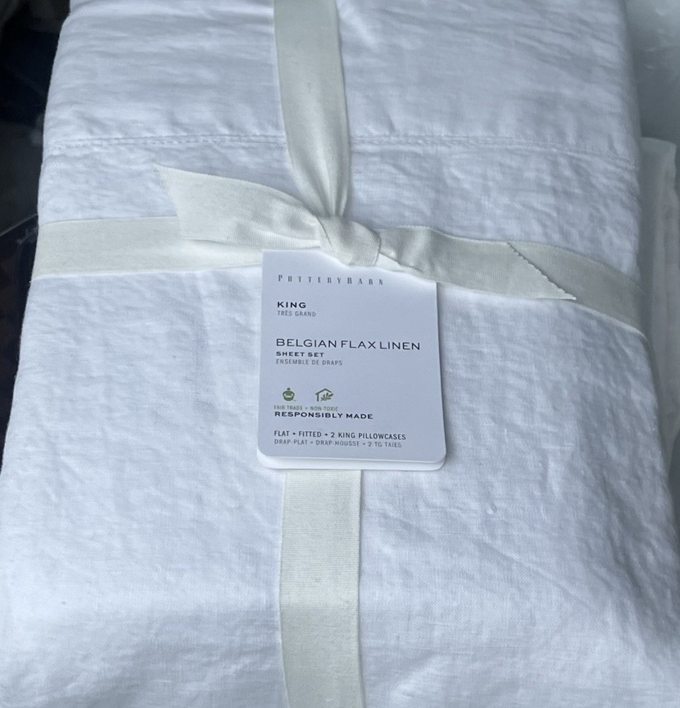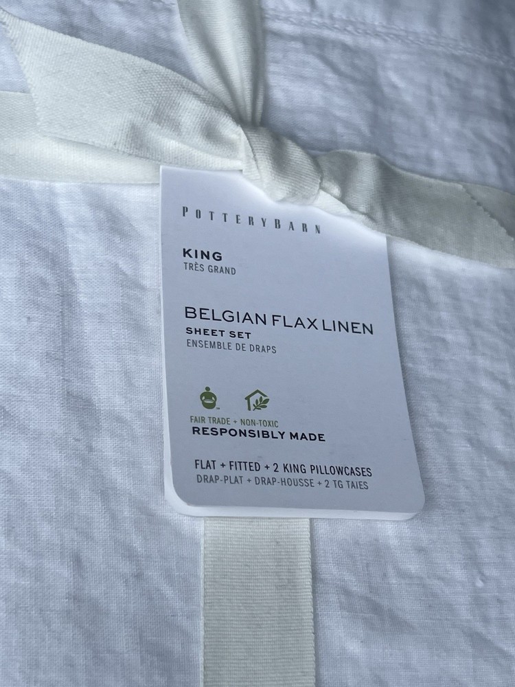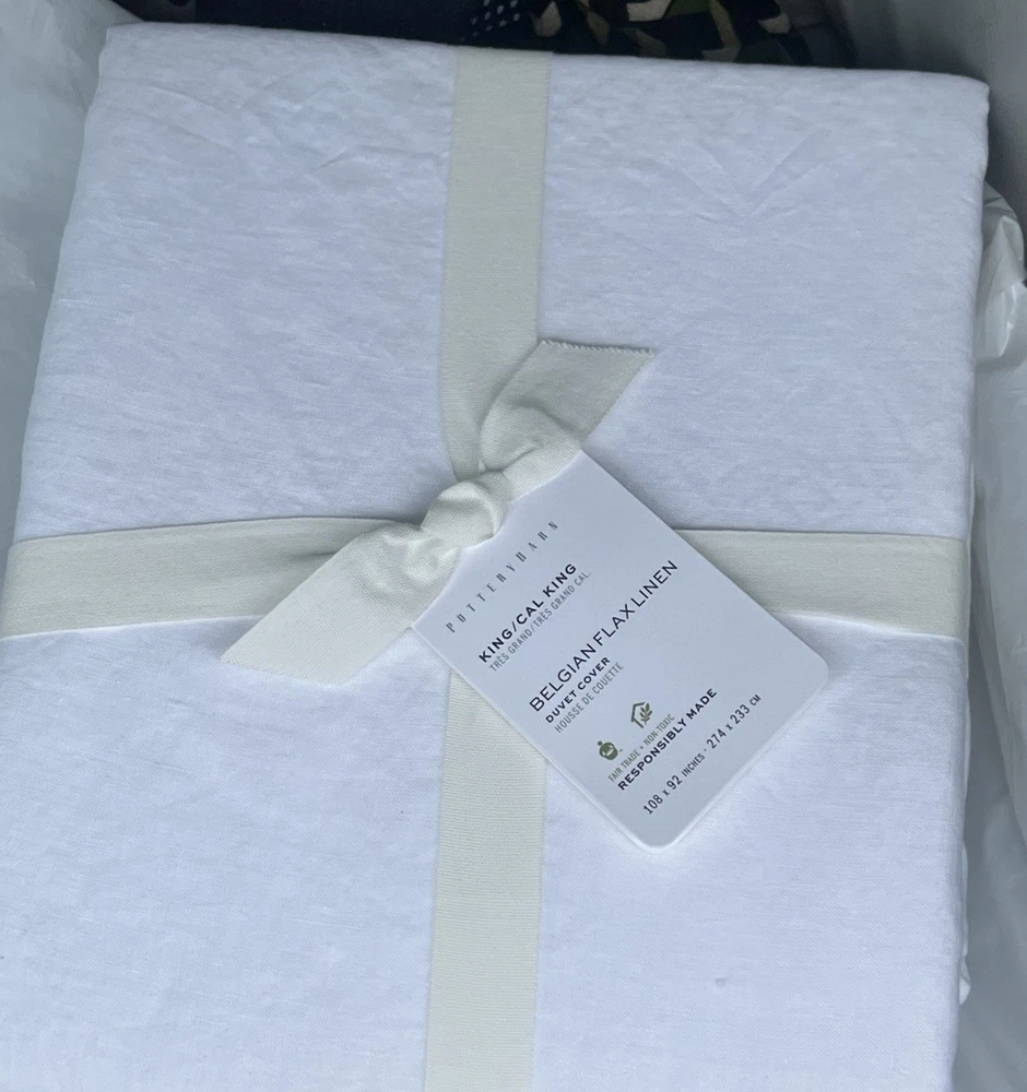 NEW POTTERY BARN Belgian Flax Linen KING Duvet & KING size Sheet set in White Elevate your bedroom decor with this luxurious Pottery Barn Belgian Flax Linen Duvet Cover and Sheet Set. Crafted from high-quality linen, this set includes a king-sized duvet cover and sheet set in a crisp white color. The solid color design is perfect for any modern or traditional bedroom setting. The duvet cover and sheet set are machine washable for easy care and feature a king size of 92 inches in length and 108 inches in width. Ideal for any bedroom, this set is sure to impress. Brand new with tag