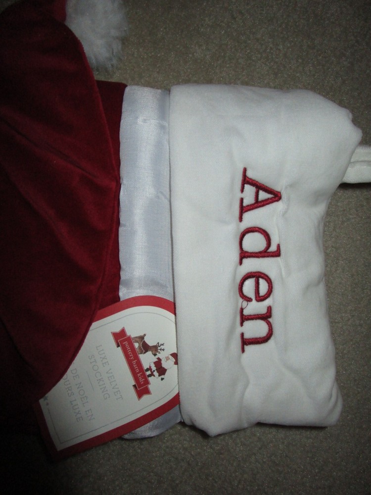 This buy it now is for a "ADEN" monogram Christmas red Santa LUXE velvet Stocking made by Pottery Barn measures 20 x 11, with original tag no problems, comes from smoke free home
