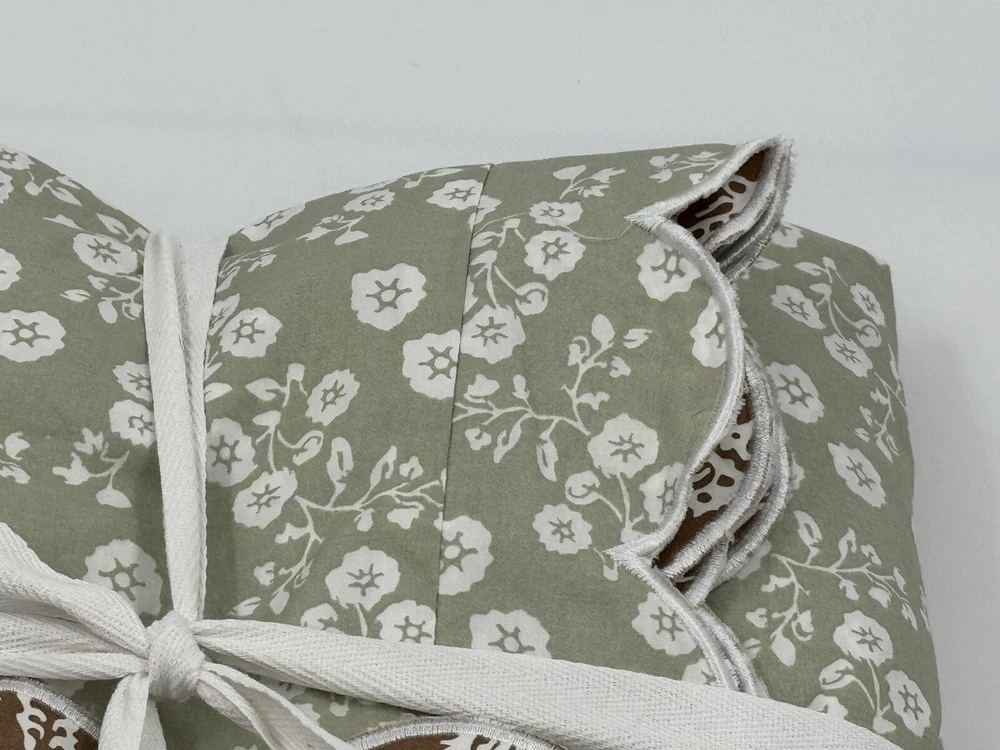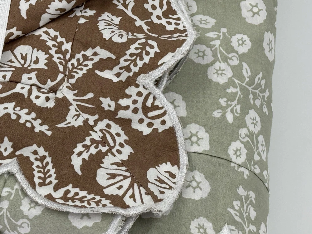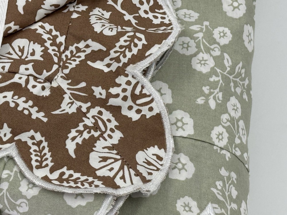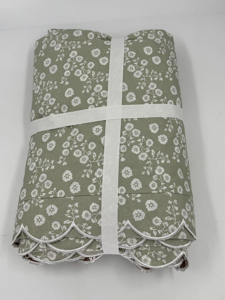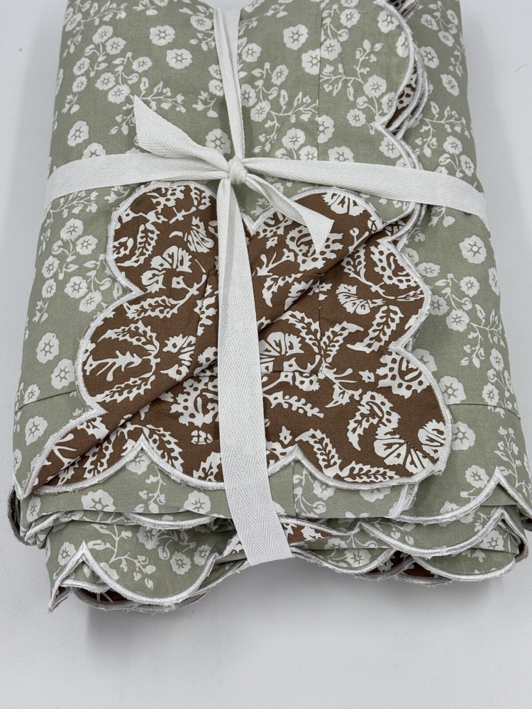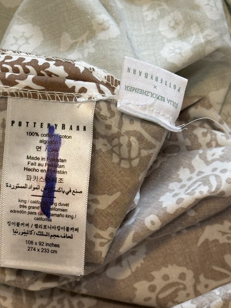 NEW POTTERY BARN Julia Berolzheimer Reversible Scalloped Green/Brown Duvet King Please note: there is a mark through the inner size tag. This is an open box item. An Open Box item does not include any original packaging. Item is unused, but may arrive slightly more wrinkled than a packaged item and/or have stray hair or fibers. Rare, discontinued style. Brown with white flowers on one side. Green with white flowers on the opposite side. Scallop border all the way around. 108x92” Material: Made from 100% cotton. Secure Design: Duvet features a zipper closure with inner ties that keep the insert in place