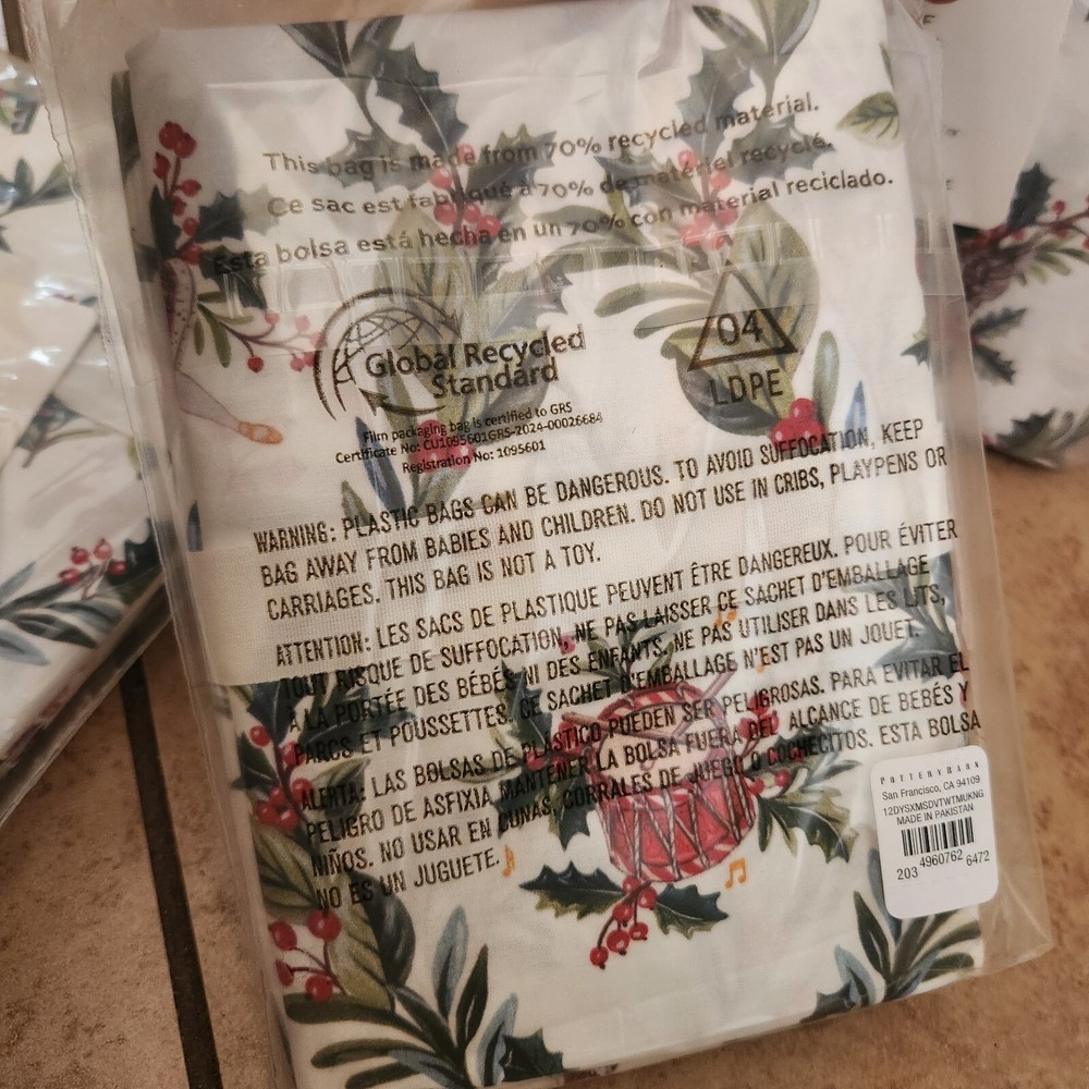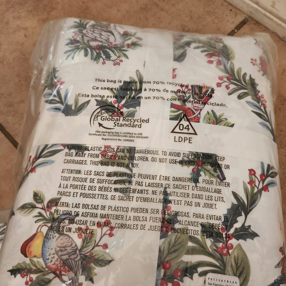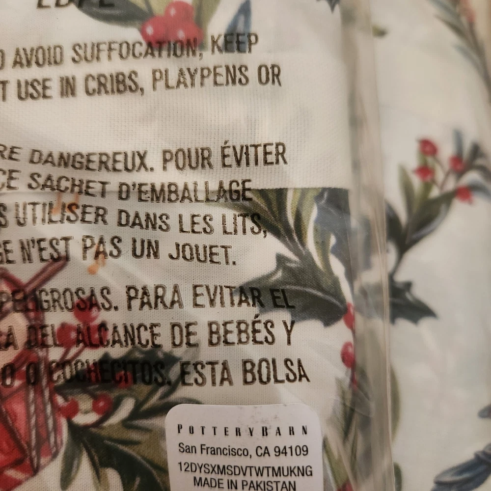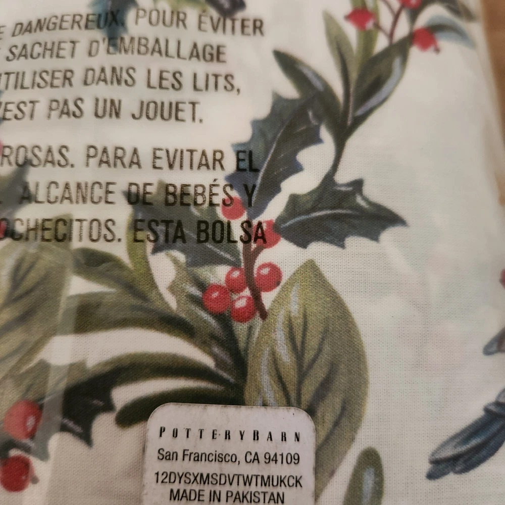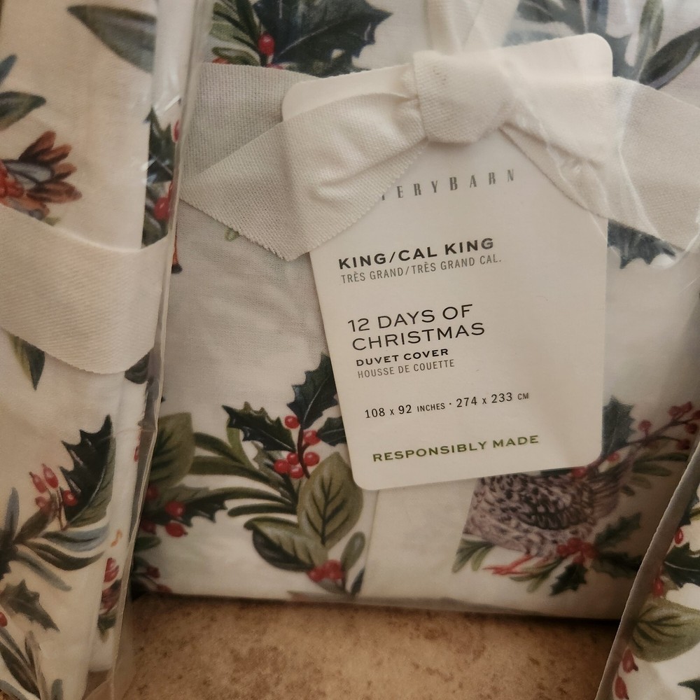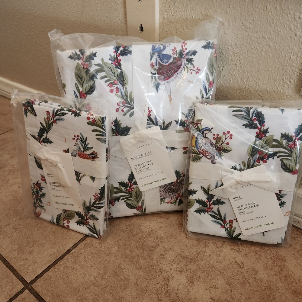 Selling a brand new Pottery Barn 12 days of Christmas King / Cal King duvet cover with 2 matching King shams. Brand new in packaging with tags. Selling as a set Come from a pet and smoke free home I have LOTS of PB treasures so please check out my other listings or inquire Overview: Cozy up to Christmas in the most festive way. From 12 drummers drumming to a partridge in a pear tree, our duvet illustrates depictions dreamed up by our in-house designers from the beloved classic carol. Seasonal shades of red and green provide a merry mix of holiday color. Details Material: Made from 100% cotton. Reverses to the same. Secure Design: Duvet features a hidden button closure with inner ties that keep insert in place; sham features an envelope closure. Certification and Standards: OEKO-TEX® STANDARD 100 certified, tested for 1000+ harmful substances (14.HUS.42449 HOHENSTEIN HTTI). By choosing our cotton products, you’re supporting our investment in Better Cotton’s mission. This product is sourced via mass balance and therefore may not contain Better Cotton. Made in a Fair Trade Certified™ factory, empowering workers who made it. Place of Manufacture: Imported. Care Instructions Machine wash in cold water separately on gentle cycle. Use only non-chlorine bleach, if needed. Tumble dry on low; remove promptly. Warm iron as needed. Dimensions King/Cal. King Duvet: 92" h x 108" w King Shams: 20" h x 36" w