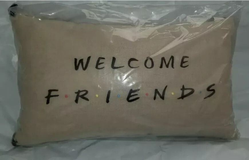 This is a NEW Pottery Barn 25th Anniversary Friends Welcome FRIENDS 12x26 Pillow featuring a Welcome Friends Embroidery design on a brown linen rectangle. The pillow is made of a cotton and linen blend with 100% polyester fill material. It is part of the Friends 25th Anniversary TV Show theme, styled after the Days of Yore, and features sewn closed closure. Care instructions advise spot cleaning.