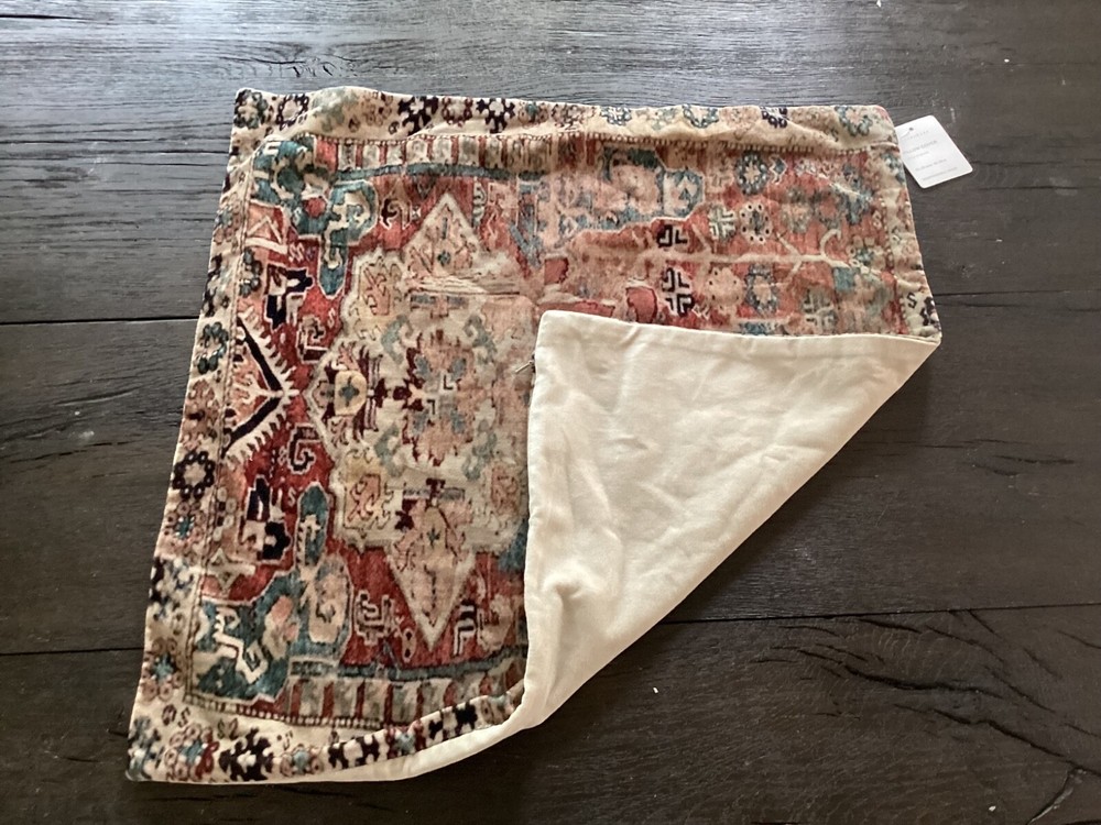New Pottery Barn Basilia Velvet Pillow cover. This comes from a smoke free and pet free home. Check out my other listings as I can combine shipping. Made of 100% cotton velvet. Reverses to solid. Zipper closure. Accommodates a 22" square insert. Sold separately. Imported. Machine wash cold; gentle cycle. Use only non-chlorine bleach when needed. Tumble dry low. Warm iron if needed. Overall: 22" square