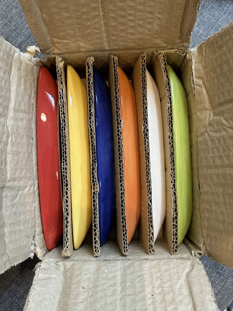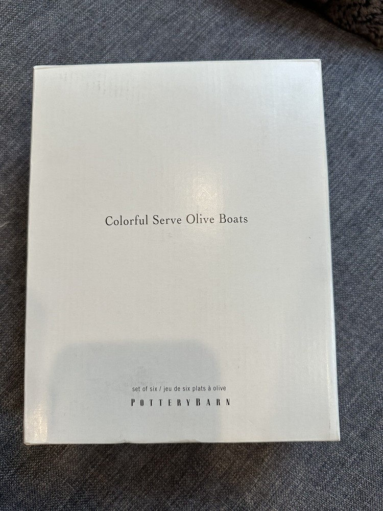 Brand new in box 2003 6 piece colorful serve Olive Boats Blue, green, white, red, orange and yellow Microwavable and dishwasher safe...