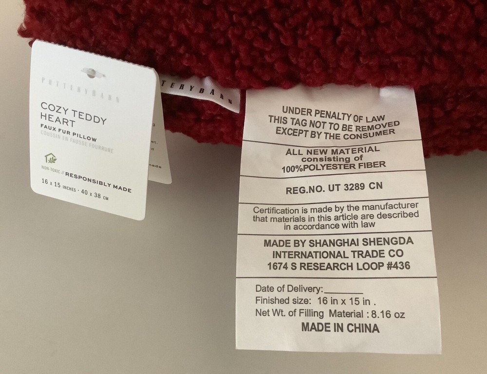 Pottery Barn Soft and Cozy Teddy Faux Fur Heart Pillow New with Tags in Original Package This texture-rich heart pillow was designed in-house and sewn of our cuddly teddy fabric, it makes a sweet addition to a sofa or bed and makes a heartfelt gift for a special someone on any occasion. Color: Cardinal Red Overall : 16" w x 15" h Made of 100% polyester. Spot clean. Imported . Fast shipping from a smoke-free, pet-free home. Thank you for looking. Feedback from Buyers: * "The seller could not have made it any easier to make a purchase. The communication concerning the status of shipping and any follow up questions was quickly answered. This is what real customer service feels like. I would purchase from this seller again!" * "So so sorry for the belated feedback. This was the best seller I have ever encountered on eBay or anywhere for that matter, so kind, thoughtful, personable, accommodating. Went out of her way to get me the items even faster than ASAP w/out upcharge. Everything was pristine, beyond perfect, impeccably wrapped, I am so grateful and was thrilled to have the items needed for my first post COVID dinner party. She is a model for all sellers, her customer service is beyond compare, incredible actually."