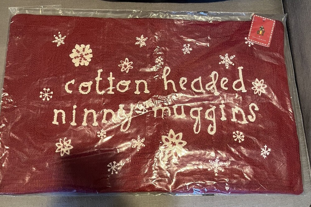 New Sealed Pottery Barn pillow cover. Sold out! Made of a 100% cotton sheeting. Reverses to a solid Red. Embroidered with cotton headed ninny muggins and snowflakes on front....