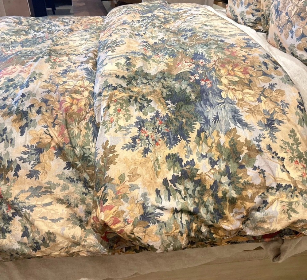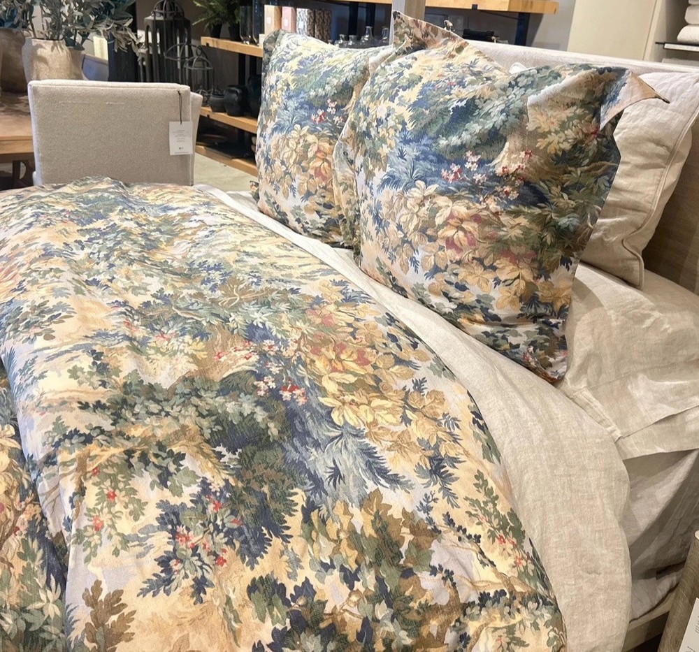 NEW Pottery Barn GREENWOOD Percale King/Cal King Duvet & 2 Euro Shams Multicolor This is a NEW Pottery Barn GREENWOOD Percale King/Cal King Duvet & 2 Euro Shams in multicolor. It is a duvet cover set designed for a bedroom, specifically for a King-sized bed. The model is Pottery Barn GREENWOOD.