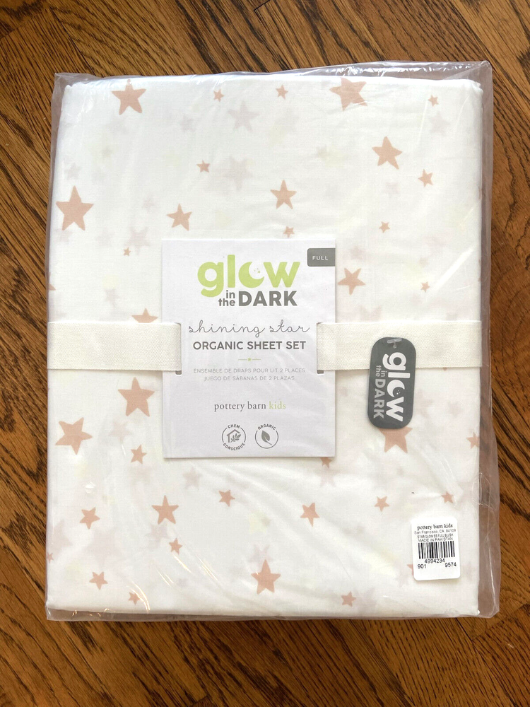 NEW Pottery Barn Kids FULL Organic Glow in Dark Shining Star Blush Sheet Set NWT Description from Pottery Barn Kids Made of star quality, our enchanting Shining Star Glow Duvet boats glow-in-the-dark stars for an extra pop of fun to bedtime. It's crafted from pure organic cotton so it's supersoft and cozy. DETAILS THAT MATTER Made of 100% cotton. Sheets softly glow in the dark. Glow-in-the-dark treatment needs to “charge” under bright light for approximately half an hour to glow properly. Glow lasts for approximately three to four hours. The Glow effect will become weaker over time because of the constant rubbing and washing. OEKO-TEX® STANDARD 100: tested for 1000+ harmful substances to keep you and your family safe. 21.HUS.86232 HOHENSTEIN HTTI. KEY PRODUCT POINTS Pottery Barn Kids exclusive. 200-thread count. Pillowcases have inside flap to keep pillows from slipping. Fitted sheet has universal elastic (elastic around the entire edge) for a snug, secure fit. Machine wash. Imported. Full Fitted Sheet: 54" wide x 75" long; fits mattresses up to 16" deep Flat Sheet: 90" wide x 96" long Pillowcase (2): 30" wide x 20" high CARE Wash before first use. Machine wash per guidelines; gentle cycle. Use only non-chlorine bleach, if needed. Tumble dry on low heat. Warm iron as needed.