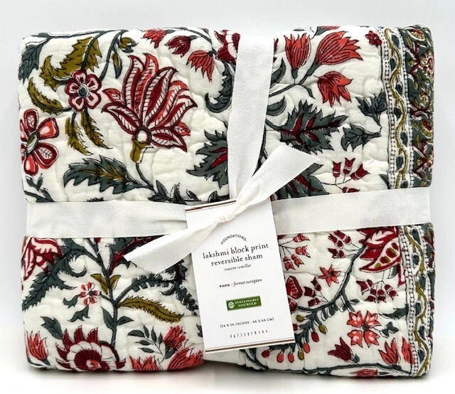 NEW Pottery Barn Lakshmi Block Print Reversible EURO Sham Red White Green New with tags Multicolor Made of 100% cotton voile with a 100% cotton fill. Sham features an envelope closure. Reverses to a printed design. Size: Euro 26 x 26 inches