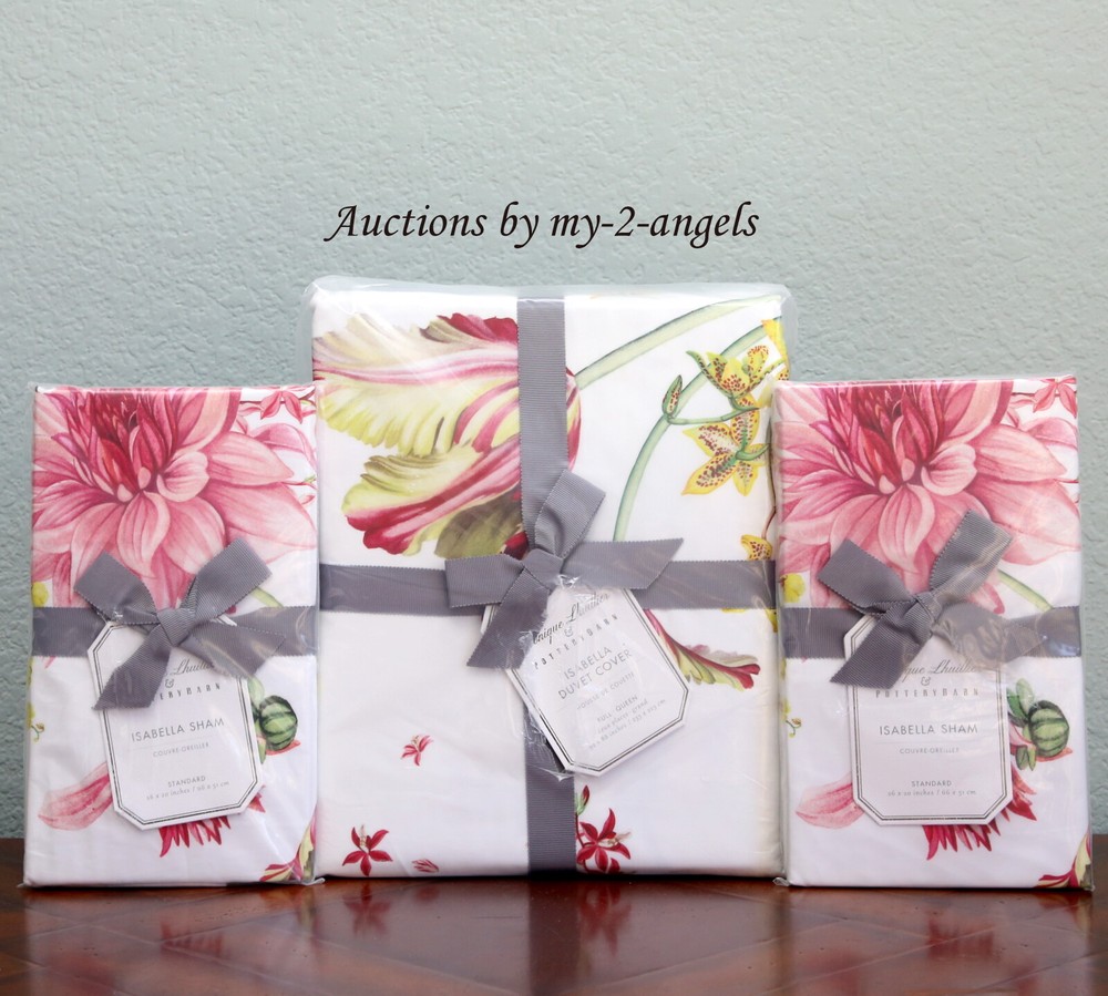 NEW POTTERY BARN MONIQUE LHUILLIER ISABELLA FLORAL ORGANIC COTTON FULL/QUEEN DUVET COVER SET - The duvet cover set includes (1) a F/Q Duvet Cover, and (2) TWO Standard Shams. All items are **BRAND NEW IN PACKAGES**, and have never been used. A hand-painted floral artwork is brought to life in this romantic bedding. The Isabella Duvet Cover & Sham mixes beautifully with solid shams in coordinating hues for a garden-like look. Fashion designer Monique Lhuillier brings her sophisticated style in this bedding for Pottery Barn. Woven of 100% organic cotton. Oeko-Tex® certified. 200 thread count. Machine wash. Duvet: 88" long x 92" wide; Shams: 20" high x 26" wide. All from our smoke-free, pet-free home. Please click the Read More link or Item Description link for more details NEW POTTERY BARN MONIQUE LHUILLIER ISABELLA FLORAL ORGANIC COTTON FULL/QUEEN DUVET COVER + 2 STANDARD SHAMS You are bidding on a beautiful, Monique Lhuillier Isabella Floral Full/Queen Duvet Cover Set, from Pottery Barn. All items are BRAND NEW IN PACKAGES . The duvet set includes: a Full/Queen Size, Isabella Floral Duvet Cover, and TWO Standard Size, Isabella Floral Shams. A hand-painted floral artwork is brought to life in this romantic bedding. The Isabella Duvet Cover & Sham mixes beautifully with solid shams in coordinating hues for a garden-like look. Fashion designer Monique Lhuillier brings her sophisticated style in this bedding for Pottery Barn. Woven of 100% organic cotton; Organic cotton is grown without the use of toxic and persistent pesticides and synthetic fertilizers. GOTS certified. Oeko-Tex® certified, the definitive mark of excellence for products that are healthy for you and healthy for the environment. Duvet and shams reverse to solid. Duvet features a hidden button closure with inner ties that keep insert in place; sham features an envelope closure. Duvet, shams and inserts sold separately; inserts not included. 200 thread count. Machine wash. Imported. Dimensions Duvet Full/Queen: 88" long x 92" wide King/Cal. King: 92" long x 108" wide Sham Standard: 20" high x 26" wide Euro: 26" square King: 20" high x 36" wide Flange: 2" wide Care and Maintenance Machine wash in warm water; gentle cycle. Use only non-chlorine bleach, if needed. Tumble dry on low heat; remove promptly. Warm iron as needed. Buyer pays shipping to a physical address within the continental United States. Please email us for a shipping quote for shipping to PO Boxes, APO/FPO Boxes, Alaska, or Hawaii. Thanks for viewing our auction! Terms and Conditions: We are not affiliated with Williams-Sonoma, or its affiliates. Although we guarantee that all our items are authentic, they are not warranted by the manufacturer and cannot be returned, exchanged or refunded by Pottery Barn. For Paypal users, we ship only to the confirmed address. Please read the description carefully to make sure that you understand what are being auctioned. The picture(s) might include other items, but only the item(s) stated in the description are included in the auction. Unless you have made arrangements with us prior to bidding, we do not ship to P.O. Boxes, APO Boxes, Alaska, or Hawaii. Please ask all questions, including shipping terms, prior to bidding. No returns on seasonal or holiday items.