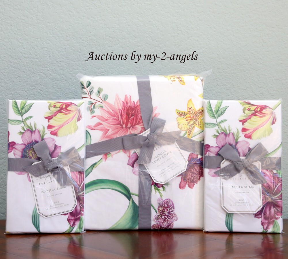 NEW POTTERY BARN MONIQUE LHUILLIER ISABELLA FLORAL ORGANIC COTTON KING DUVET COVER SET - The duvet cover set includes (1) a King Duvet Cover, and (2) TWO Euro Shams. All items are **BRAND NEW IN PACKAGES**, and have never been used. A hand-painted floral artwork is brought to life in this romantic bedding. The Isabella Duvet Cover & Sham mixes beautifully with solid shams in coordinating hues for a garden-like look. Fashion designer Monique Lhuillier brings her sophisticated style in this bedding for Pottery Barn. Woven of 100% organic cotton. Oeko-Tex® certified. 200 thread count. Machine wash. Duvet: 92" long x 108" wide; Shams: 26" square. All from our smoke-free, pet-free home. Please click the Read More link or Item Description link for more details NEW POTTERY BARN MONIQUE LHUILLIER ISABELLA FLORAL ORGANIC COTTON KING DUVET COVER + 2 EURO SHAMS You are bidding on a beautiful, Monique Lhuillier Isabella Floral King Duvet Cover Set, from Pottery Barn. All items are BRAND NEW IN PACKAGES . The duvet set includes: a King Size, Isabella Floral Duvet Cover, and TWO Euro Size, Isabella Floral Shams. A hand-painted floral artwork is brought to life in this romantic bedding. The Isabella Duvet Cover & Sham mixes beautifully with solid shams in coordinating hues for a garden-like look. Fashion designer Monique Lhuillier brings her sophisticated style in this bedding for Pottery Barn. Woven of 100% organic cotton; Organic cotton is grown without the use of toxic and persistent pesticides and synthetic fertilizers. GOTS certified. Oeko-Tex® certified, the definitive mark of excellence for products that are healthy for you and healthy for the environment. Duvet and shams reverse to solid. Duvet features a hidden button closure with inner ties that keep insert in place; sham features an envelope closure. Duvet, shams and inserts sold separately; inserts not included. 200 thread count. Machine wash. Imported. Dimensions Duvet Full/Queen: 88" long x 92" wide King/Cal. King: 92" long x 108" wide Sham Standard: 20" high x 26" wide Euro: 26" square King: 20" high x 36" wide Flange: 2" wide Care and Maintenance Machine wash in warm water; gentle cycle. Use only non-chlorine bleach, if needed. Tumble dry on low heat; remove promptly. Warm iron as needed. Buyer pays shipping to a physical address within the continental United States. Please email us for a shipping quote for shipping to PO Boxes, APO/FPO Boxes, Alaska, or Hawaii. Thanks for viewing our auction! Terms and Conditions: We are not affiliated with Williams-Sonoma, or its affiliates. Although we guarantee that all our items are authentic, they are not warranted by the manufacturer and cannot be returned, exchanged or refunded by Pottery Barn. For Paypal users, we ship only to the confirmed address. Please read the description carefully to make sure that you understand what are being auctioned. The picture(s) might include other items, but only the item(s) stated in the description are included in the auction. Unless you have made arrangements with us prior to bidding, we do not ship to P.O. Boxes, APO Boxes, Alaska, or Hawaii. Please ask all questions, including shipping terms, prior to bidding. No returns on seasonal or holiday items.