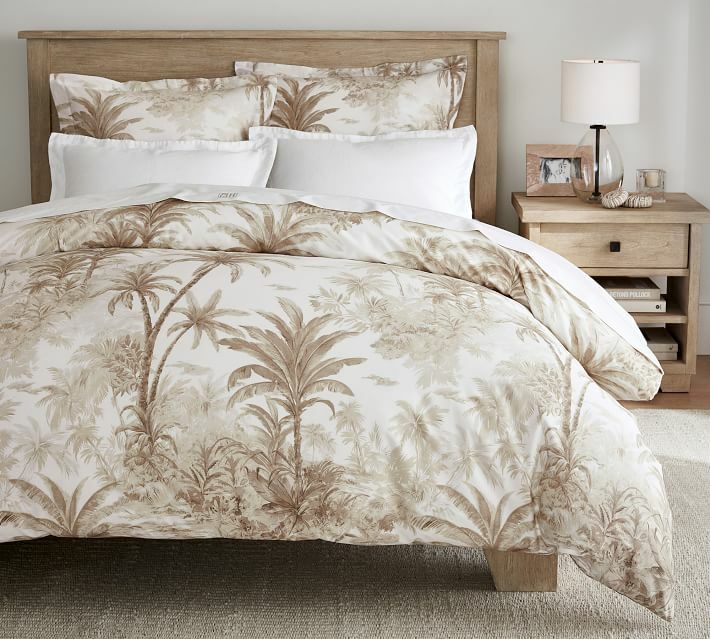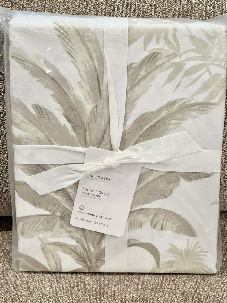 For your consideration, this nice Palm Toile duvet cover from Pottery Barn. Size: Full/Queen Color: Neutral 1 Palm Toile Full/Queen Duvet Cover 88" x 92" It is brand new with tags. Additional items shown in the last photo are not included; just the duvet cover described above. Woven of pure organic cotton in soothing neutral hues, this Palm Toile Organic Percale duvet cover will have you waking up in an island state of mind every day. A grove of swaying palm trees adds a tropical touch to the traditional toile print. Woven of 100% organic cotton. ********** Buyer to pay $9.95 shipping. Stored in a smoke-free and pet-free environment. Please ensure shipping address is correct before submitting payment. No affiliation with Pottery Barn.