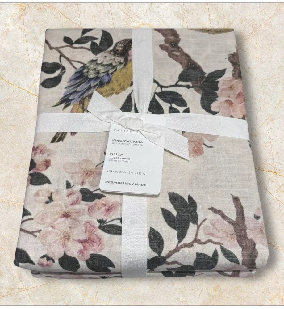 NEW Pottery Barn Nola Songbird Duvet Cover - KING /CAL KING NWT This is a NEW Pottery Barn Nola Songbird Duvet Cover in King size. The duvet cover features a Floral and Bird pattern in Multicolor, with a Chinoiserie style. It is made of Cotton Slub and 100% Cotton material, and has a Rectangular shape with Button closure. The set includes a Duvet Cover with dimensions of 108" length and 92" width.