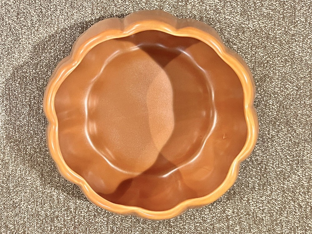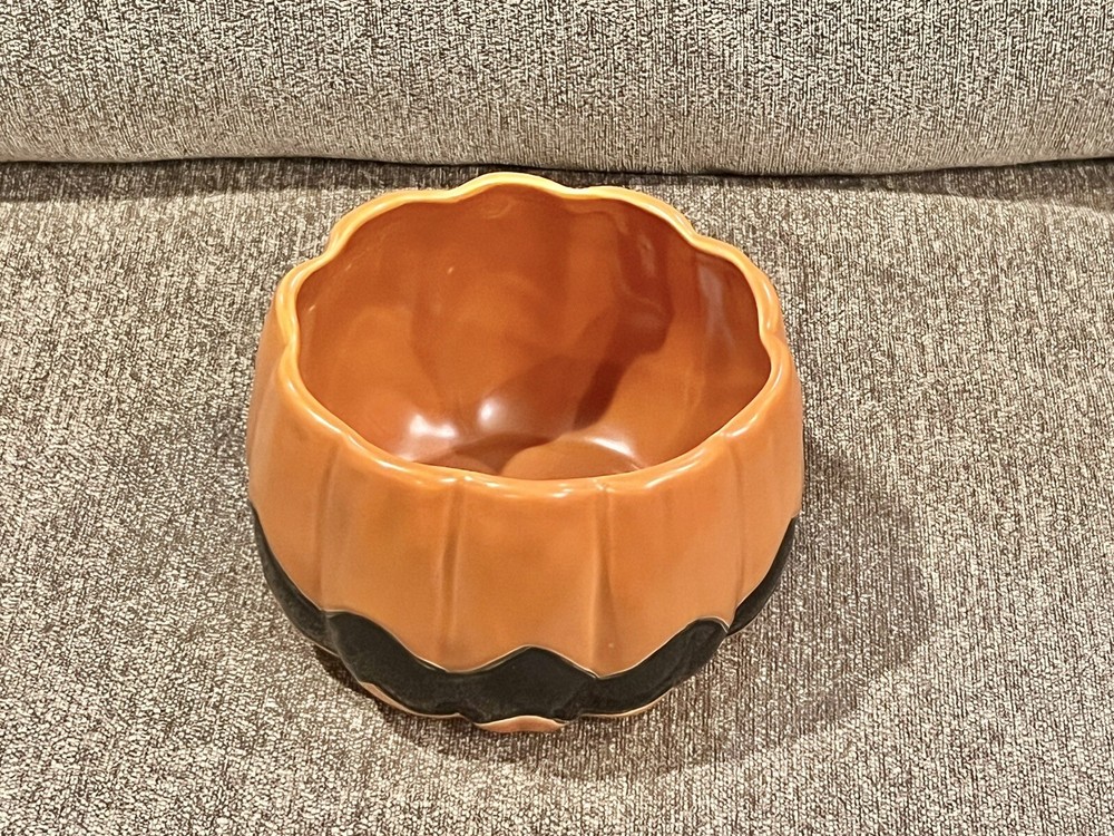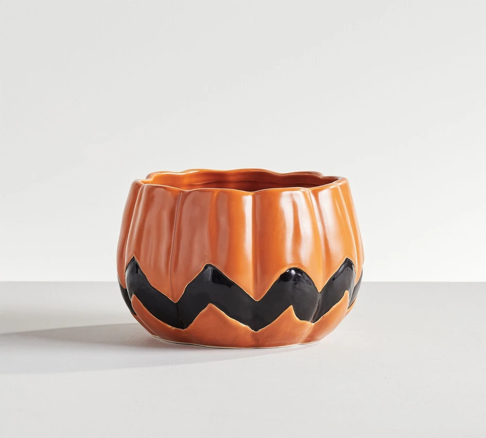 For your consideration, this nice Peanuts Pumpkin Shaped Stoneware Serving/Candy Bowl from Pottery Barn. Discontinued! Colors: Orange/Black Overall Dimensions: 8" diameter x 5" high Capacity: 3.25 quarts Bring home some comic-strip nostalgia this fall with this exclusive stoneware serving bowl shaped like the Great Pumpkin. The matte orange glazed finish has an instantly recognizable accent: Charlie Brown's black zig-zag shirt stripe. Consider it your place to stash everything a sweet tooth needs this Halloween season. Made of stoneware with a glazed finish. Dishwasher and microwave-safe. Lead free. Brand new in box. Additional items shown in the last two photos are not included. Buyer to pay $16.95 shipping. Please ensure shipping address is correct before submitting payment. Stored in a smoke-free and pet-free environment. This seller is not affiliated with Pottery Barn.