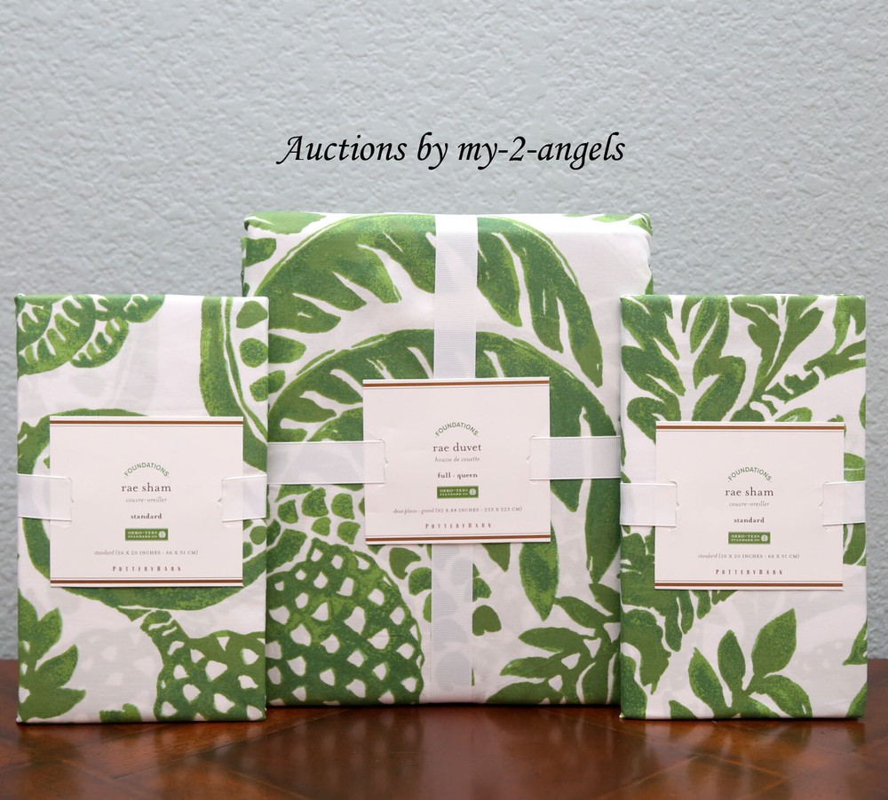 NEW POTTERY BARN RAE PATTERNED FULL/QUEEN DUVET COVER BEDDING SET, GREEN - The duvet cover set includes (1) a F/Q Duvet Cover, and (2) TWO Standard Shams. All items are **BRAND NEW IN PACKAGES**, and have never been used. A floral print in a single hue layers with your colorful sheets and pillows for an easy seasonal update. The graphic effect, replicated from our designer’s original artwork, has a relaxed vibe in the bedroom. Woven of 95% cotton and 5% organic cotton. Duvet cover features a hidden button closure; sham features an envelope closure. Oeko-Tex® certified. Machine wash. Duvet Cover: 88" long x 92" wide; Sham: 20" high x 26" wide. All from our smoke-free, pet-free home. Please click the Read More link or Item Description link for more details NEW POTTERY BARN RAE PATTERNED FULL / QUEEN DUVET COVER + 2 STANDARD SHAMS, GREEN You are bidding on a beautiful, Full/Queen Size, Rae Patterned Duvet Cover Set, in GREEN color, from Pottery Barn. All items are BRAND NEW IN PACKAGES . The duvet cover set includes: a Full/Queen Size, Rae Duvet Cover, and TWO Standard Size, Rae Shams. A floral print in a single hue layers with your colorful sheets and pillows for an easy seasonal update. The graphic effect, replicated from our designer’s original artwork, has a relaxed vibe in the bedroom. Woven of 95% cotton and 5% organic cotton. Duvet cover features a hidden button closure; sham features an envelope closure. Oeko-Tex® certified, the definitive mark of excellence for products that are healthy for you and healthy for the environment. Duvet cover, sham and insert sold separately. Machine wash. Imported. Dimensions Duvet Twin: 86" long x 68" wide Full/Queen: 88" long x 92" wide King/Cal. King: 92" long x 108" wide Sham Standard: 20" high x 26" wide Euro: 26" square King: 20" high x 36" wide Care and Maintenance Machine wash in warm water; gentle cycle. Use only non-chlorine bleach, if needed. Tumble dry on low heat; remove promptly. Warm iron as needed. Buyer pays shipping to a physical address within the continental United States. Please email us for a shipping quote for shipping to PO Boxes, APO/FPO Boxes, Alaska, or Hawaii. Thanks for viewing our auction! Terms and Conditions: We are not affiliated with Williams-Sonoma, or its affiliates. Although we guarantee that all our items are authentic, they are not warranted by the manufacturer and cannot be returned, exchanged or refunded by Pottery Barn. For Paypal users, we ship only to the confirmed address. Please read the description carefully to make sure that you understand what are being auctioned. The picture(s) might include other items, but only the item(s) stated in the description are included in the auction. Unless you have made arrangements with us prior to bidding, we do not ship to P.O. Boxes, APO Boxes, Alaska, or Hawaii. Please ask all questions, including shipping terms, prior to bidding. No returns on seasonal or holiday items. </</</ <