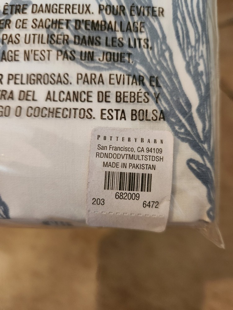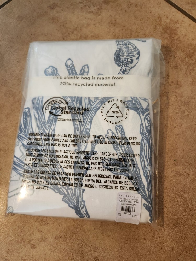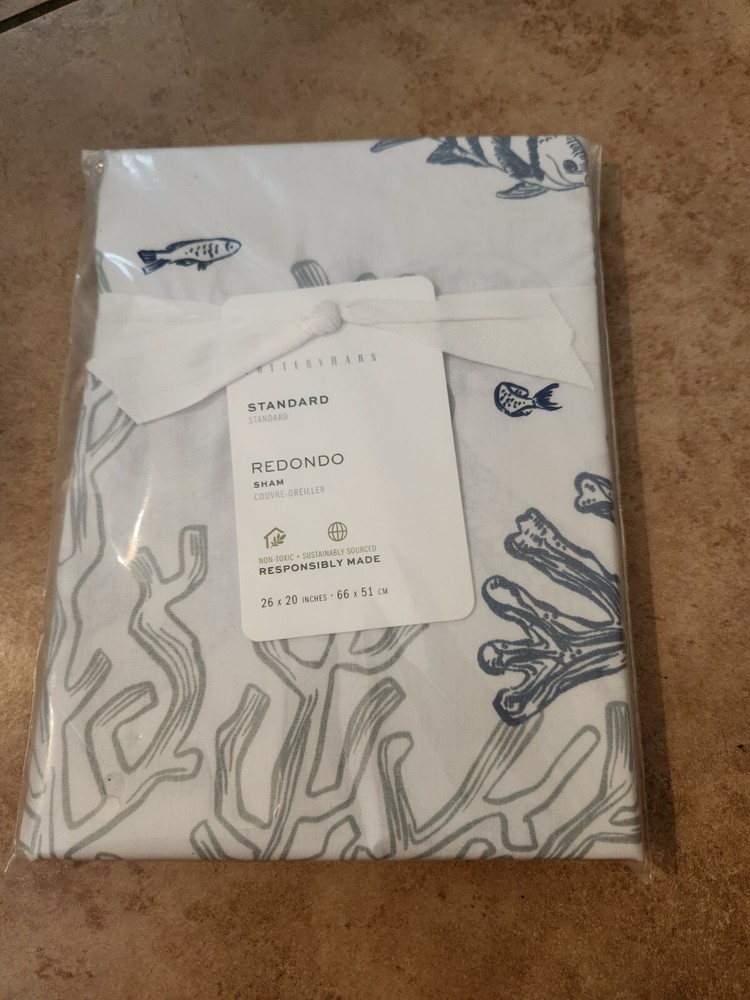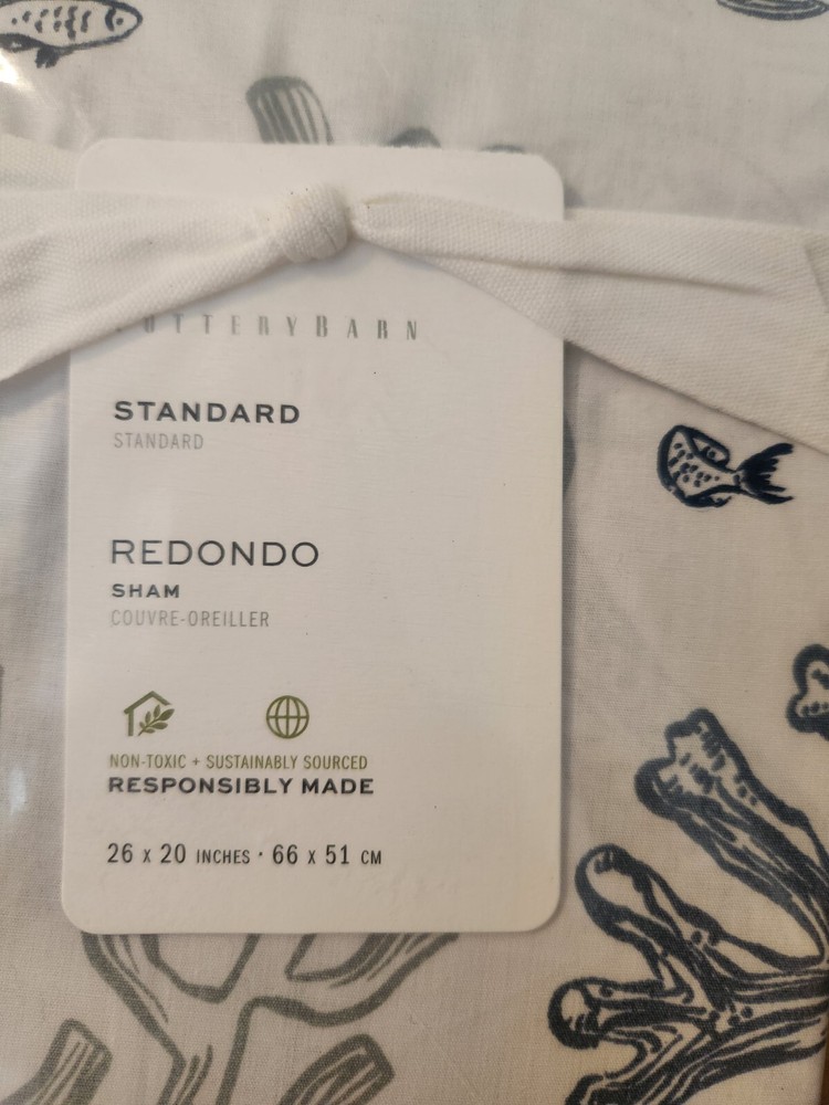 Selling brand new Pottery Barn Redondo Percale Standard pillow shams. Brand new in packaging still. ONLY selling shams in this listing. PRICE IS FOR EACH (1) Standard sham. Come from a pet and smoke free home I have LOTS of PB treasures so please check out my other listings or inquire. I have matching shams and duvets in separate listings. Overview The tranquil beauty of the sea is captured in this line-drawn coastal toile. Designed by one of our in-house artists, the print depicts the wonderous flora and fauna of the ocean floor. Crisp, cool percale combines with a palate of calming blues to give your space a breezy and fresh feel. Made from 100% Cotton. sham features an overlap closure. By choosing our cotton products, you’re supporting our investment in Better Cotton’s mission. This product is sourced via mass balance and therefore may not contain Better Cotton. Learn more at bettercotton.org/massbalance. STANDARD 100 by OEKO-TEX® Certified: WSI Certificate #: 14.HUS.42449: tested for 350+ harmful substances to keep you and your family safe from chemicals common to textile manufacturing. Machine wash. Imported. DIMENSIONS Standard sham: 26" l x 20" w CARE AND MAINTENANCE Machine wash in cold water; gentle cycle. Only non-chlorine bleach when needed. Tumble dry on low heat; remove promptly. Warm iron as needed.