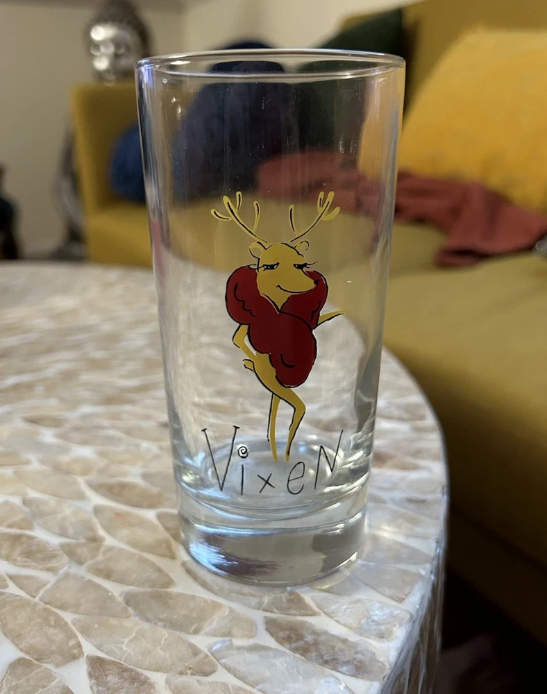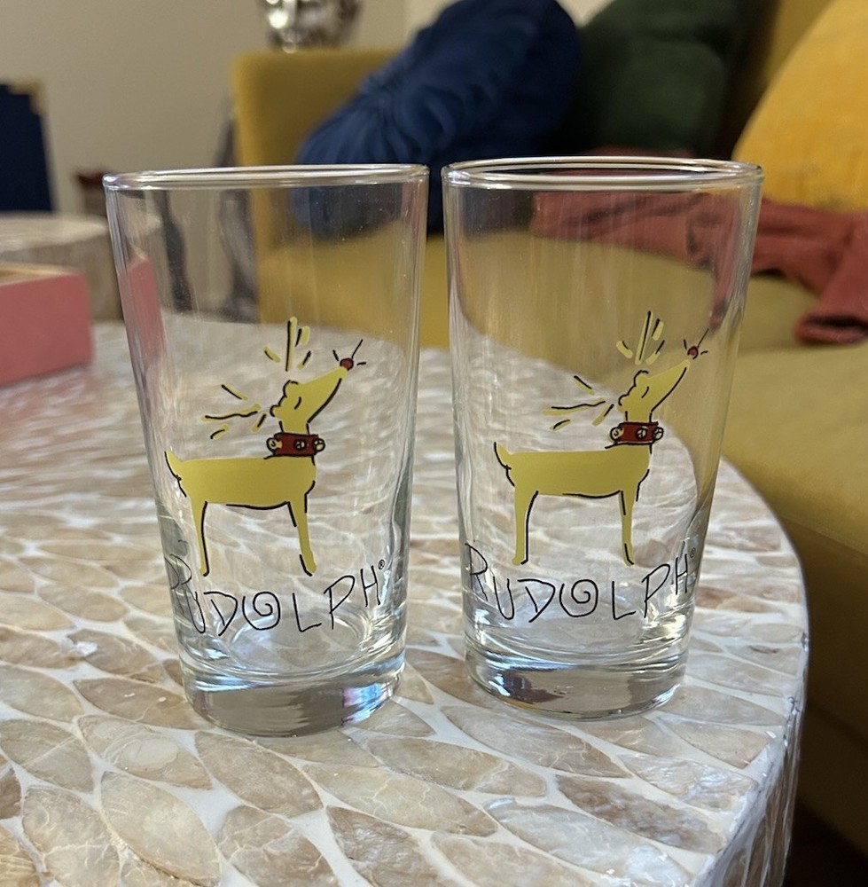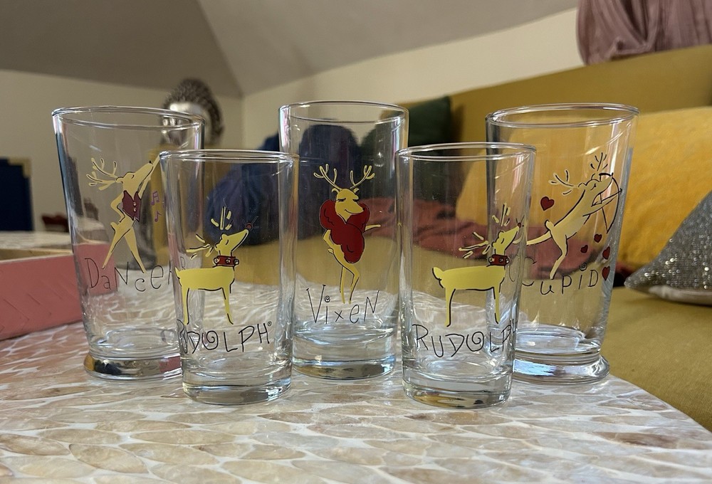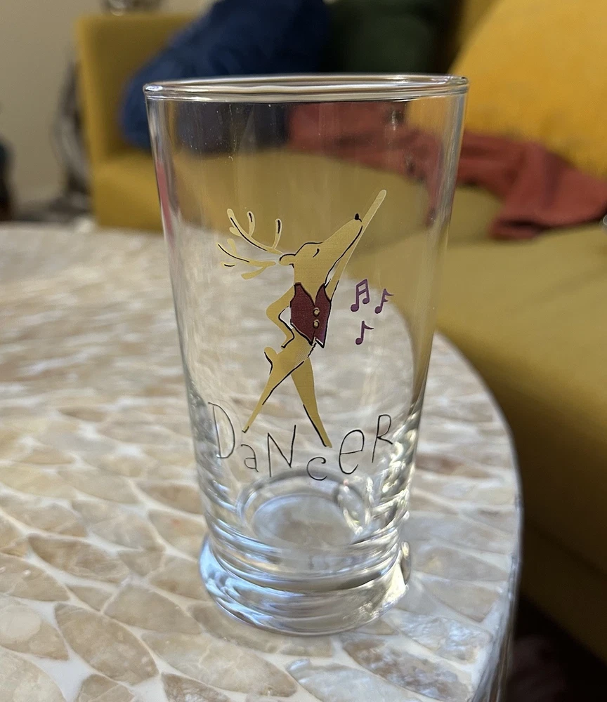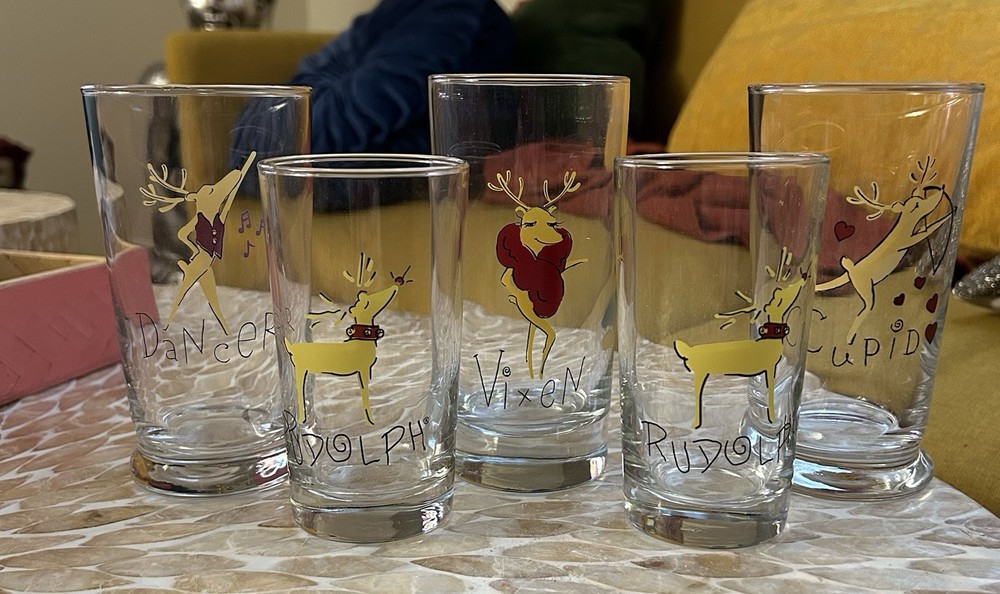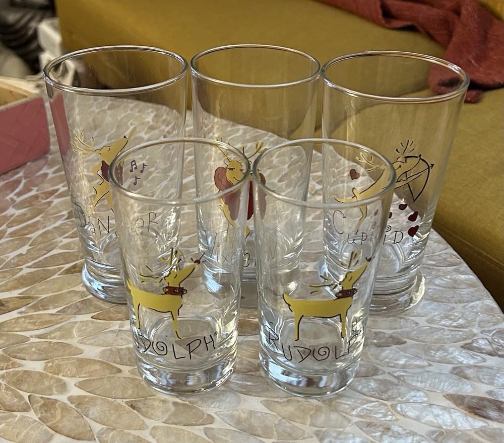 Collectible, discontinued & highly sought after! FIVE BRAND NEW Pottery Barn Reindeer Christmas Glassware. Set includes: •Rudolph 8 oz. Juice Glass (2) •Vixen 10 oz. Tumbler (1) •Dancer 12 oz. Footed Tumbler (1) •Cupid 12 oz. Footed Tumbler (1) These glasses are part of a larger collection that includes different reindeer characters from Santa’s Team - Dasher, Dancer, Prancer, Vixen, Comet, Cupid, Donner, and Blitzen. They were very popular when on the market and were sold in sets. • Material: Made of soda-lime glass, with 30% pre-consumer recycled glass. • Size (Dancer & Cupid): 5.5” high and 3” wide. • Size (Rudolph): 4.75” high and 2.5” wide • Size (Vixen): 5.5” high and 2.5” wide • Design: Each tumbler has a different whimsical reindeer • Care: Hand wash only recommended. • Discontinued: These glasses are discontinued, making the collection highly collectable. They were produced by Pottery Barn from 1999 to 2013 Brand new & ready to use. Or just to display!
