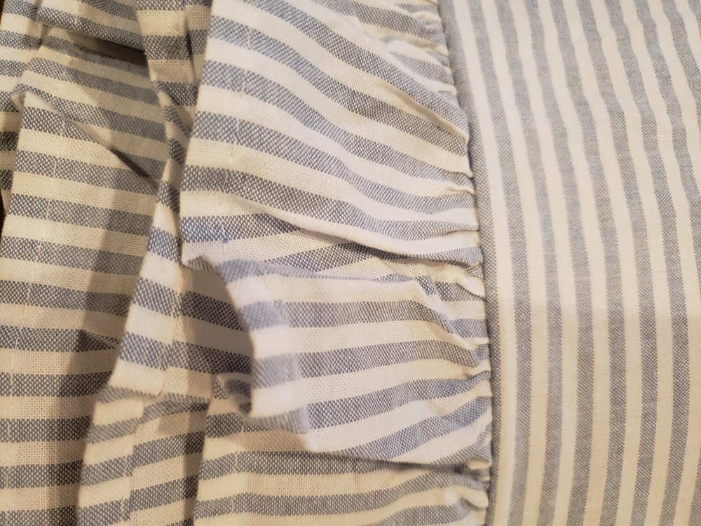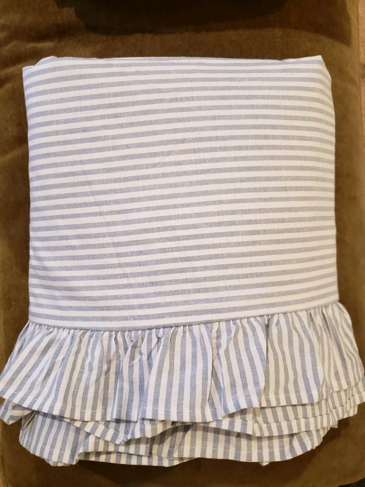 This is a Pottery Barn Teen Emily & Merrit Duvet Cover in Queen size, featuring a ruffled design with stripes in light blue and white. Made of 100% cotton, this duvet cover is ideal for a teen's bedroom and adds a touch of elegance with its unique pattern. The set includes the duvet cover only, perfect for decorating and enhancing the style of your bedroom decor.