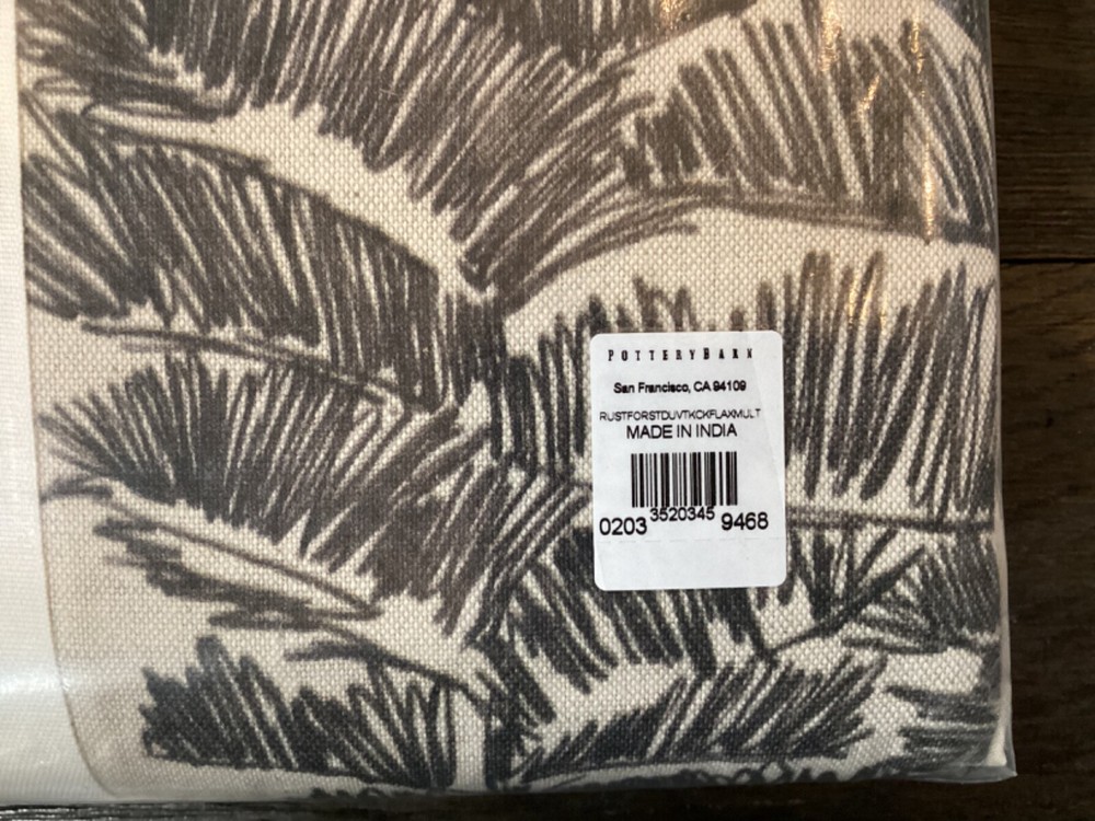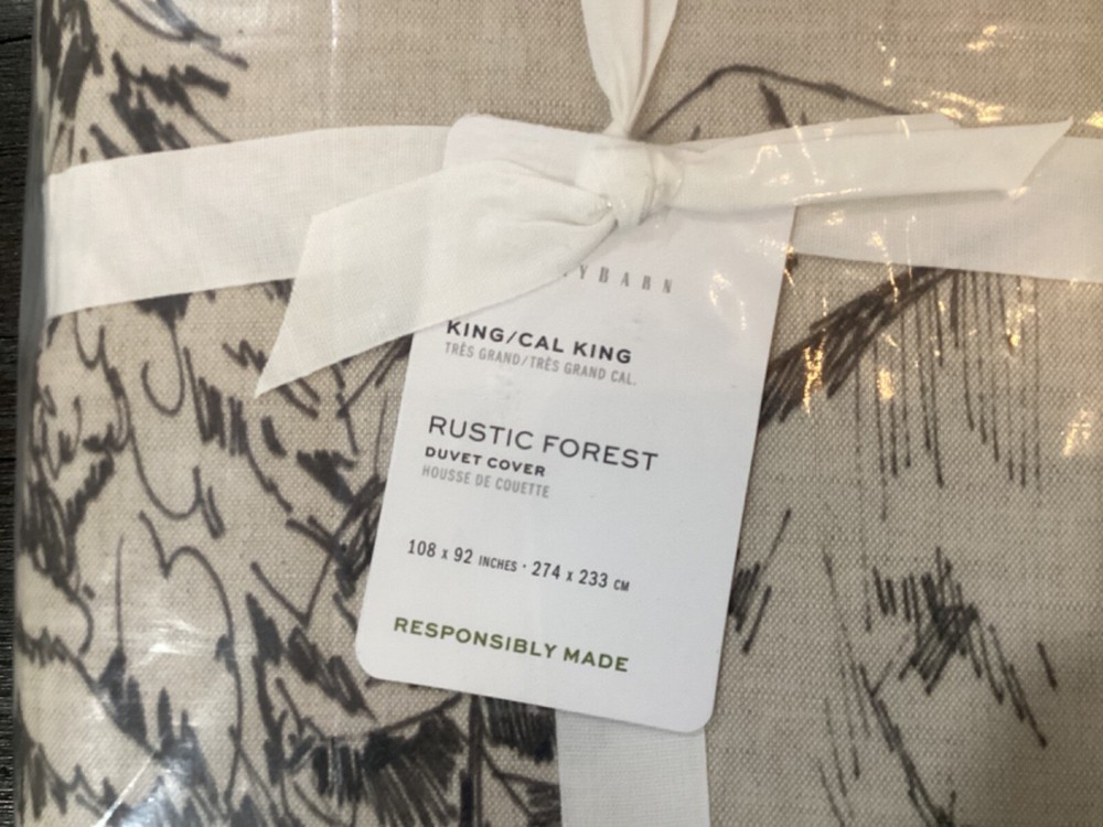 New Pottery Barn Rustic Forest Duvet Cover king size. This comes from a smoke free and pet free home. Check out my other listings as I can combine shipping. Front is 50% cotton and 50% linen; reverse is 100% cotton. Duvet features a button closure with inner ties that keep insert in place; sham features an overlap closure. Imported. CARE Machine wash in warm water. Only non-chlorine bleach when needed. Tumble dry on low heat; remove promptly. Warm iron as needed. King/Cal. King Duvet Cover: 92" l x 108" w