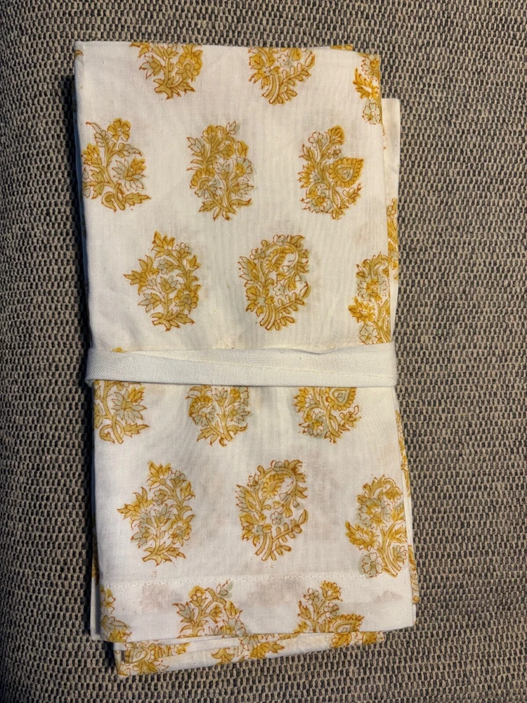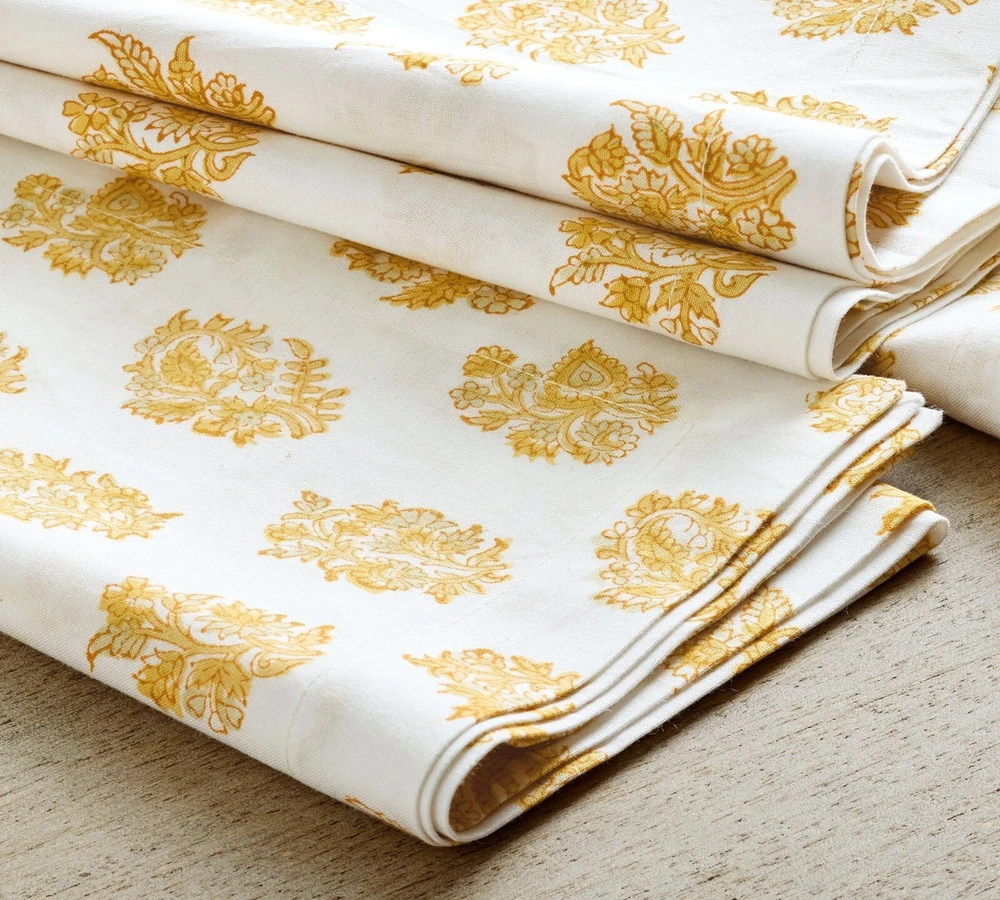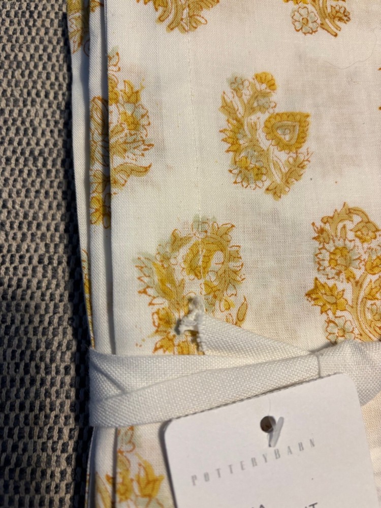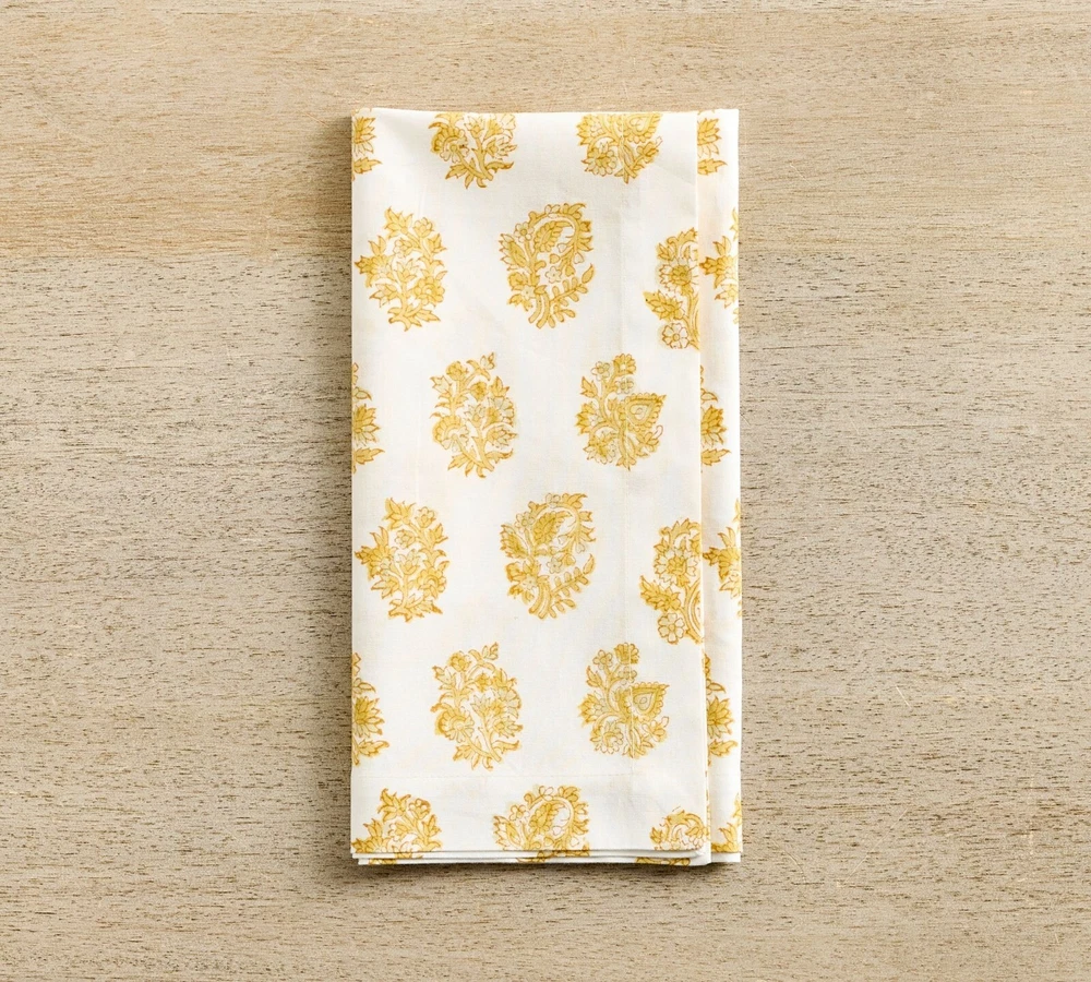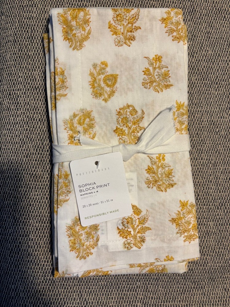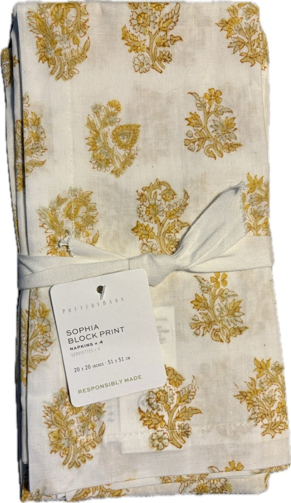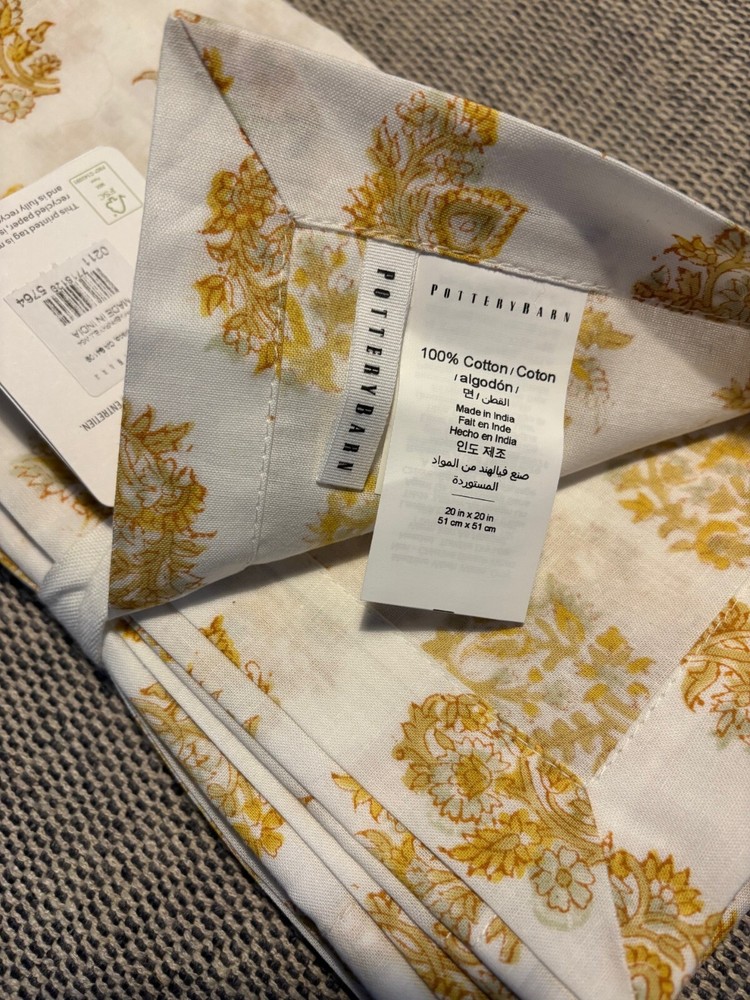 SOLD OUT!! NWT, new with tags from Pottery Barn retail store. Fresh and crisp in paisley, these cotton napkins lend a beautiful touch to mealtime. Done by hand, this block-print is our take on a beloved, classic pattern. Made of 100% cotton in hand blocked print. Sold as set of 4. Imported. Machine wash in cold water, gentle cycle. Use only non-chlorine bleach, if needed. Tumble dry on low heat. Warm iron as needed. Overall: 20" square Hem: 1"