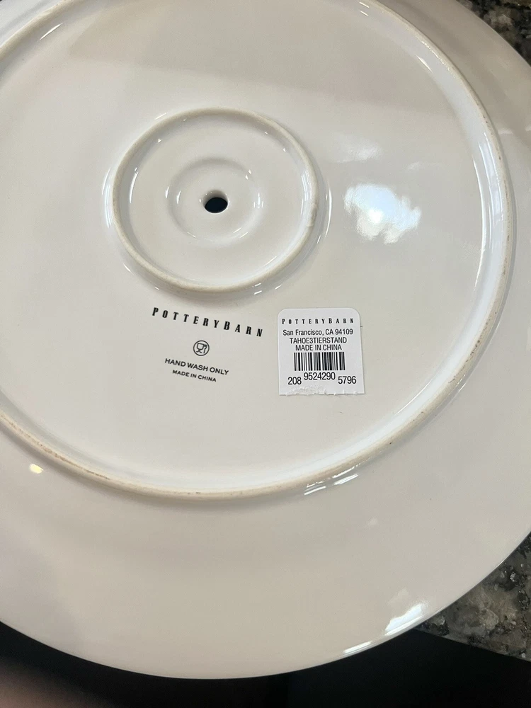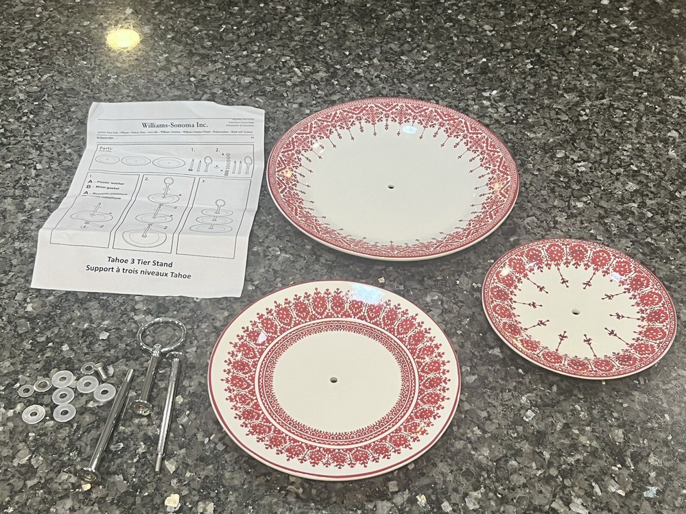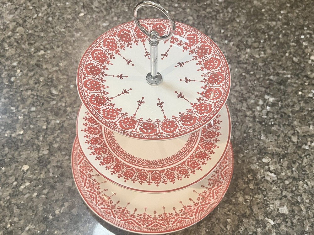 Tahoe Fair Isle 3-Tier Stand from Pottery Barn. Discontinued! Total height: 14" Height of smallest plate at top: 10" Diameter: 7-1/4" Height of middle plate: 5-1/2" Diameter: 9" Height of bottom plate: 1-1/2" Diameter: 11" Features a beautiful fair isle pattern in red/white. Perfect for holiday desserts and finger foods. Brand new in box. Assembly required. Buyer to pay $16.95 shipping. Please ensure shipping address is correct before submitting payment. Stored in a smoke-free and pet-free environment. This seller is not affiliated with Pottery Barn.