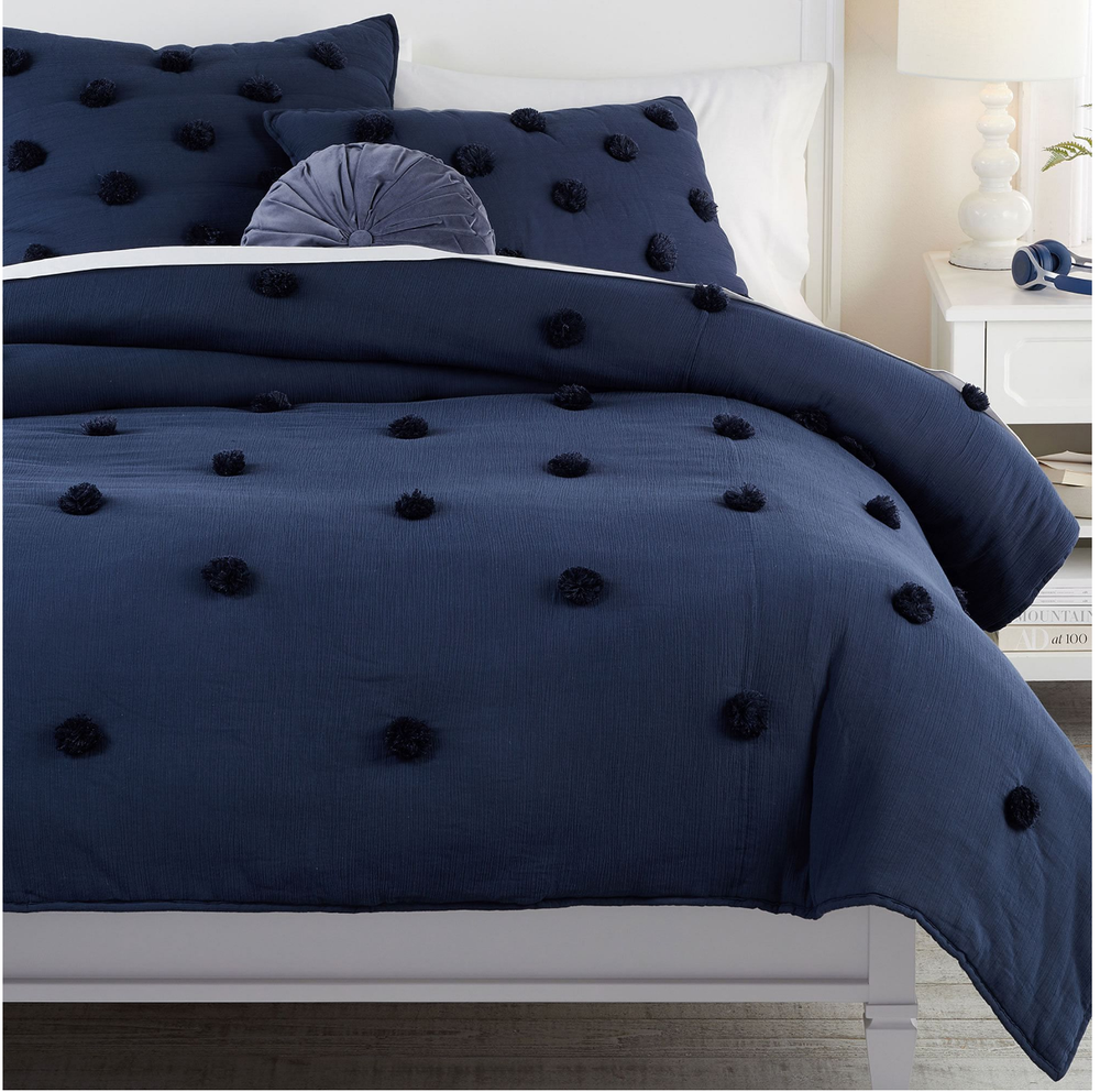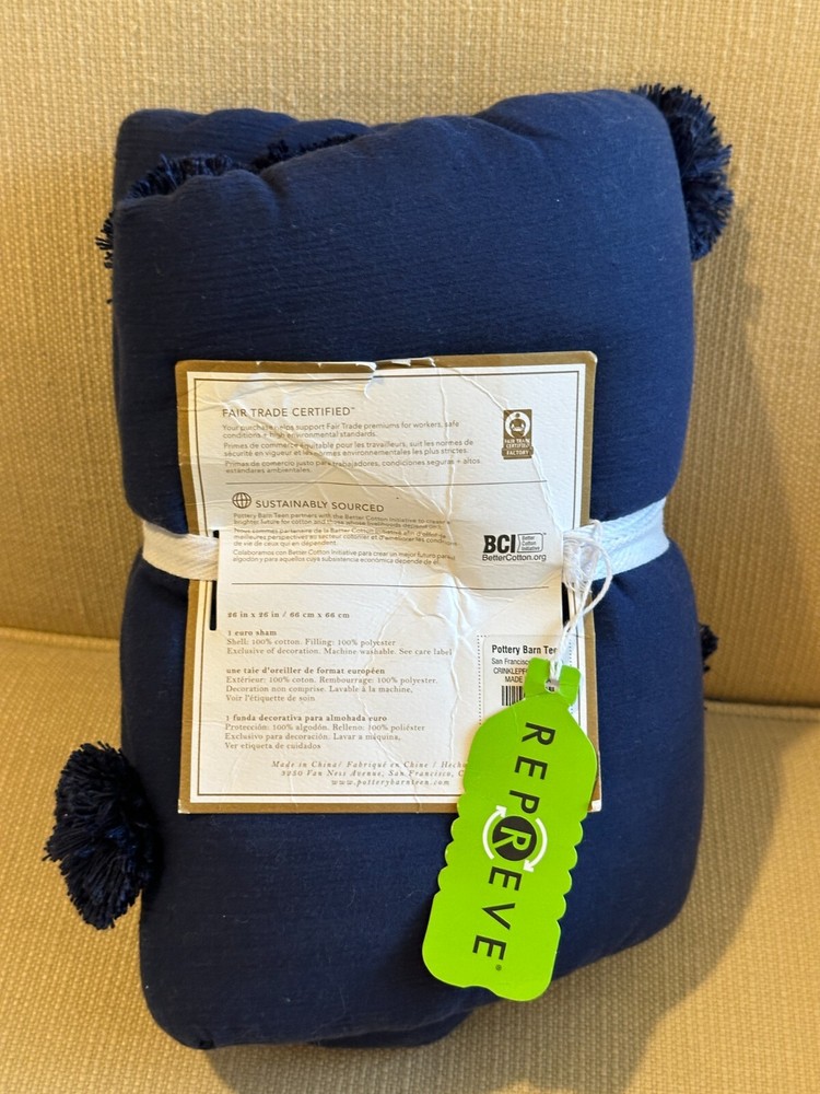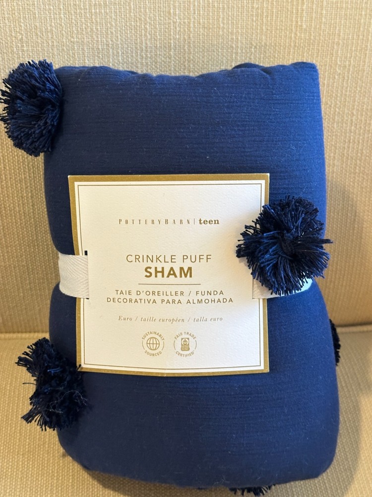 NEW Pottery Barn Teen Crinkle Puff Pom Navy Pillow EURO Sham