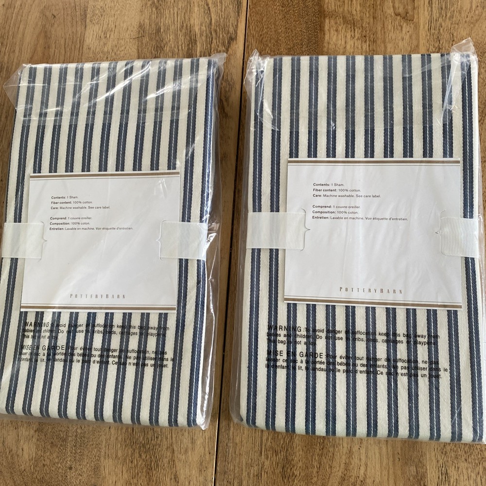 The product is a set of two standard pillow shams from Pottery Barn in navy blue with a striped pattern. Made from 100% cotton, these shams are designed for a bedroom setting and feature the Thatcher Stripe model. Perfect for adding a touch of style and comfort to any bedroom, these shams are a great addition to any bedding ensemble.