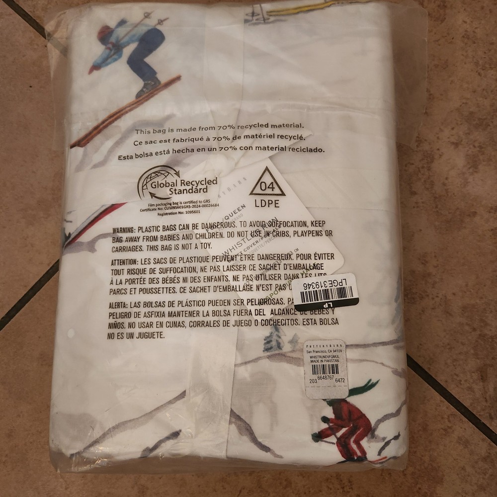 Selling a brand new Pottery Barn whistler run full / queen duvet. Brand new in packaging with tags. ONLY selling the duvet in this listing Come from a pet and smoke free home I have LOTS of PB treasures so please check out my other listings or inquire Overview: Crafted of soft cotton, this cozy bedding has us dreaming of snow-kissed peaks and crackling fires. The hand-painted design captures a nostalgic scene: log cabins, towering pines, and the rhythmic glide of skis. With a vintage look we love, it seamlessly transitions from holidays at home to wintertime escapes. Details Material: Made from 100% cotton. Fair Trade Certified™: Made in a Fair Trade Certified™ factory, empowering the workers who made it. Certification and Standards: OEKO-TEX® STANDARD 100 certified, tested for 1000+ harmful substances (14.HUS.42449 HOHENSTEIN HTTI). By choosing our cotton products, you’re supporting our investment in Better Cotton’s mission. This product is sourced via mass balance and therefore may not contain Better Cotton. Secure Design: Duvet features a hidden button closure with inner ties to keep the insert in place Components: Duvet cover, and insert are sold separately. Place of Manufacture: Imported. Care Instructions Machine wash in cold water. Use only non-chlorine bleach, if needed. Tumble dry on low; remove promptly. Dimensions Full / queen Duvet: 88" l x 92" w