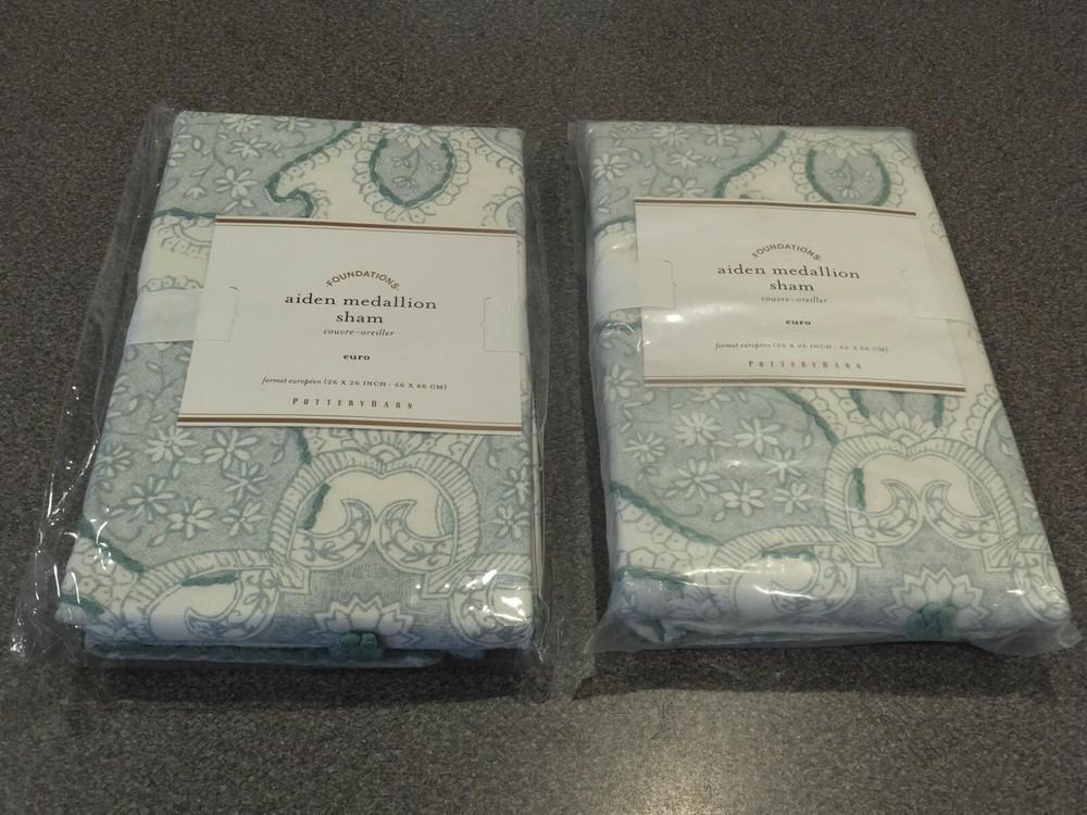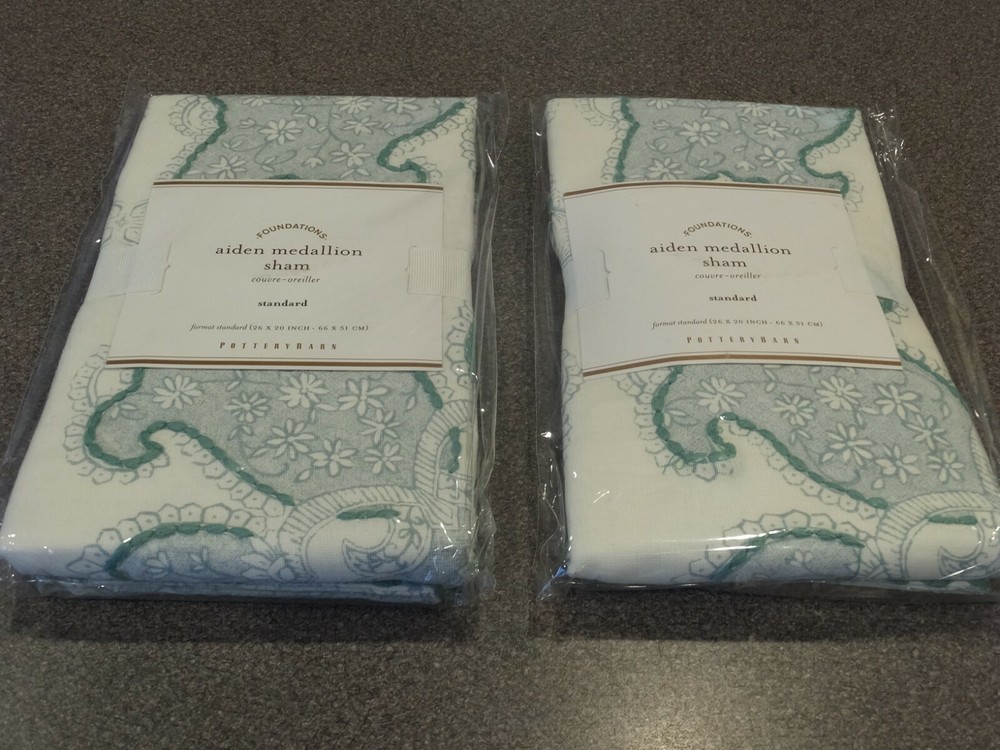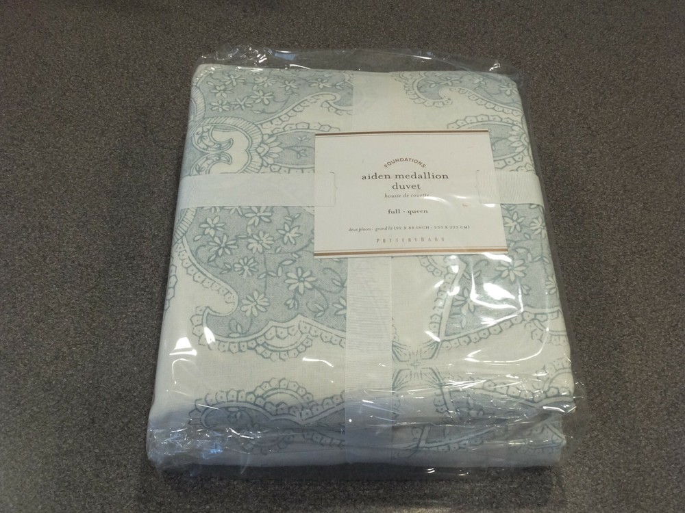 ~~~~~~~~~~~~~~~ Welcome to the Pottery Barn Treasure Trove: I have the widest selection of out of production, discontinued, and hard-to-find quilts and duvets from Pottery Barn, on the web. This is quite possibly your last chance at owning some of these classic/vintage Pottery Barn bedding patterns, in new condition, ever. Don't miss out. Once they are gone, they are gone forever. Get this while you can from a trusted eBay seller! ~~~~~~~~~~~~~~~ P O T T E R Y B A R N 5PC Aiden Medallion (Cool) Queen Duvet Set (includes 2 Standard and 2 Euro Shams) Listing Details: This listing is for a brand new, still in the original packaging, 5 piece queen duvet set from Pottery Barn. Included in the set is the duvet, 2 euro and 2 standard shams. All are new, in the original ribbons and unopened packaging. This duvet/pattern was offered in 2 different colors. This one is the 'cool' or blue variety. It is kind of a porcelain blue, which has a slight greenish tint to it. It was also offered in a 'warm' or neutral/tan/beige variety. There are still some in that variety available on eBay. The 'warm' color is not included in this listing. This is an absolutely striking duvet! See the last photo for a better sense of the embroidered detail on the shams. This pattern in no longer in production or for sale at Pottery Barn. Get it here while it is still available! If you have ever owned a Pottery Barn quilt, you already know how good the quality is! PRICE IS FIRM! 1x Queen duvet size: 88"x92" 2x Standard sham size: 20"x26" 2x Euro sham size: 26"x26" ------------------------------- DISCLAIMERS (IMPORTANT): All of the items I sell come from a clean, smoke-free, pet-free home, for those of you that might have allergies. All items are authentic. None of my items are outlet items unless specifically stated. I am not affiliated with Pottery Barn in any way. My pictures are of the exact product I am selling. The condition you see the item in the picture, is the condition you will receive the item. If the resolution of the picture is not sufficient for you to make your buying decision, please feel free to contact me for more photos or for more information. I do my best to provide accurate descriptions for all items.This is an AS IS listing. Please email questions BEFORE buying as ALL SALES ARE FINAL. In the event of a fulfillment error made on my part (i.e. wrong item sent), I will pay to have you ship the item back and will send out the correct item. I do not guarantee manufacturer's quality for unopened items (I will not remove an item from original manufacturer's packaging). I do not warranty color. Cameras & computer screens do crazy things w/colors. Because I will not allow returns if you are not satisfied with how the color looks under your specific kind of lighting. Do not think to abuse the eBay resolution process, stating you received the incorrect item if you did not indeed receive the wrong item. As part of the resolution process, you WILL HAVE TO fully and clearly document and demonstrate (w/pictures & full explanation) how the product you received was not what was listed. Any frivolous use of the dispute/return process to try to return an item will be immediately reported to eBay. Despite all of the above listed disclaimers, I am a reasonable person. Unfortunately, there is a small percentage of eBay users out there that wish only to scam, waste sellers' time, and otherwise disrupt the great buying/selling resource the eBay is. Should you purchase an item and you are not satisfied with it, please email me directly, at the email listed in the PayPal payment receipt, to discuss the possibility of a return. If I grant a return authorization, it will always be under these terms: 1) you will need to pay return shipping, 2) The item must be returned in the EXACT SAME CONDITION that it was shipped 3) initial shipping fees are not refundable & 4) the refund will be equal to the purchase price, less shipping, & less a 25% restocking fee. If any of these conditions are not met, the item will be returned to you and the refund forfeited. Expensive or rare items will be shipped out with a signature service. This is a protection to both you, the buyer, and me, the seller. Also, if you have a low, or zero feedback rating, an adult signature will also be required. Should any damage of an item be incurred during shipping, it is the responsibility of the buyer to document the damage with clear picture for me to file a claim within 48 hours of receipt. Failure to provide ANY needed information will void the shipping insurance, at the buyer's risk. Document the damage with photos (pictures of exterior of the box where damaged, and pictures of broken item). Email me these pictures, along with a description of the damages. Shipping to continental US only, unless prior authorization has been made before checkout. Check out my other auctions! Thanks.
