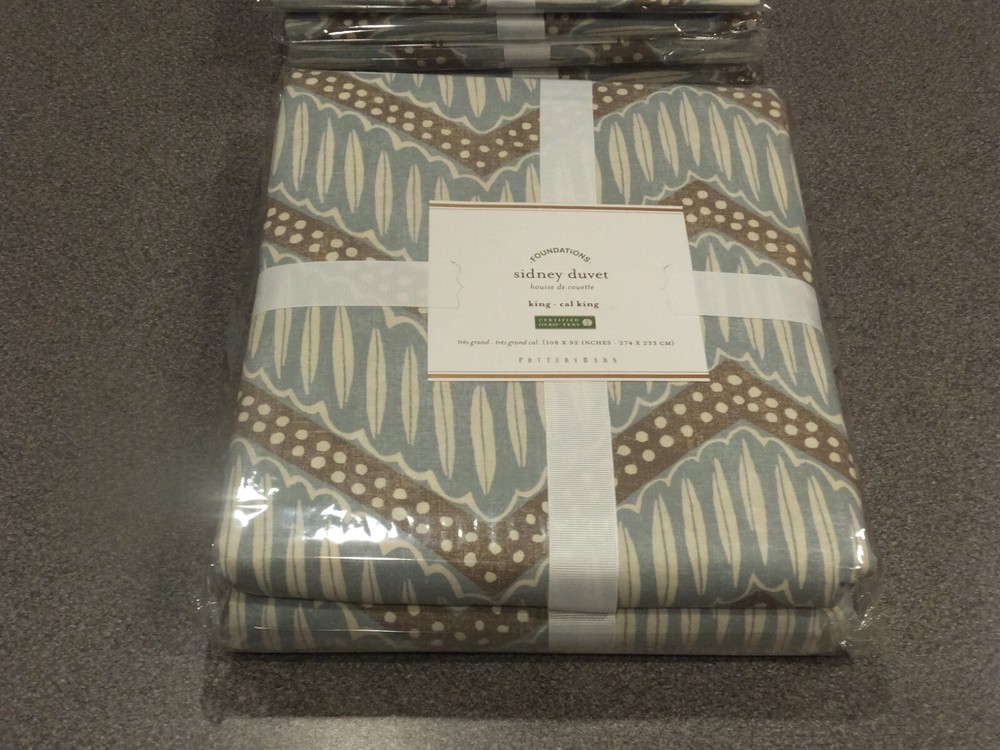 P O T T E R Y B A R N 5 Piece Sidney Chevron King Duvet Set ~~~~~~~~~~~~~~~ Welcome to the Pottery Barn Treasure Trove: I have the widest selection of out of production, discontinued, and hard-to-find quilts and duvets from Pottery Barn, on the web. This is quite possibly your last chance at owning some of these classic/vintage Pottery Barn bedding patterns, in new condition, ever. Don't miss out. Once they are gone, they are gone forever. Get this while you can from a trusted eBay seller! ~~~~~~~~~~~~~~~ Listing Details: This listing is for a brand new, still in the original packaging, 5 piece king duvet set from Pottery Barn. Included in the set is the duvet, 2 standard and 2 euro shams. All are new, Pottery Barn packaging. No other items shown in the staged bed picture are included. As of the time of this listing being first created and posted on eBay, there were no other king sets in this pattern, complete with matching shams and in new condition, available. Get this while it lasts, because once it sells, you may never have another opportunity of owning this king duvet set in this pattern again! This is the Sidney Chevron design. Create a stunning global inspired themed bed with this pattern. This pattern is also perfect for a Spring, Summer, or Fall themed bed! You can email me for a staged stock photo from Pottery Barn, to get a better idea of what this will look like. If you have ever owned a Pottery Barn quilt, you already know how good the quality is! PRICE IS FIRM! King duvet size: 92"x108" Standard sham size: 20"x26" Euro sham size: 26"x26" ------------------------------- From Pottery Barn: OVERVIEW An energetic zigzag in cool shades adds chic visual interest to the bed. Mix this bedding with patterns and solids in similar hues for a rich, coordinated look. Made of 100% cotton. Oeko-Tex certified. This product is free of harmful toxins and irritants; the production is eco-friendly and does not generate any water, air or noise pollution. To learn more about our environmental commitment click here. Duvet features a button closure; sham has an envelope closure. 200 thread count. Duvet, sham, and insert sold separately. Machine wash. Imported. DIMENSIONS Duvet: King/Cal. King: 92" long x 108" wide Sham: Standard: 20" high x 26" wide Euro: 26" square Flange: 2" wide CARE AND MAINTENANCE Machine wash in warm water, gentle cycle. Use only non-chlorine bleach when needed. Tumble dry on low heat; remove promptly. Warm iron as needed. DISCLAIMERS (IMPORTANT): All of the items I sell come from a clean, smoke-free, pet-free home, for those of you that might have allergies. All items are authentic, either from a retail store or potterybarn.com. None of my items are outlet items unless specifically stated. I am not affiliated with Pottery Barn in any way. Items that are new are either: 1) new unopened in the original plastic and original ribbons, 2) new unopened with the original ribbons, or a retail or potterybarn.com repackage. My pictures are of the exact product I am selling. The condition you see the item in the picture, is the condition you will receive the item. If the resolution of the picture is not sufficient for you to make your buying decision, please feel free to contact me for more photos or for more information. I do my best to provide accurate descriptions for all items. This is an AS IS listing. Please email questions regarding an item BEFORE buying as ALL SALES ARE FINAL. In the event of a fulfillment error made on my part (i.e. item sent was not the same as what was listed, such as a lamp instead of a duvet), I will pay to have you ship the item back and will send out the correct item. To date, I have had ZERO fulfillment errors. I do not guarantee manufacturer's quality for unopened items, as I cannot and will not remove and unfold from the original manufacturer's packaging. I do not make any warranty of color, as cameras and computer screens do crazy things with colors. Again, know before you buy, because I will not allow returns if you are not satisfied with how the color looks under your specific kind of lighting. Because I do not accept returns, unless there was a clear error on my part, do not think to abuse the eBay resolution process, stating you received the incorrect item if you did not indeed receive the wrong item. As part of the resolution process, you WILL HAVE TO fully and clearly document and demonstrate, with pictures and a full explanation, how the product that you received was not what was listed. Any frivolous use of the dispute/return process to try to return an item will be immediately reported to eBay. Despite all of the above listed disclaimers, I am a reasonable person. Unfortunately, there is a small percentage of eBay users out there that wish only to scam, waste sellers' time, and otherwise disrupt the great buying/selling resource the eBay is. Should you purchase an item and you are not satisfied with it, please email me directly, at the email listed in the PayPal payment receipt, to discuss the possibility of a return. If I grant a return authorization, it will always be under these terms: 1) you will need to pay return shipping, using the same shipping with tracking method that the item was shipped 2) The item must be returned in the EXACT SAME CONDITION that it was shipped out in 3) initial shipping fees are not refundable and 4) the refund will be equal to the purchase price, less shipping, minus a 25% restocking fee. If any of these conditions are not met, the item will be returned to you and the refund forfeited. Tracking information is provides for most purchases. Most items with a value of $100 or more, or that are rare, will be shipped out with an adult signature service. This is a protection to both you, the buyer, and me, the seller. Also, if you have a low, or zero feedback rating, an adult signature will also be required. This service is $2.35 for USPS and $5.00 for UPS. In most situations, I will cover that fee. Should any damage