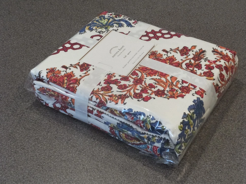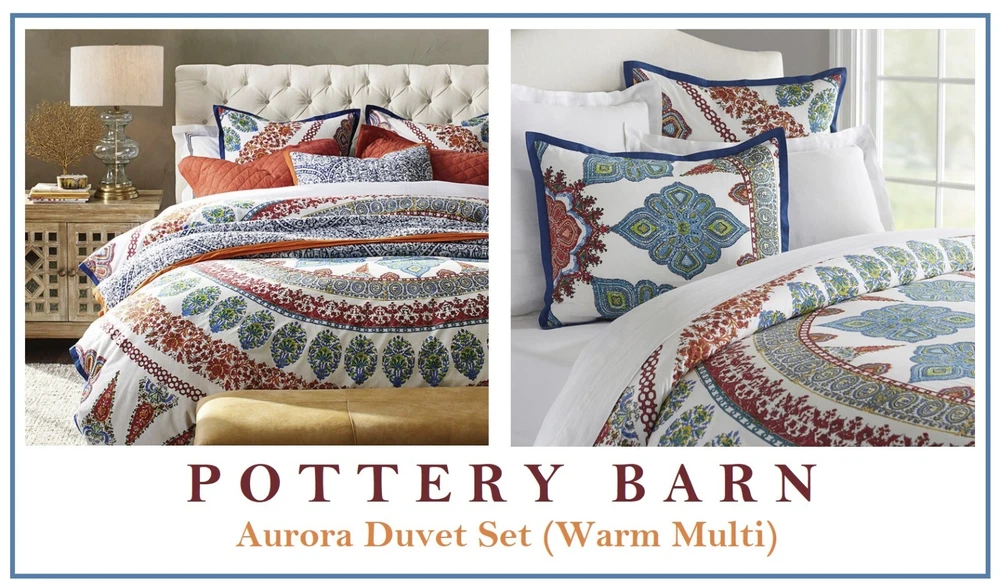 ~~~~~~~~~~~~~~~ Welcome to the Pottery Barn Treasure Trove: I have the widest selection of out of production, discontinued, and hard-to-find quilts and duvets from Pottery Barn, on the web. This is quite possibly your last chance at owning some of these classic/vintage Pottery Barn bedding patterns, in new condition, ever. Don't miss out. Once they are gone, they are gone forever. Get this while you can from a trusted eBay seller! ~~~~~~~~~~~~~~~ P O T T E R Y B A R N Aurora Medallion (Warm/Multi) 6PC Queen Duvet Set Listing Details: This listing is for a brand new, still in the original packaging, queen duvet set from Pottery Barn. This set includes the queen duvet, 2 standard shams, and 3 euro shams. All pieces are new in their original and unopened packaging. No other items, such as inserts, are included. This is a bright and cheerful pattern - perfect for coming out of winter, to bring on your spring cheer! Note: This is the warm/multi variation of the Aurora Medallion pattern. It features reds/oranges/blues/greens. Pottery Barn also released this in a cool/multi variation that didn't have any of the reds/oranges in it. Google the name of the duvet pattern to see Pottery Barn's stock photo of this set. Or email me, and I can send them, or a link to them on the web. As of the time that this listing was created, there were no other duvets in this pattern, color and size combination, in new condition, available on eBay. Get it here now, while it is still available. Once this sells, you may never have the chance at owning such a stunning duvet again. If you have ever owned a Pottery Barn quilt, you already know how good the quality is! Queen Duvet insert size: 88"x92" Euro Sham insert size: 26" x 26" Standard Sham insert size: 20" x 26" ------------------------------- DISCLAIMERS (IMPORTANT): All of the items I sell come from a clean, smoke-free, pet-free home, for those of you that might have allergies. All items are authentic. None of my items are outlet items unless specifically stated. I am not affiliated with Pottery Barn in any way. My pictures are of the exact product I am selling. The condition you see the item in the picture, is the condition you will receive the item. If the resolution of the picture is not sufficient for you to make your buying decision, please feel free to contact me for more photos or for more information. I do my best to provide accurate descriptions for all items.This is an AS IS listing. Please email questions BEFORE buying as ALL SALES ARE FINAL. In the event of a fulfillment error made on my part (i.e. wrong item sent), I will pay to have you ship the item back and will send out the correct item. I do not guarantee manufacturer's quality for unopened items (I will not remove an item from original manufacturer's packaging). I do not warranty color. Cameras & computer screens do crazy things w/colors. Because I will not allow returns if you are not satisfied with how the color looks under your specific kind of lighting. Do not think to abuse the eBay resolution process, stating you received the incorrect item if you did not indeed receive the wrong item. As part of the resolution process, you WILL HAVE TO fully and clearly document and demonstrate (w/pictures & full explanation) how the product you received was not what was listed. Any frivolous use of the dispute/return process to try to return an item will be immediately reported to eBay. Despite all of the above listed disclaimers, I am a reasonable person. Unfortunately, there is a small percentage of eBay users out there that wish only to scam, waste sellers' time, and otherwise disrupt the great buying/selling resource the eBay is. Should you purchase an item and you are not satisfied with it, please email me directly, at the email listed in the PayPal payment receipt, to discuss the possibility of a return. If I grant a return authorization, it will always be under these terms: 1) you will need to pay return shipping, 2) The item must be returned in the EXACT SAME CONDITION that it was shipped 3) initial shipping fees are not refundable & 4) the refund will be equal to the purchase price, less shipping, & less a 25% restocking fee. If any of these conditions are not met, the item will be returned to you and the refund forfeited. Expensive or rare items will be shipped out with a signature service. This is a protection to both you, the buyer, and me, the seller. Also, if you have a low, or zero feedback rating, an adult signature will also be required. Should any damage of an item be incurred during shipping, it is the responsibility of the buyer to document the damage with clear picture for me to file a claim within 48 hours of receipt. Failure to provide ANY needed information will void the shipping insurance, at the buyer's risk. Document the damage with photos (pictures of exterior of the box where damaged, and pictures of broken item). Email me these pictures, along with a description of the damages. Shipping to continental US only, unless prior authorization has been made before checkout. Check out my other auctions! Thanks.