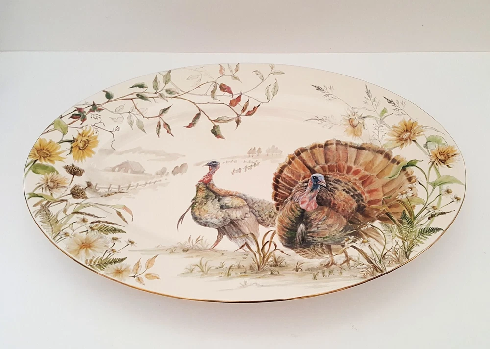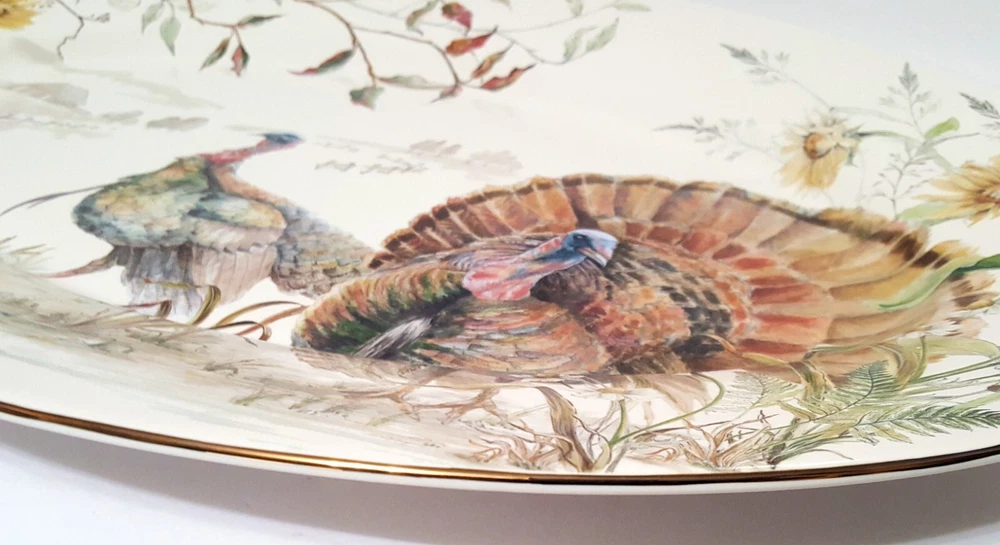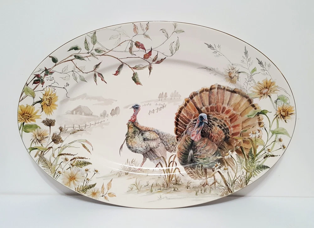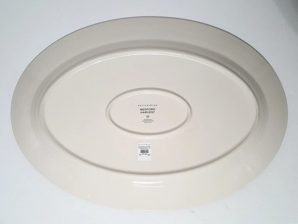 SOLD OUT AT WILLIAMS SONOMA This Bedford Harvest gold trimmed Turkey platter brings more to the table with its impeccable detail and seasonal charm. Crafted by hand, the glazed stoneware pays homage to falls favorite icons and colors, beckoning guests to gather and setting the scene for a truly festive feast. Handcrafted from 100% stoneware with a White glazed decal finish. Overall: 20" l x 13.5" w x 2" h Dishwasher, microwave and oven safe up to 425° F.