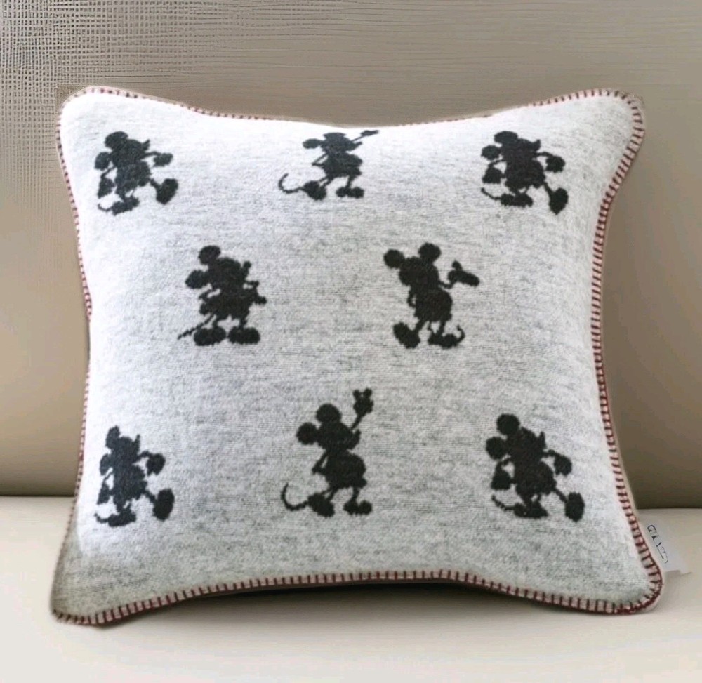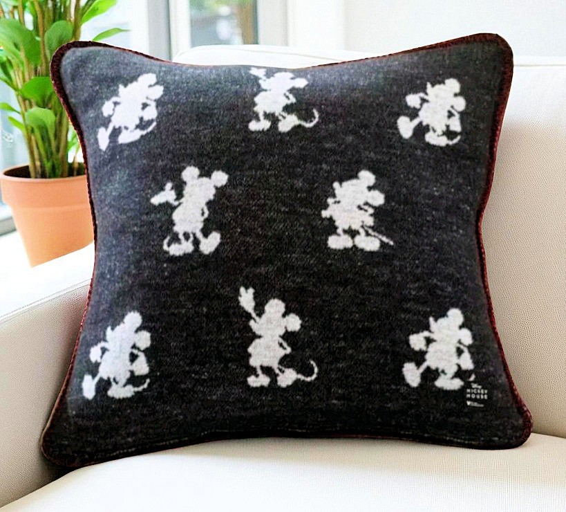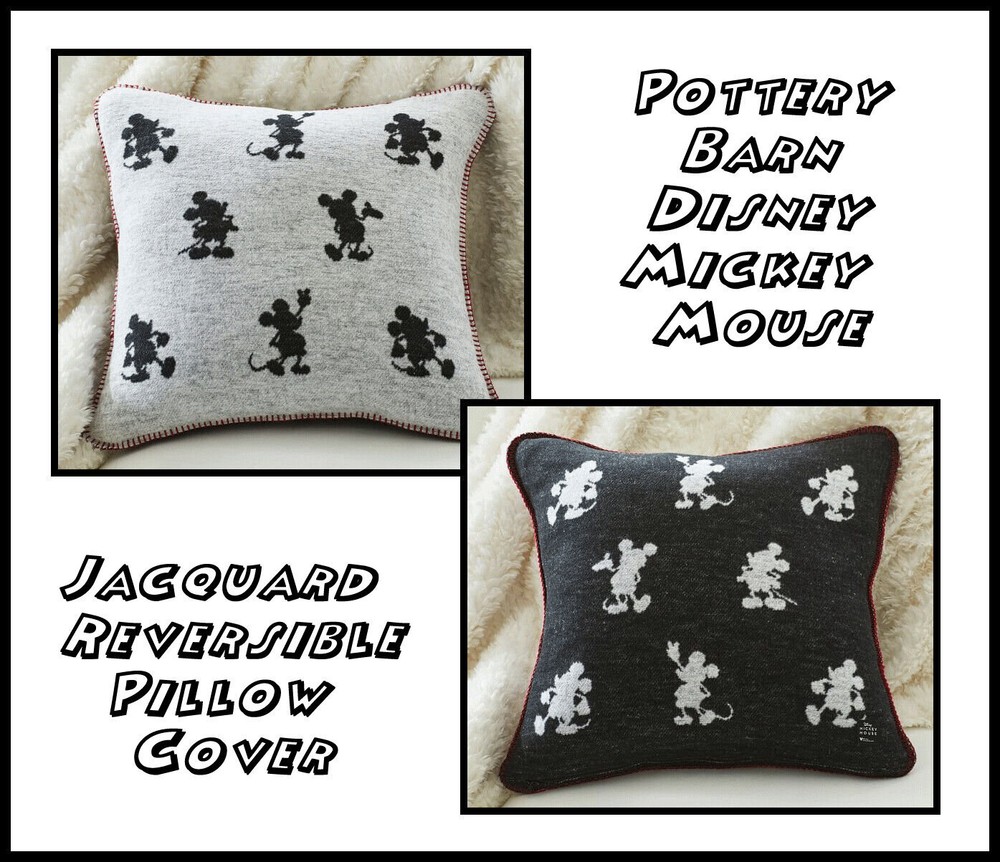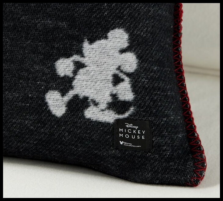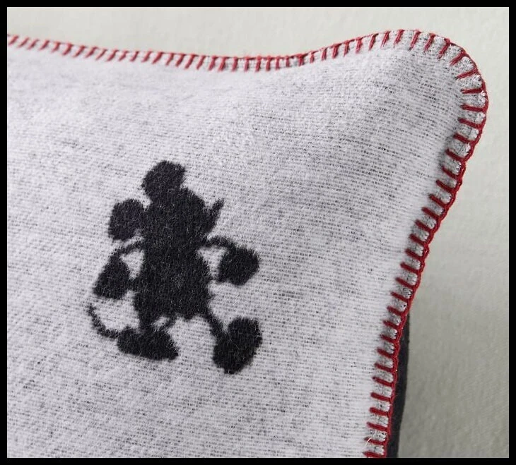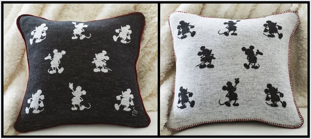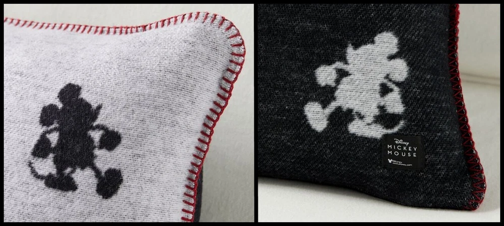 Give your space a glow with the mascot for everything magical: Disney’s Mickey Mouse. This jacquard pillow has more than one way to bring some cheer to your sofa. It’s reversible with one side featuring black silhouettes of Mickey on an ivory background, ivory-on-black on the inverse. Rustic stitching on the seams adds a pop of red. Woven of 58% cotton, 32% acrylic and 10% polyester. Reverses to charcoal ground color. Accommodates a 20" square insert Imported. Overall: 20" sq Zipper: 19.75" l Machine wash warm, gentle cycle. Use only non-chlorine bleach, if needed. Tumble dry on low, remove promptly. Warm iron, as needed. Do not dry clean.