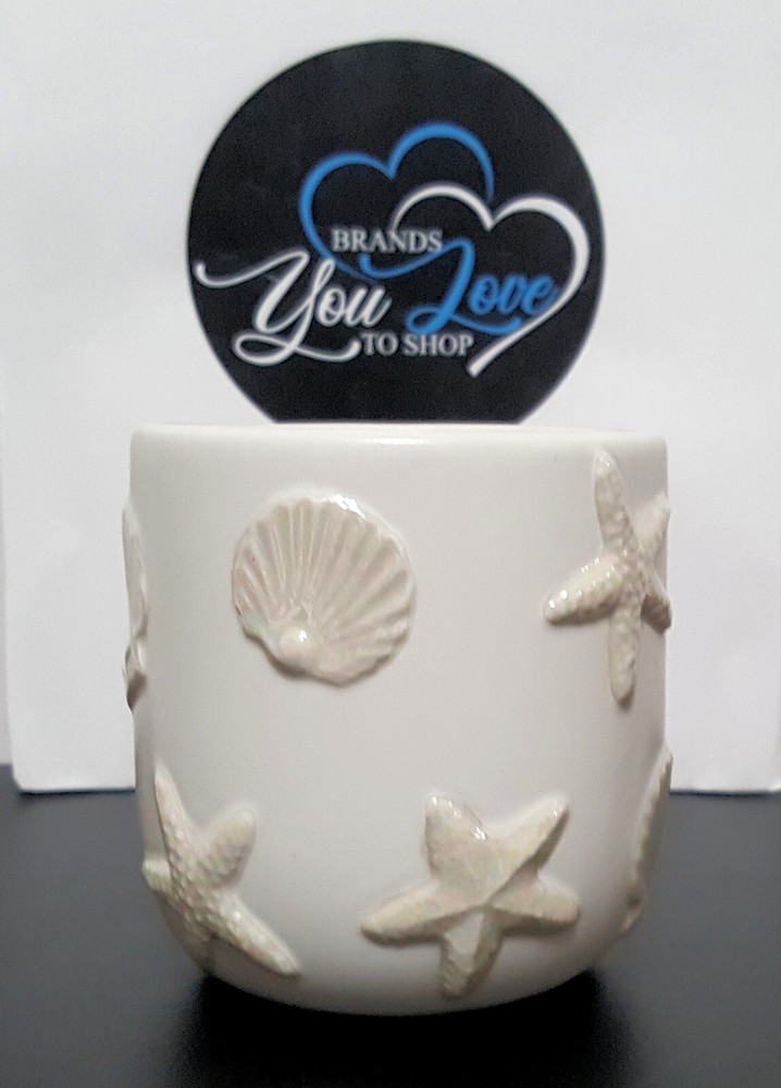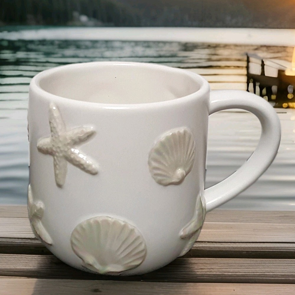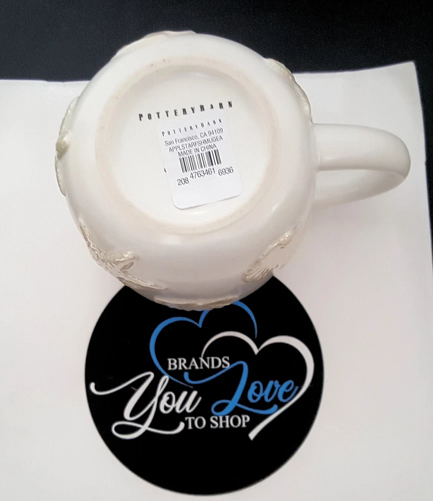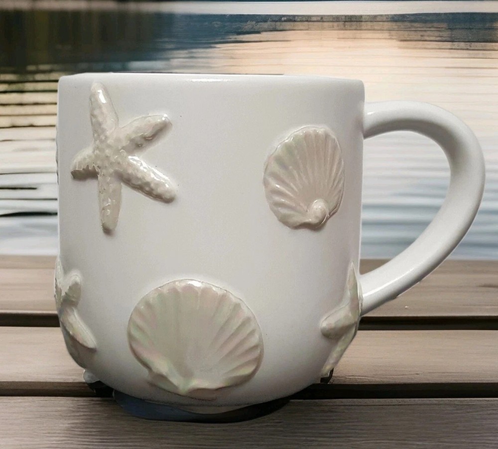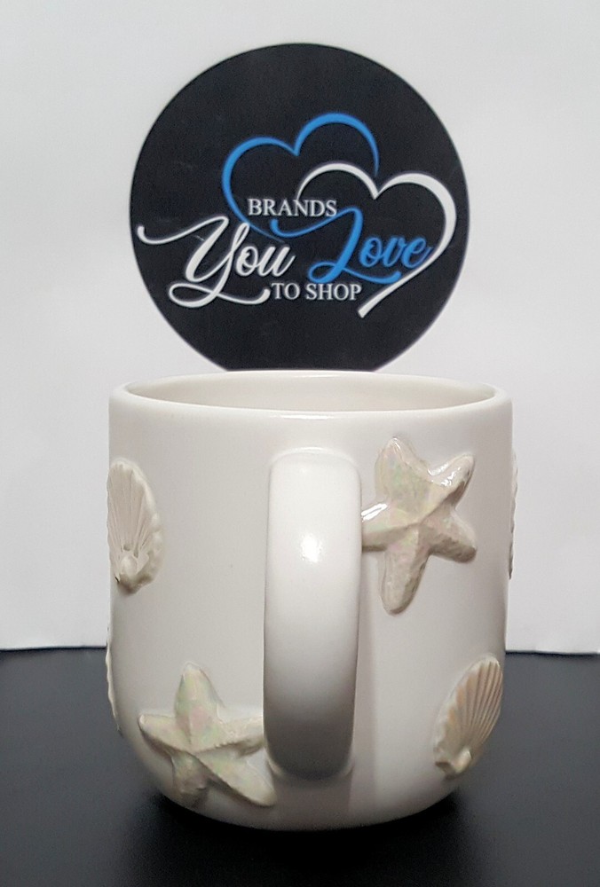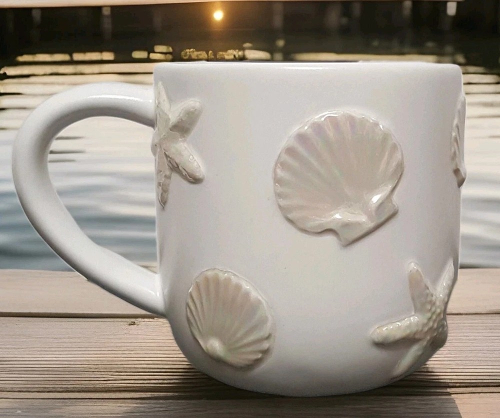 THESE SOLD OUT QUICKLY AT POTTERY BARN. Bring out these gorgeous seashell mugs. Perfect for everyday use and guaranteed to impress. They are the perfect mug for any occasion. 1 Coffee Mug Handcrafted of stoneware with a hand painted Pearl glaze finish. Overall: 5.5" w x 3.5" d x 4" h Handle: 1.5" w x 0.5" d x 3" h Capacity: 17 oz Dishwasher, microwave and oven safe up to 425°.