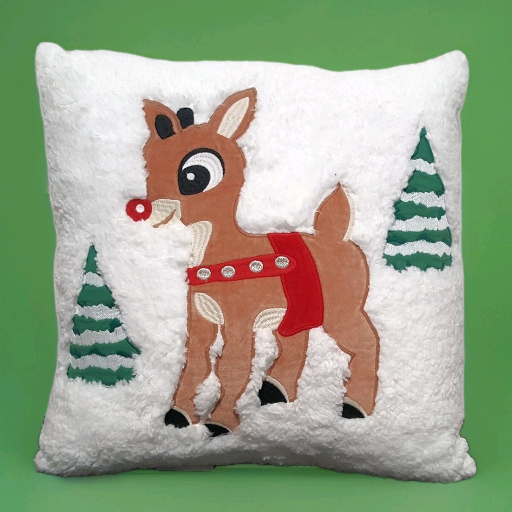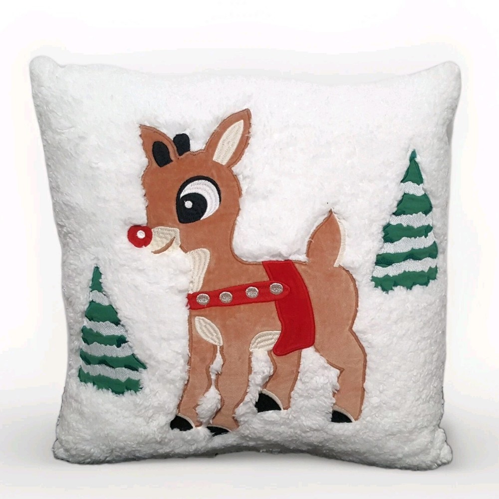 Top their bed or chair with a playful pillow featuring their favorite reindeer. A wintry applique of Christmas trees and Rudolph atop plush Sherpa that mimics snow delivers seasonal cheer. 16" x 16" This Rudolph decorative Pillow is made from 100% poly Sherpa; reverses solid 100% cotton sheeting. Pillow is filled with 100% polyester batting and sewn shut. Insert cover is made of 100% polypropylene. Features satin stitch appliques on front of pillow. Spot clean