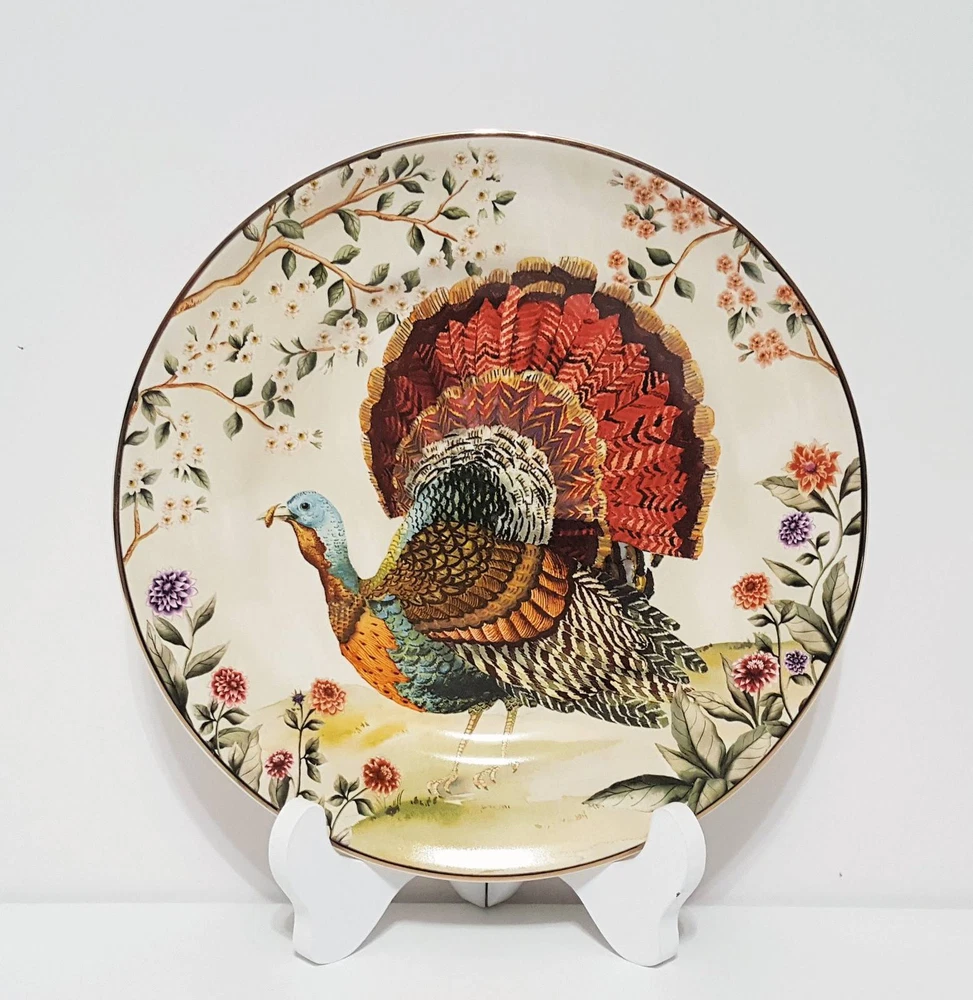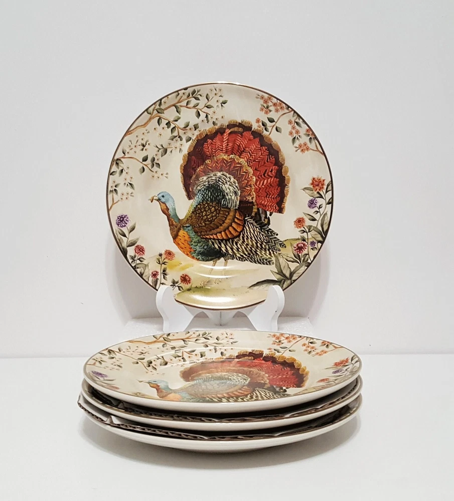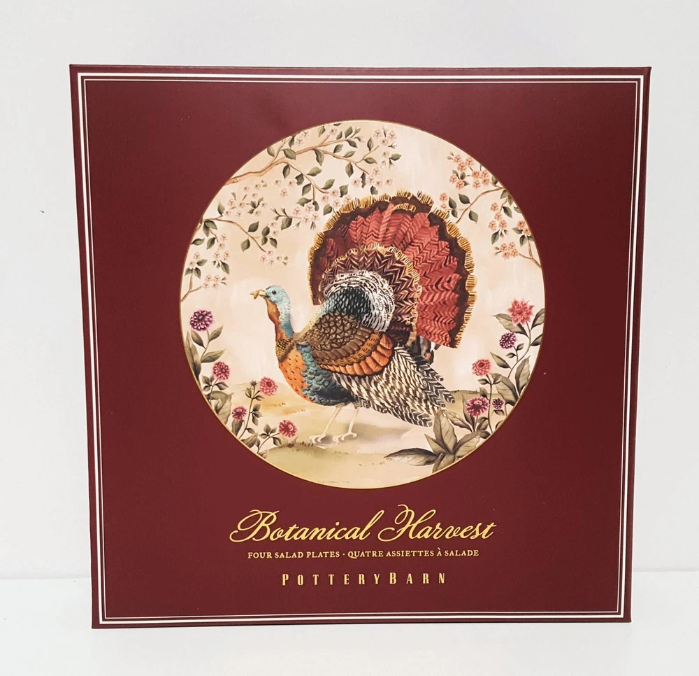 SOLD OUT AT POTTERY BARN This autumnal stoneware is as beautiful as the fowl that inspired them. The original design is painted where a vivid blend of colors come together in realistic detail. A gold rim finishes the look for an elevated feel. Even better, it’s dishwasher safe and designed to last. Made of 100% stoneware. Gold rim detail. Set of 4. Food, dishwasher and microwave safe. Overall: 8.5" diam