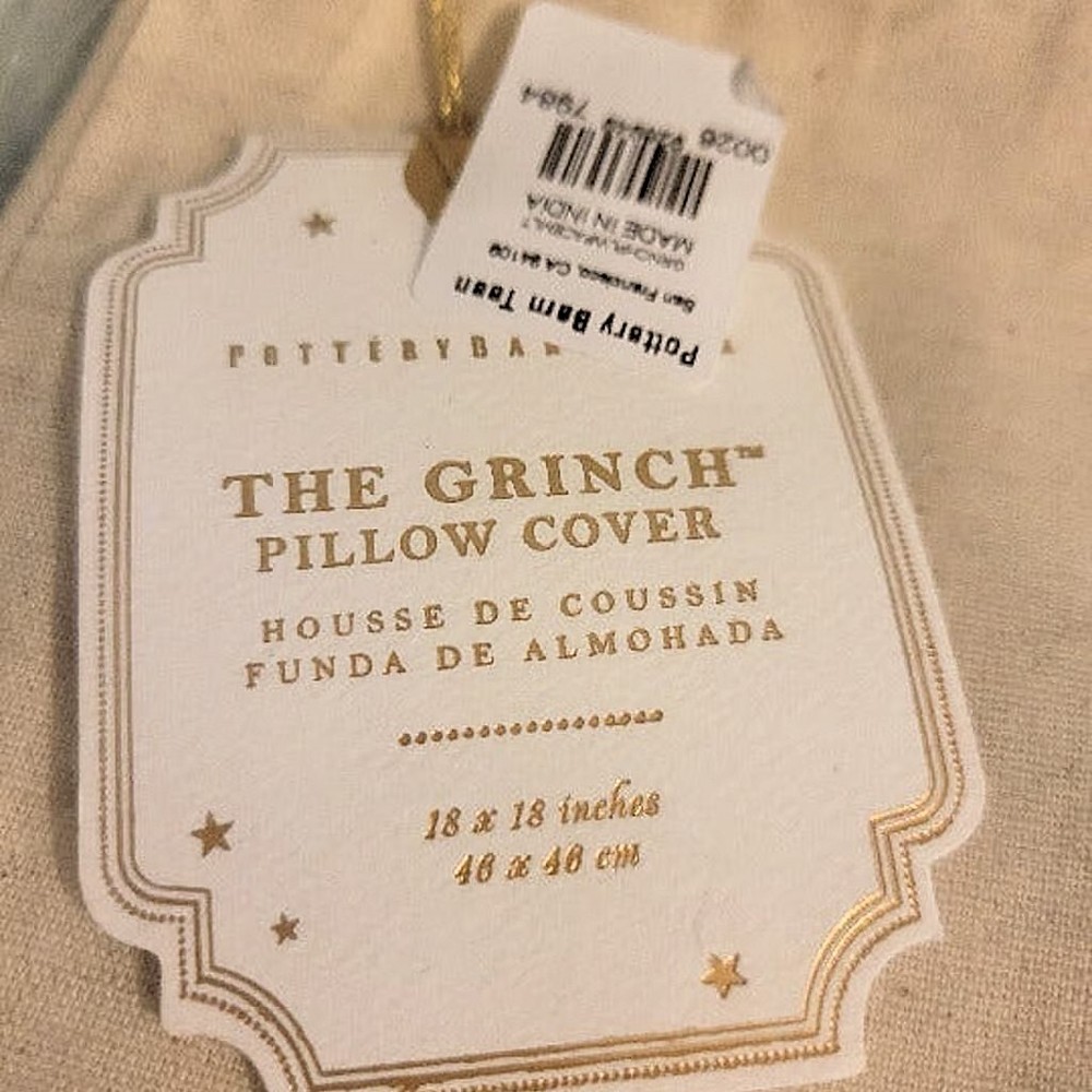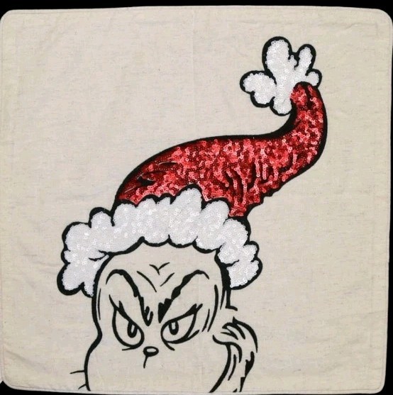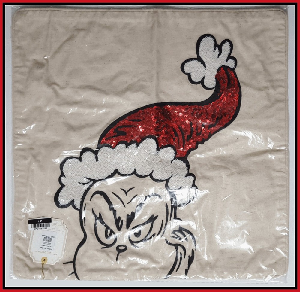 Mr. Grinch, along with a beloved quote from the heartwarming tale by Dr. Seuss, sparkles in sequins. pillow cover only Made of a cotton/linen blend. Features sequin designs. Reverses to solid cotton/linen. Insert sold separately (not included). Zipper closure. Spot clean only. Grinch Face: 18" square Spot clean only with a damp white cloth. Blot to remove excess water. Air dry. .
