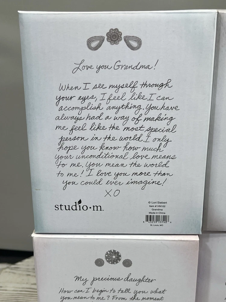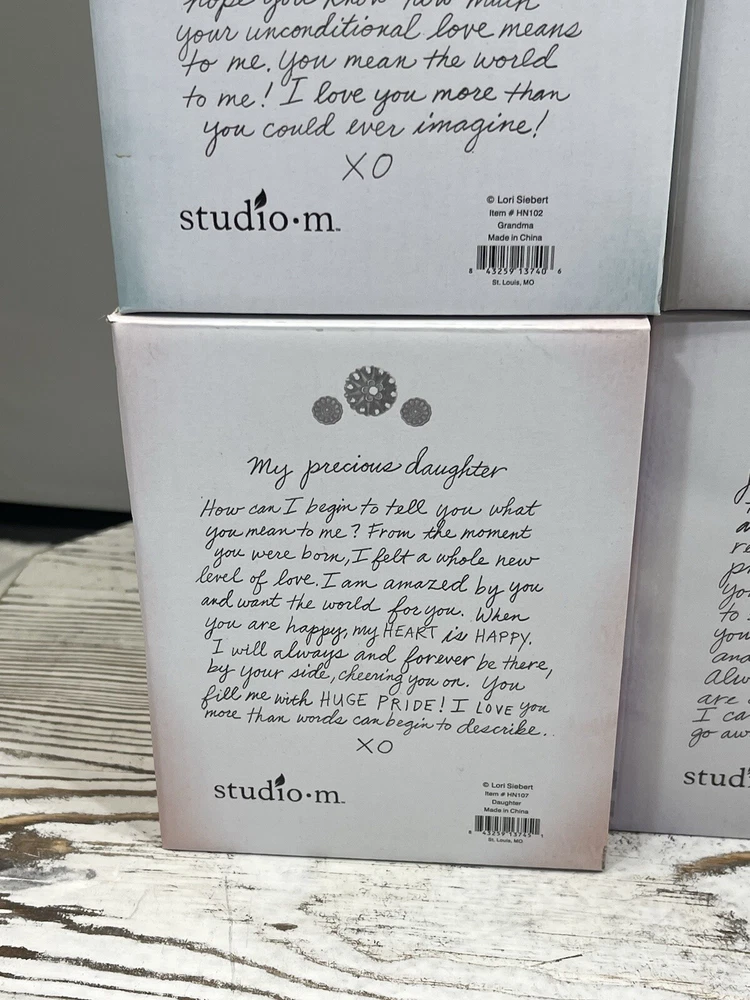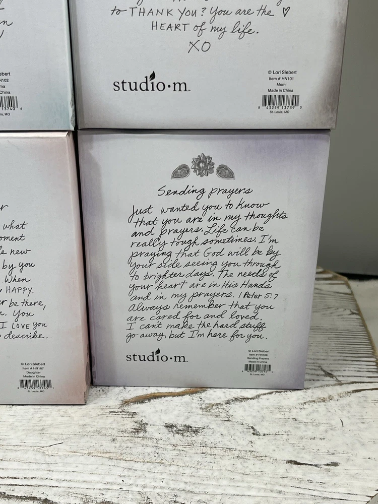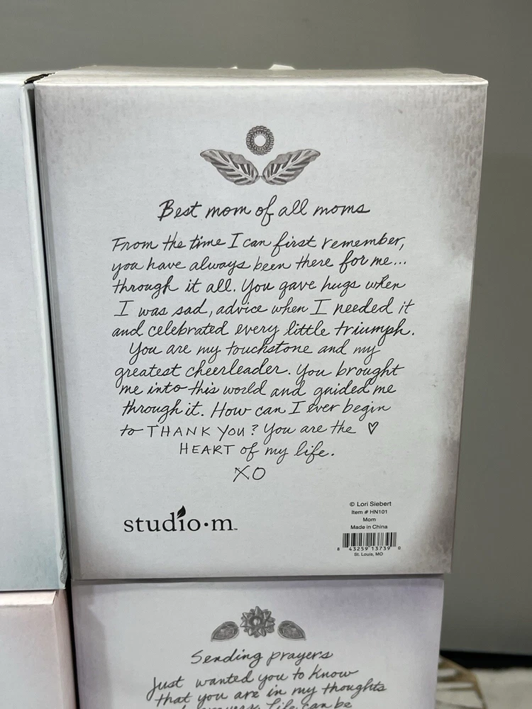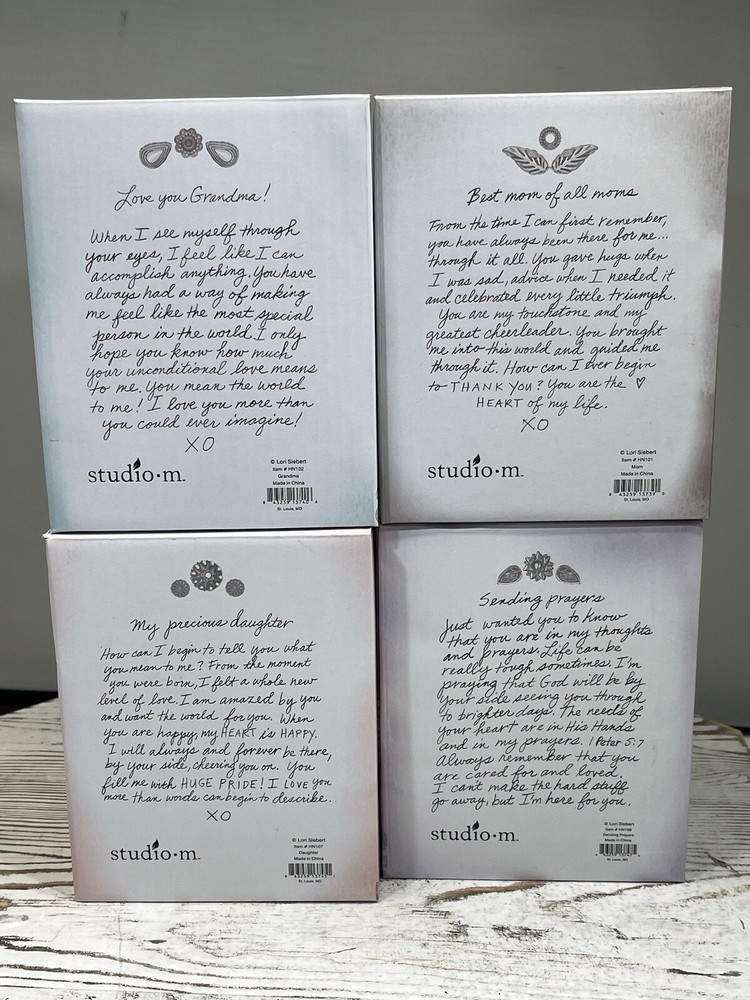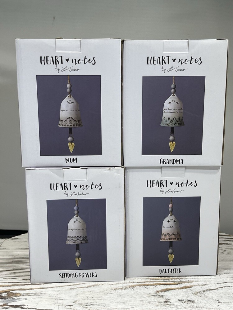 NEW Set (4) Studio M Heart Notes Lori Siebert Mom, Daughter, Grandma, Pray Bells Includes Heart Notes Bells for: New in the Box Mom Daughter, Grandma Sending Prayers See Pictures for More Details and Condition Check out my other listings at my user ID - ma_4128 If it is for an Auction start price is at min. price accepted with no reserves after. There is always a offer option available until first bid is placed. There is a min. buy now price that will be accepted it is already set. Please review all information in the description and in the pictures. Most of our items are found in purchased storage units and are mostly one-of-a-kind items. You will receive the item in the photos. We do not know the history of any of all the items we sell. We try to describe the item to the best of our knowledge. Final assumption of products condition must be made by the buyer's review and research of the item for sale. Please refer to the description on if an item was tested and how. Please feel free to ask any questions before bidding or purchasing an item. All our items are sold in "as in condition" and we do not accept returns. Once an item has shipped it may not be returned. Happy Bidding or Purchasing. Thanks in Advance. We Always Send Out Reviews Once Item is Delivered.