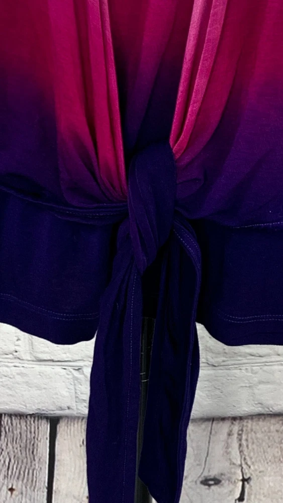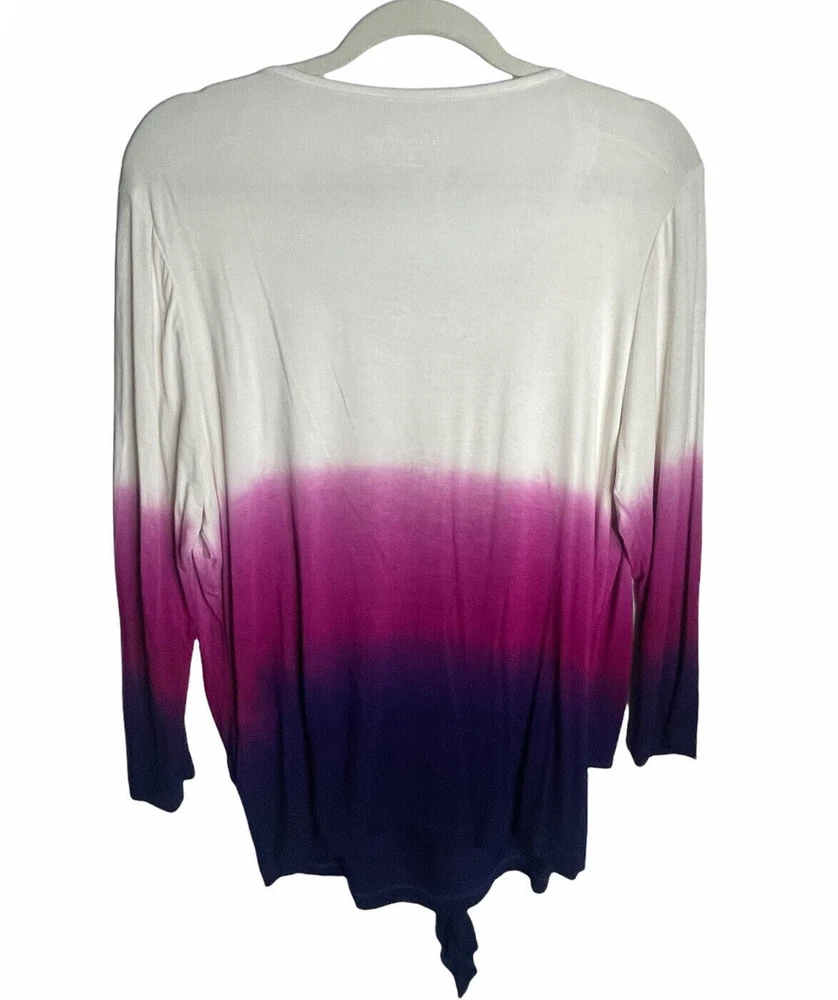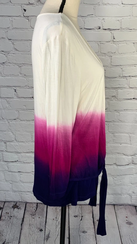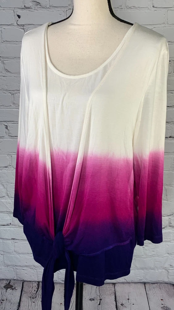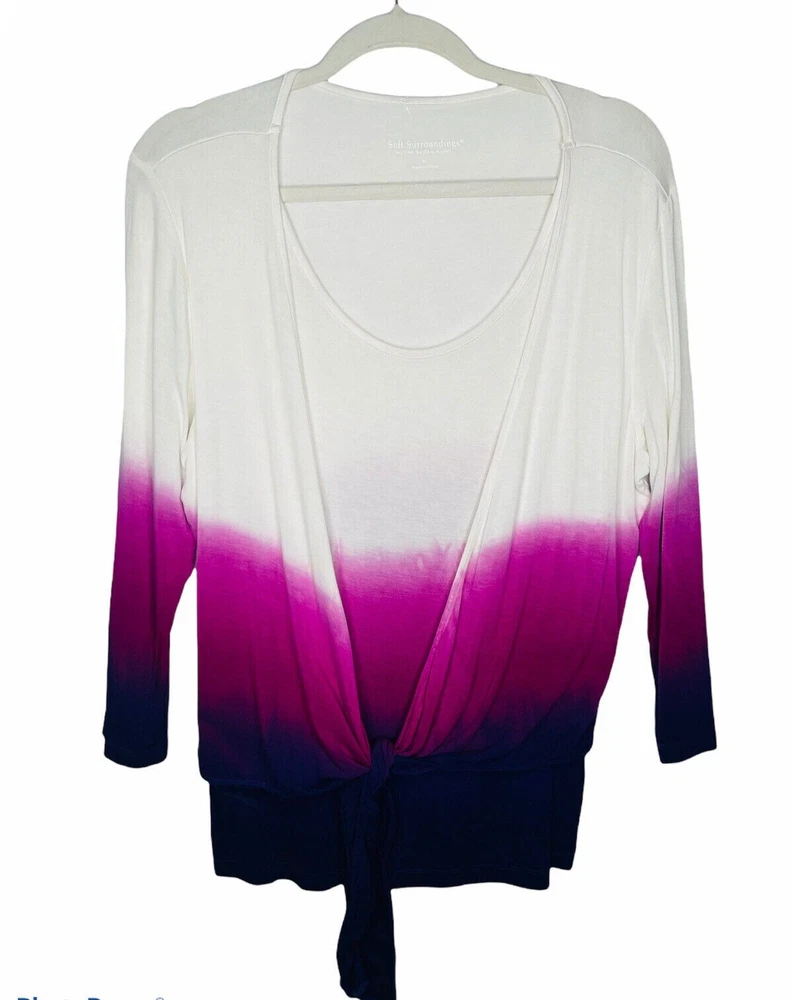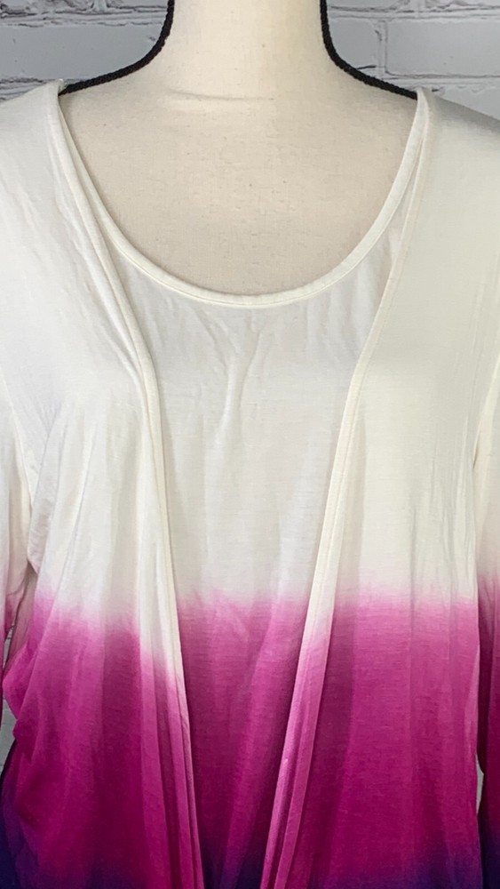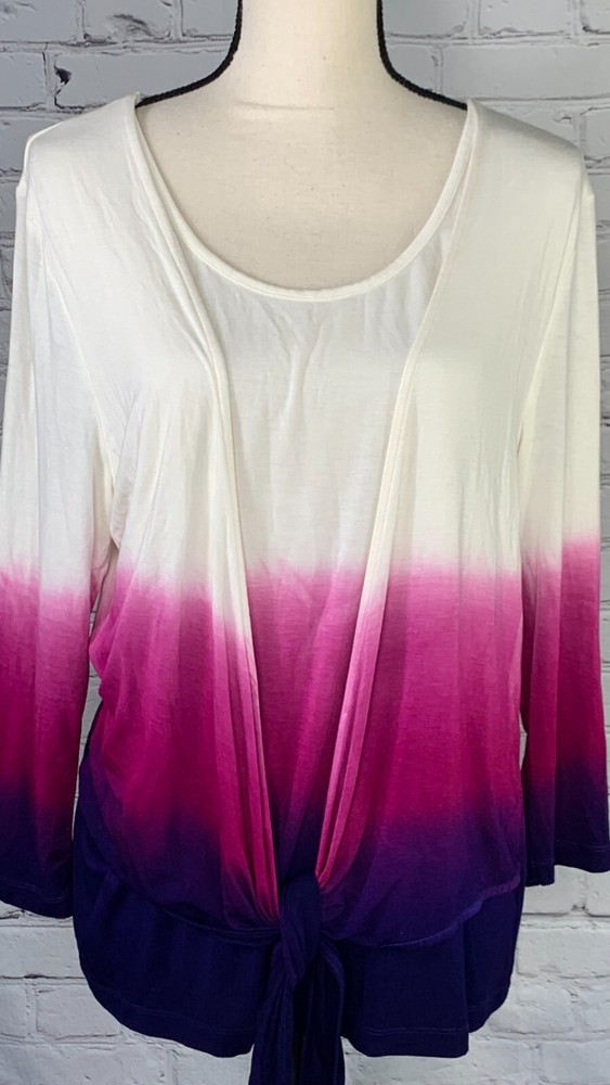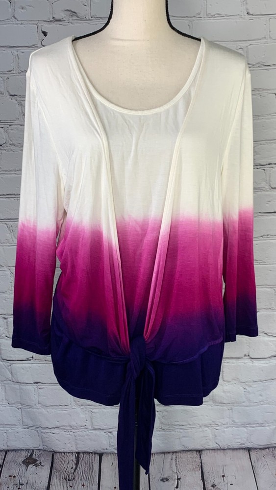 NWOT Soft Surroundings Women's Ivory with Purple Ombre, 3/4 Sleeve Tie-Front Cardigan Top,Size Large. New.Excellent Ivory with purple ombre, dip dyed Looks like a 2 piece set, attached scoop neck top Tie-front cardigan Soft, stretch fabric Approximate flat measurements ( not stretched) 22 in armpit to armpit 27 in length ( from top of shoulder) 20 in sleeve length 18 in Shoulders Item Tu/T 7 ( Bg 7)