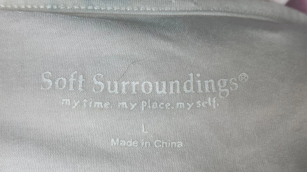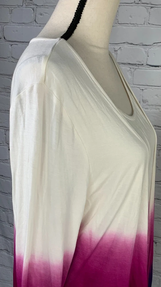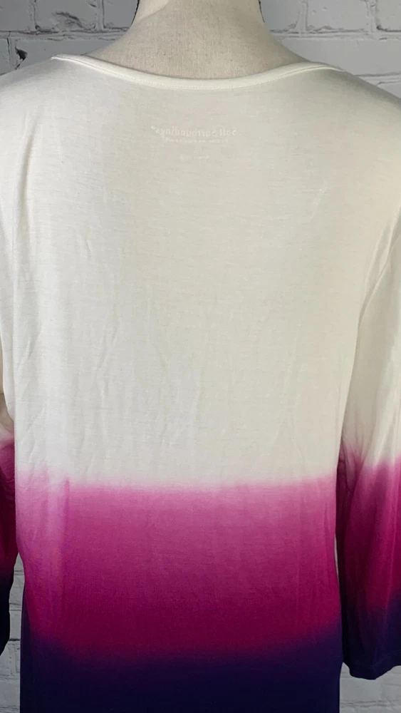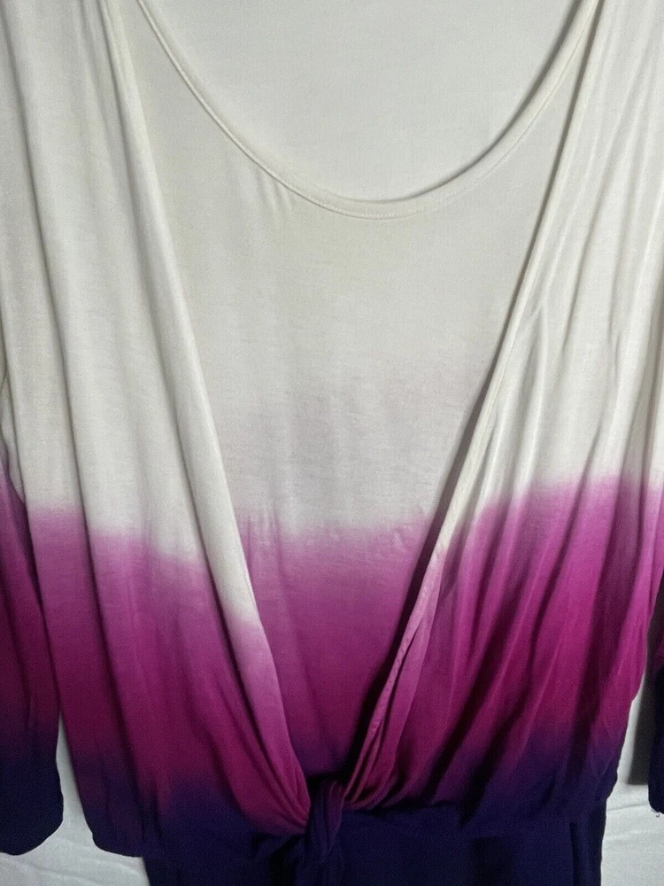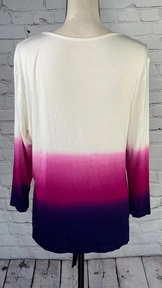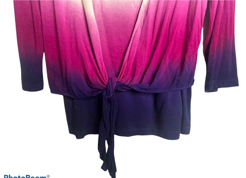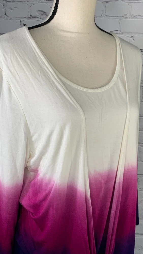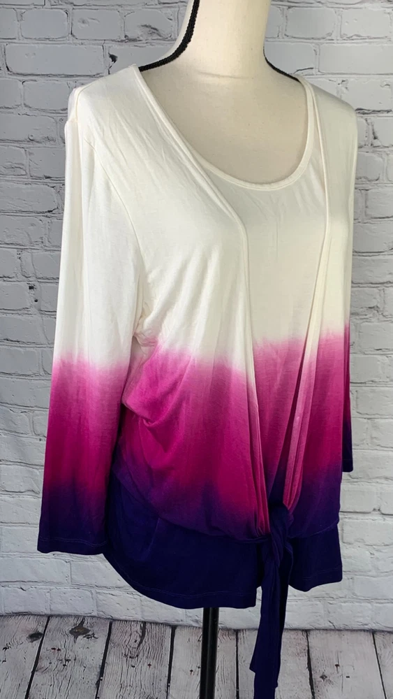 NWOT Soft Surroundings Women's Ivory with Purple Ombre, 3/4 Sleeve Tie-Front Cardigan Top,Size Large. New.Excellent Ivory with purple ombre, dip dyed Looks like a 2 piece set, attached scoop neck top Tie-front cardigan Soft, stretch fabric Approximate flat measurements ( not stretched) 22 in armpit to armpit 27 in length ( from top of shoulder) 20 in sleeve length 18 in Shoulders Item Tu/T 7 ( Bg 7)