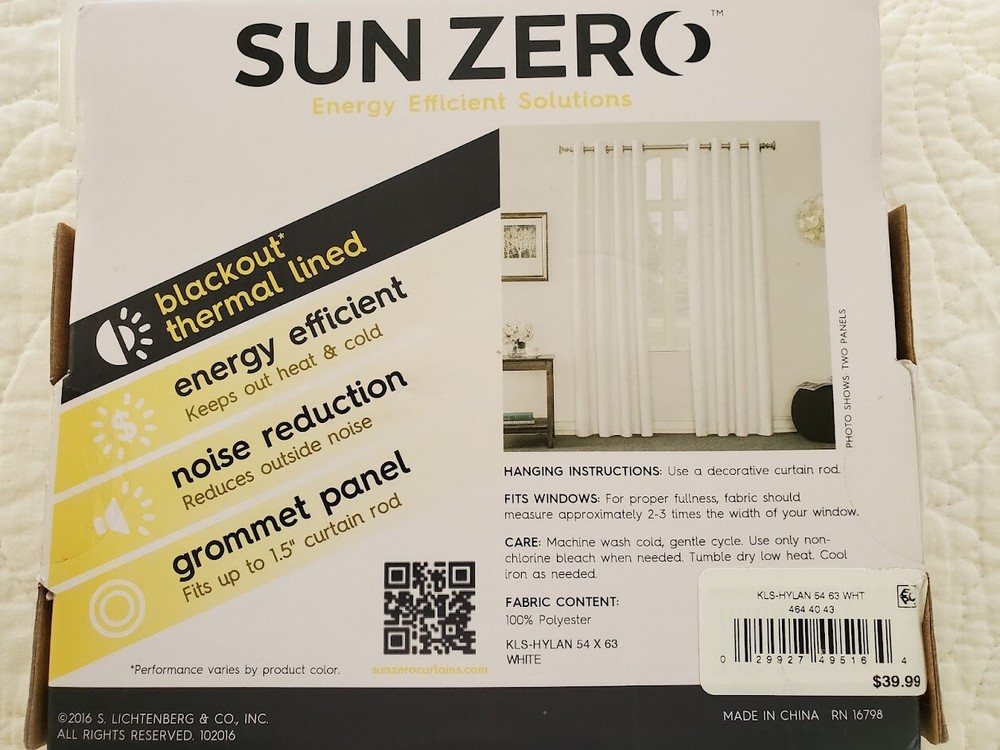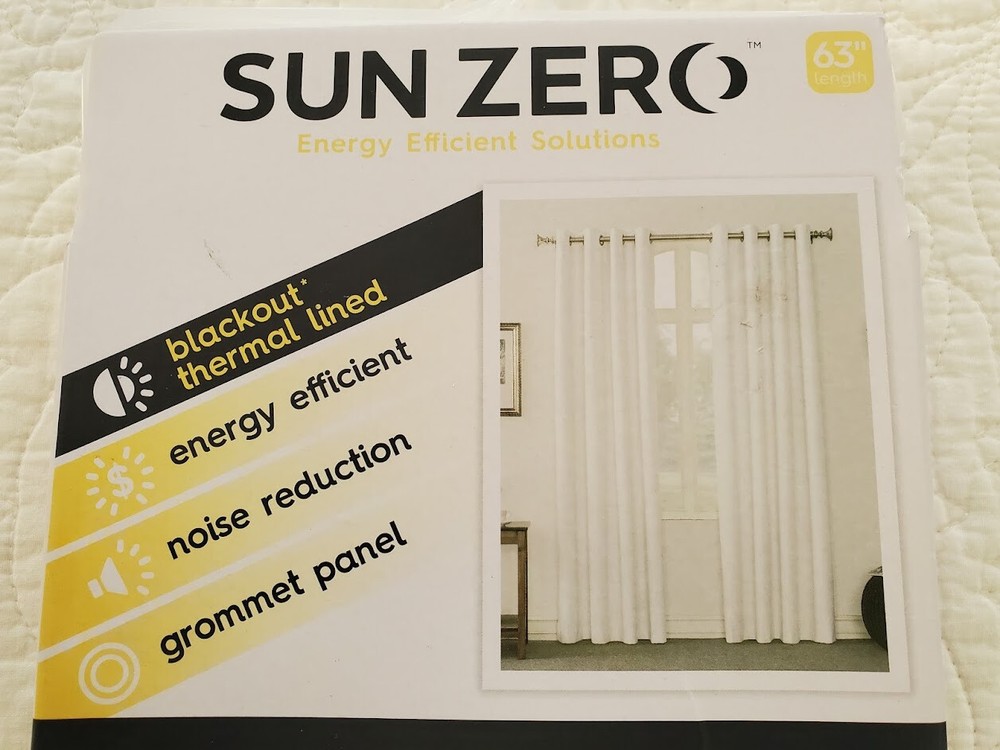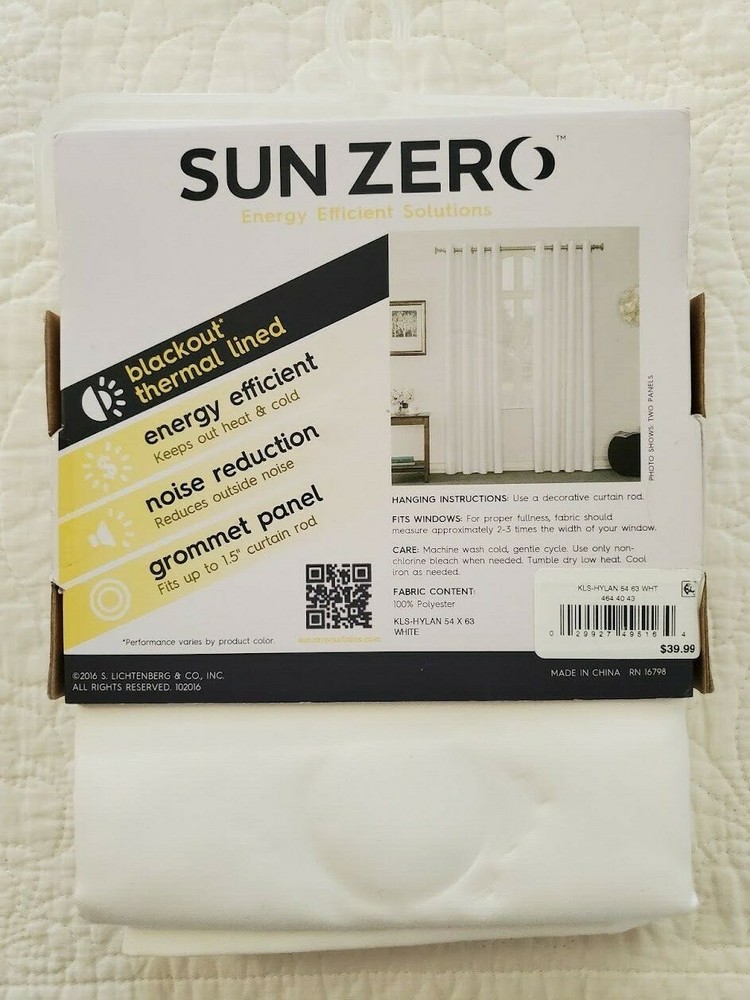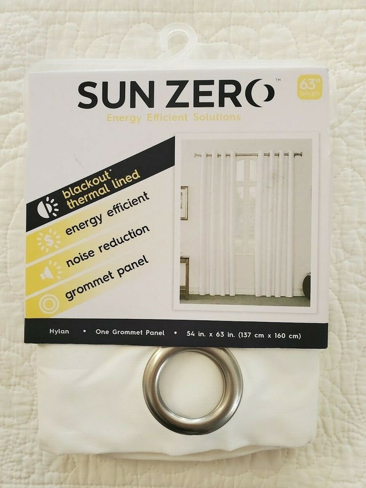 NEW Sun Zero Blackout Thermal Lined Window Panel. New in Package. One Panel. Size 54 inches x 63 inches. Color is White, Style is Hylan. 100% Polyester. Grommet Panel, Energy Efficient, Noise Reduction, Machine Washable. Please see Photos. Thanks for Looking! UB12