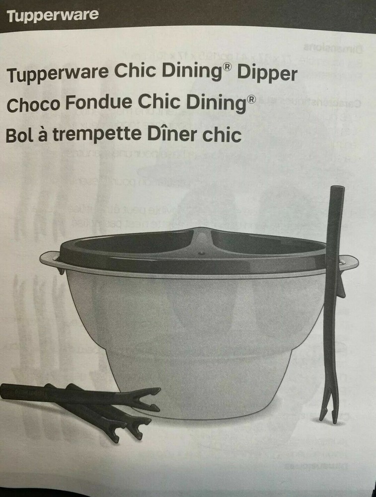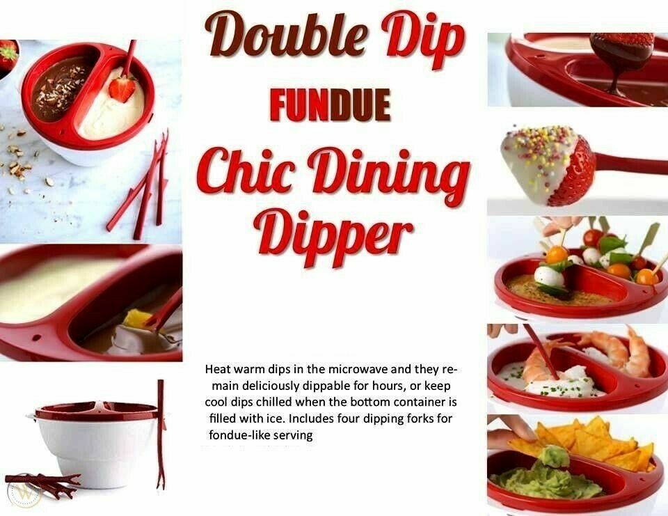 Tupperware Fondue Set Micro Deli Dip Microwave Chic Dining Dipper w/ 4 Forks Red NEW!! TUPPERWARE MICRO CHICK DINING DIPPER WARM OR CHILLED DIP BOWL !!!. New Red Tupperware Micro Chic Dining Dipper Warm or Chilled Dip Bowl. Heat warm dips in the microwave when water is added to the base and they remain deliciously dippable for hours, or keep cool dips chilled when the bottom container is filled with ice. Heat warm dips in the microwave edge between dipping Dishwasher safe BPA FREE.